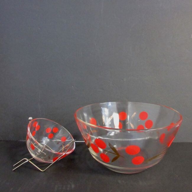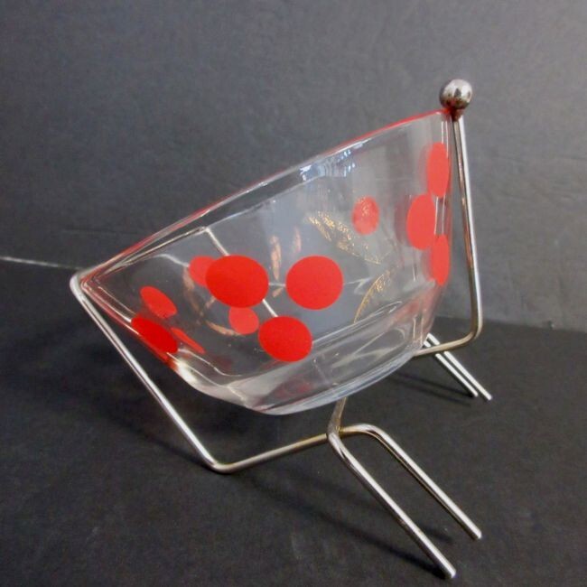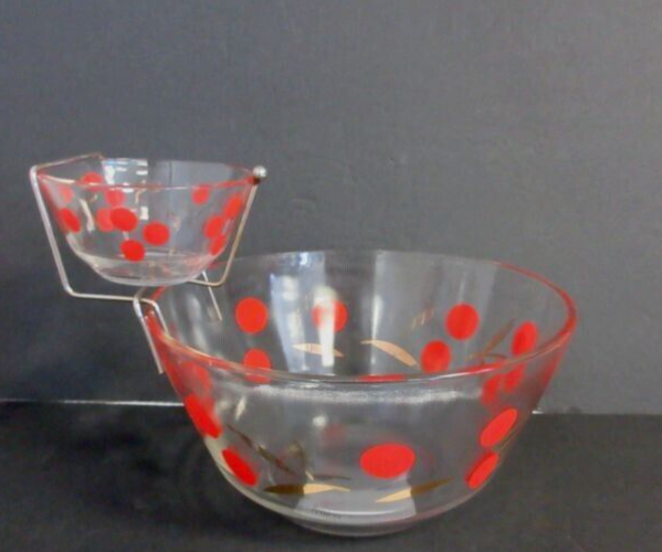 Vintage Large Red Dot Chip And Dip set - gold bracket MCM see the photos for best description of condition, shows well - large bowl measures 9 3/4" diameter by 5" deep - smaller dip bowl fits into the metal frame and hangs on the bowl - some of the gold pattern is worn off thanks for taking a look at my item! there are lots more interesting items available in my shop and I can combine shipping to save you money.