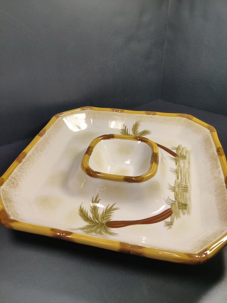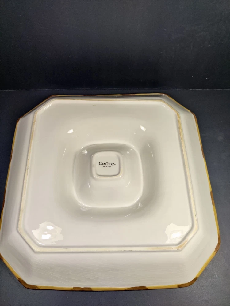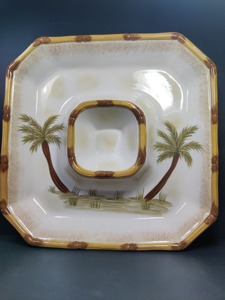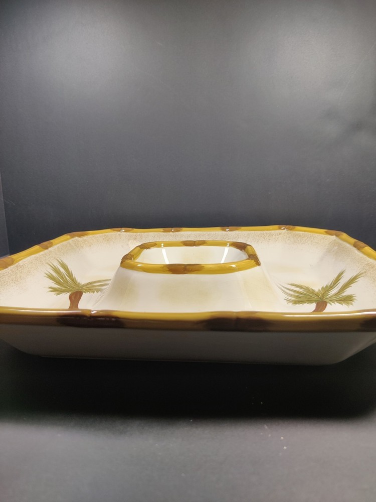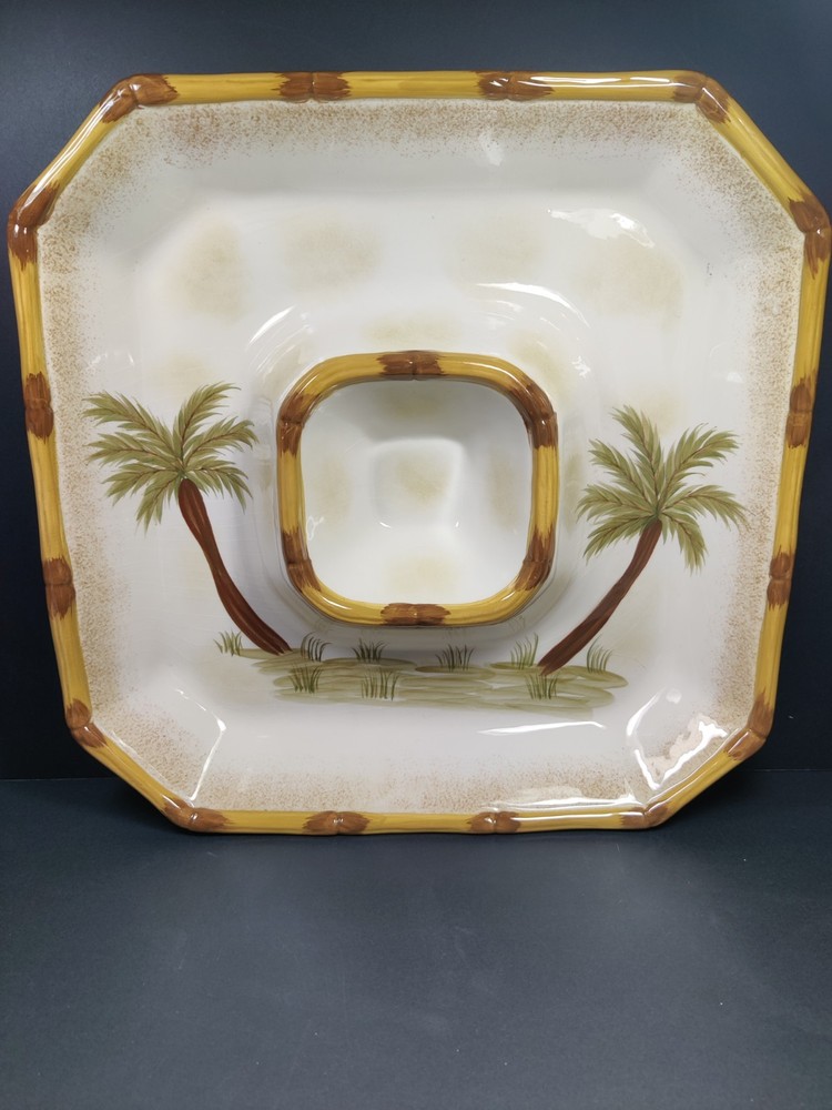 Add a touch of vintage glamour to your next party with this stunning square Century ceramic chip and dip platter. The platter features a beautiful palm tree pattern and measures 13 1/2" in length and width, making it perfect for serving appetizers and snacks. The glossy finish and decorative features make it a great addition to any mid-century modern or art pottery collection. This original piece was manufactured in California in the 1980s and is in excellent condition. It is an ideal piece for those who love vintage pottery and want to add a unique touch to their home decor. The platter is printed with a backstamp and is a great example of mid-century modern style.