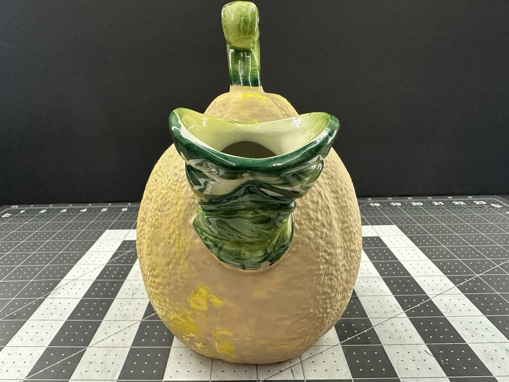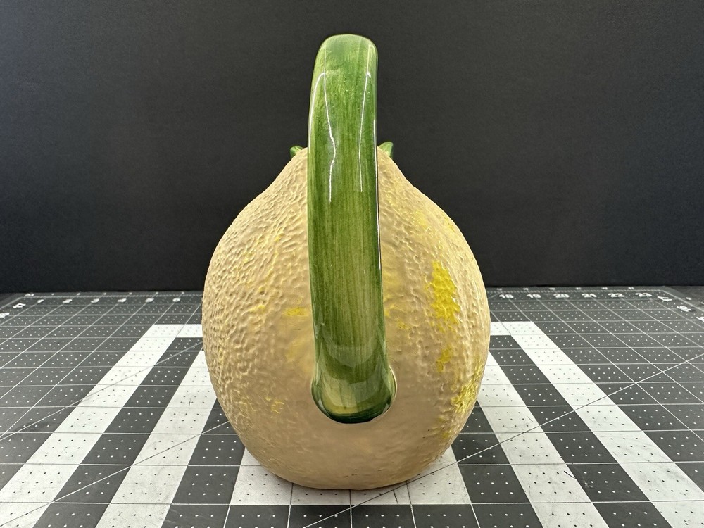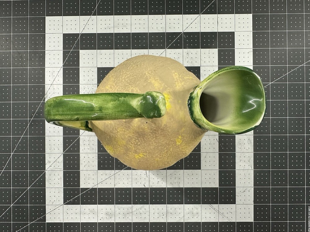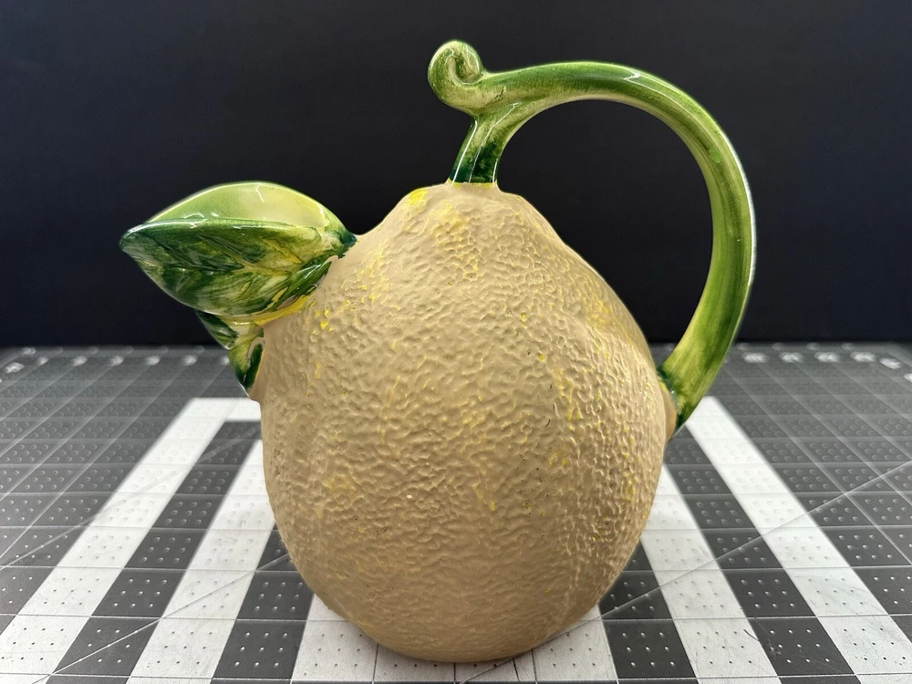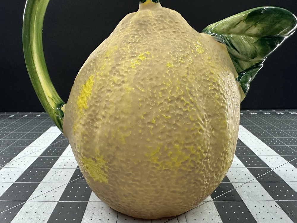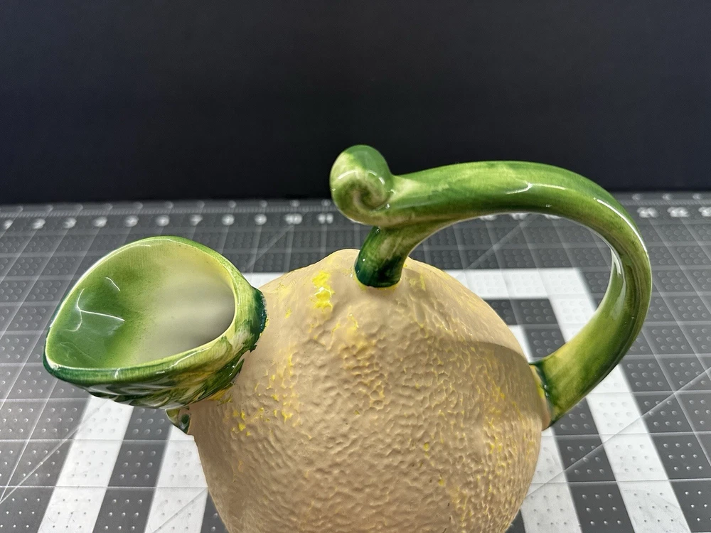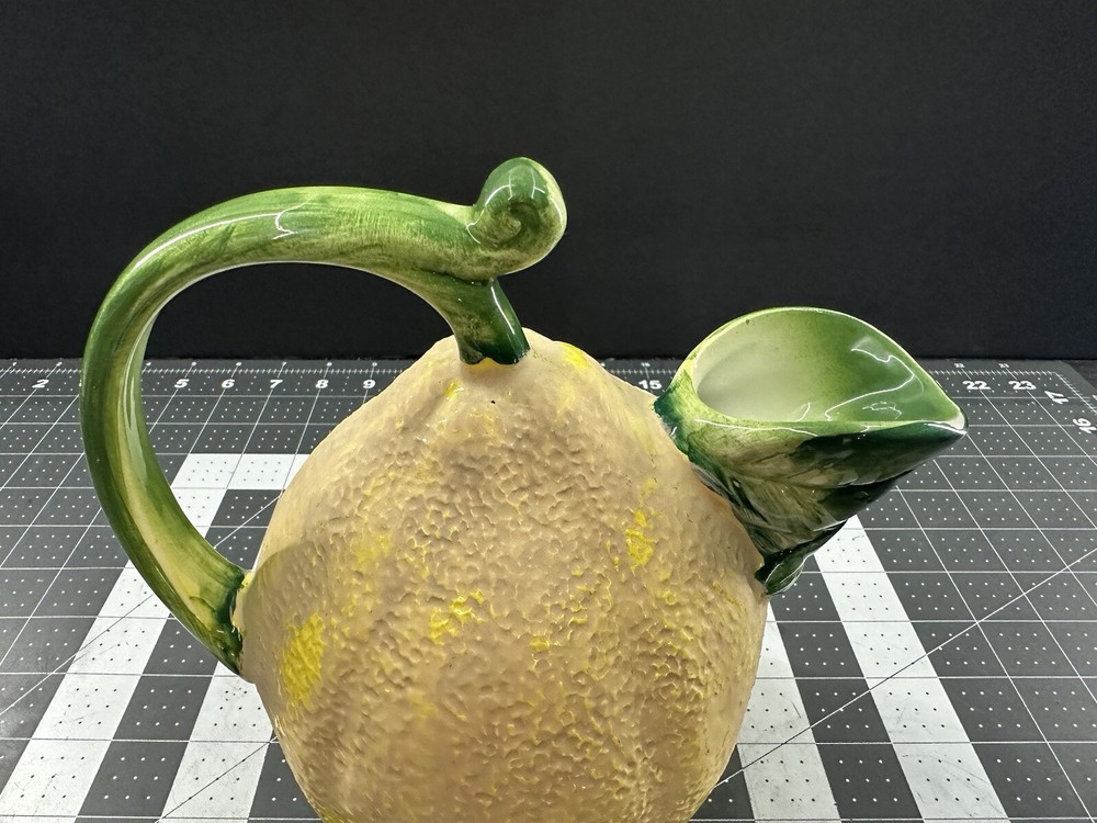 NOTE: SMALL CHIP THAT HAS BEEN FILLED IN WITH COLOR ON HANDLE. This vintage lemon-shaped lemonade pitcher is a unique addition to any collection. Made in Italy by Studio Pottery, it features a charming lemon design that is sure to bring a smile to anyone's face. The pitcher is stamped with the Studio Pottery logo, adding to its authenticity and charm. Perfect for serving lemonade or any other refreshing beverage, this pitcher is a must-have for any collector of decorative cookware. Its unique design and high-quality construction make it a wonderful piece for displaying in any kitchen or dining room. Add this vintage lemonade pitcher to your collection today!
