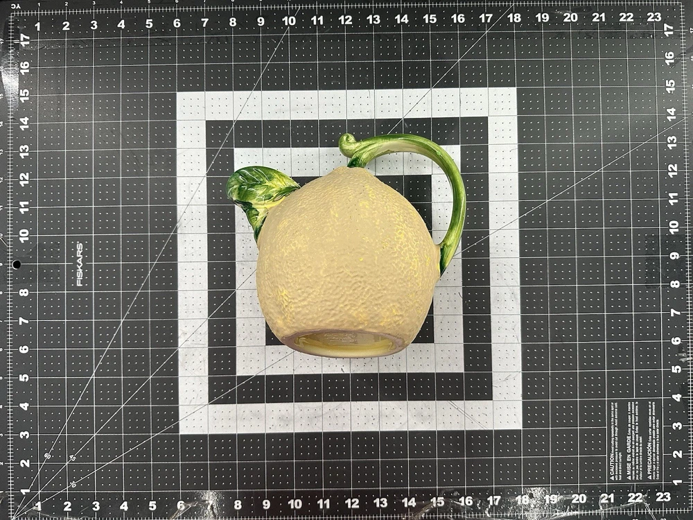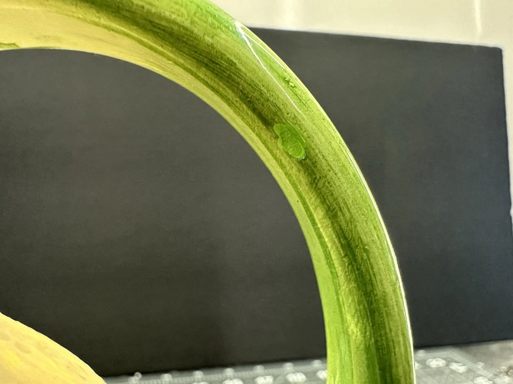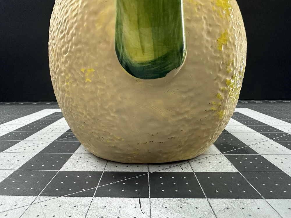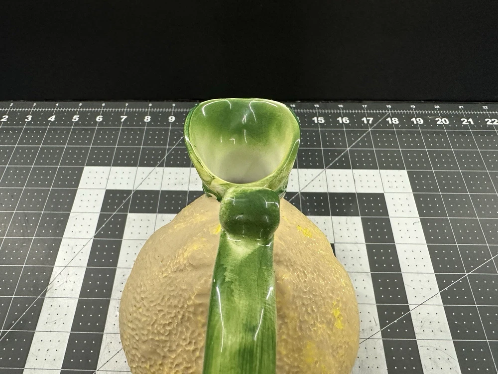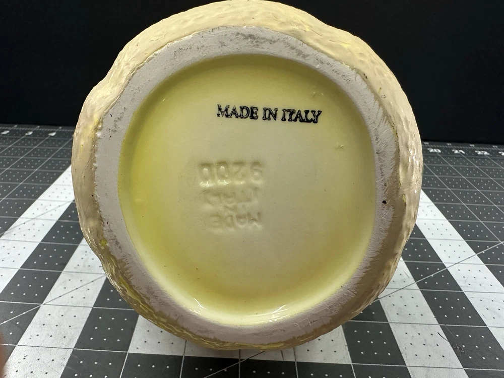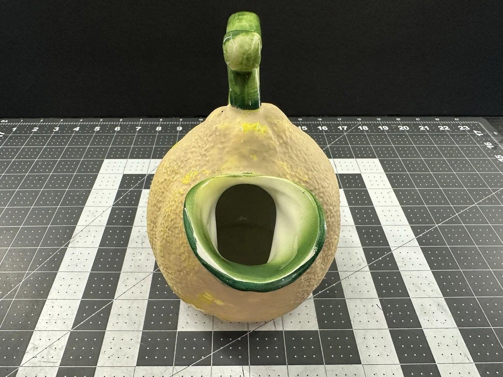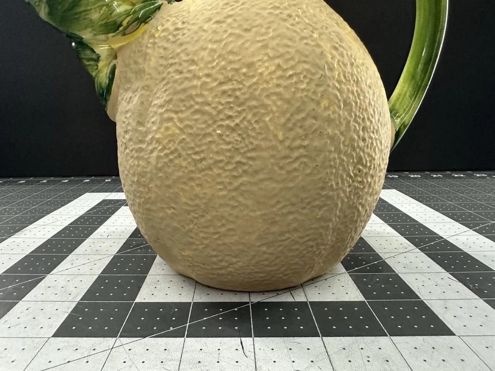 NOTE: SMALL CHIP THAT HAS BEEN FILLED IN WITH COLOR ON HANDLE. This vintage lemon-shaped lemonade pitcher is a unique addition to any collection. Made in Italy by Studio Pottery, it features a charming lemon design that is sure to bring a smile to anyone's face. The pitcher is stamped with the Studio Pottery logo, adding to its authenticity and charm. Perfect for serving lemonade or any other refreshing beverage, this pitcher is a must-have for any collector of decorative cookware. Its unique design and high-quality construction make it a wonderful piece for displaying in any kitchen or dining room. Add this vintage lemonade pitcher to your collection today!