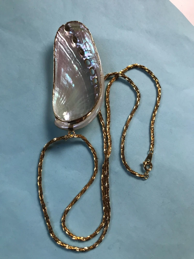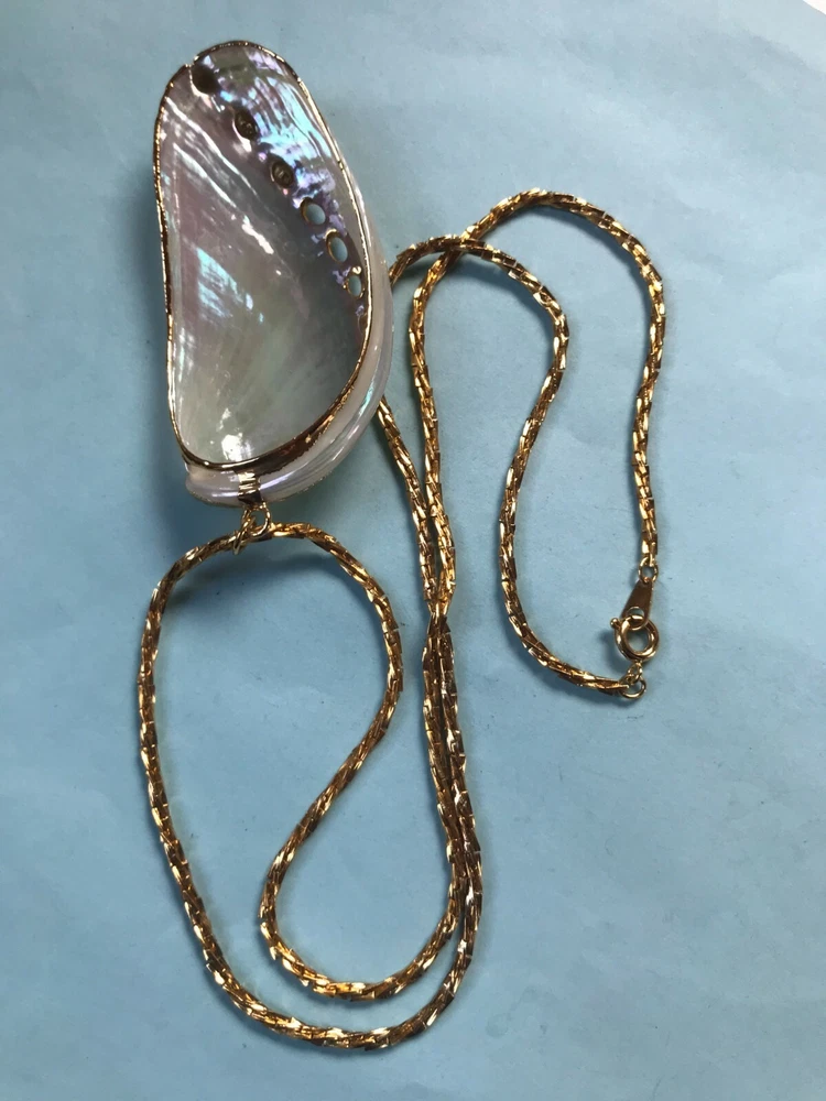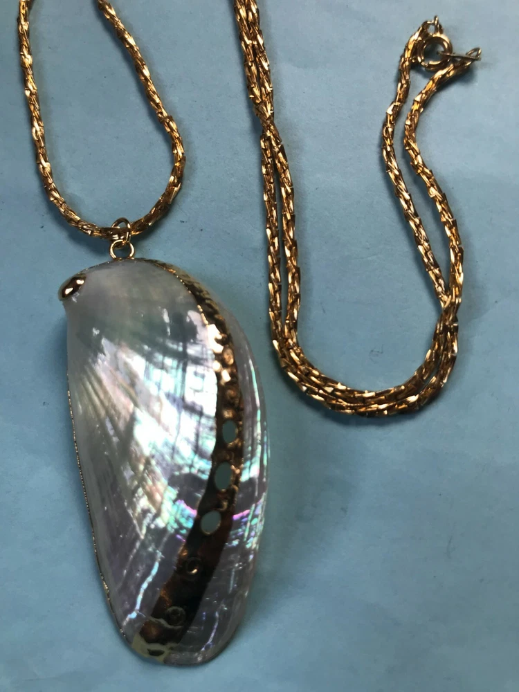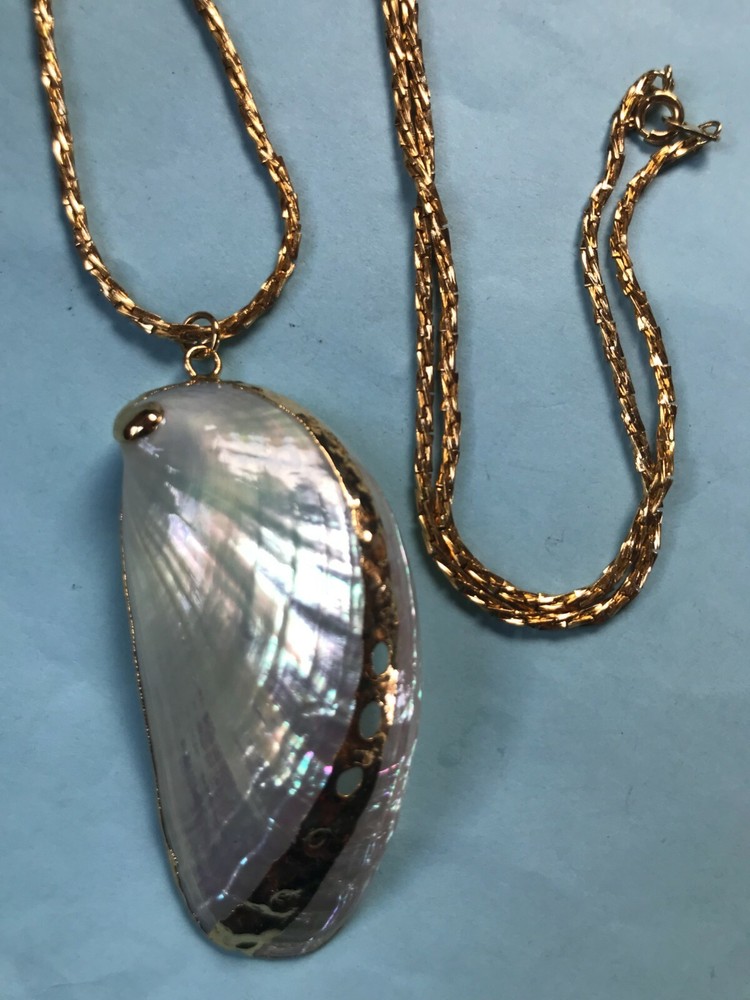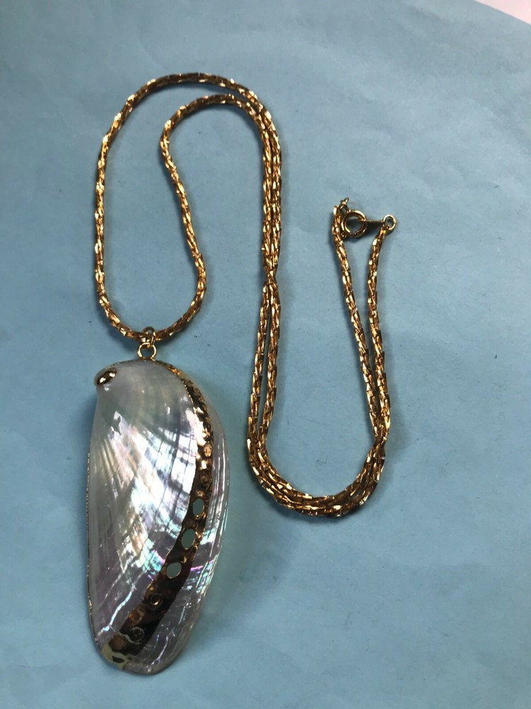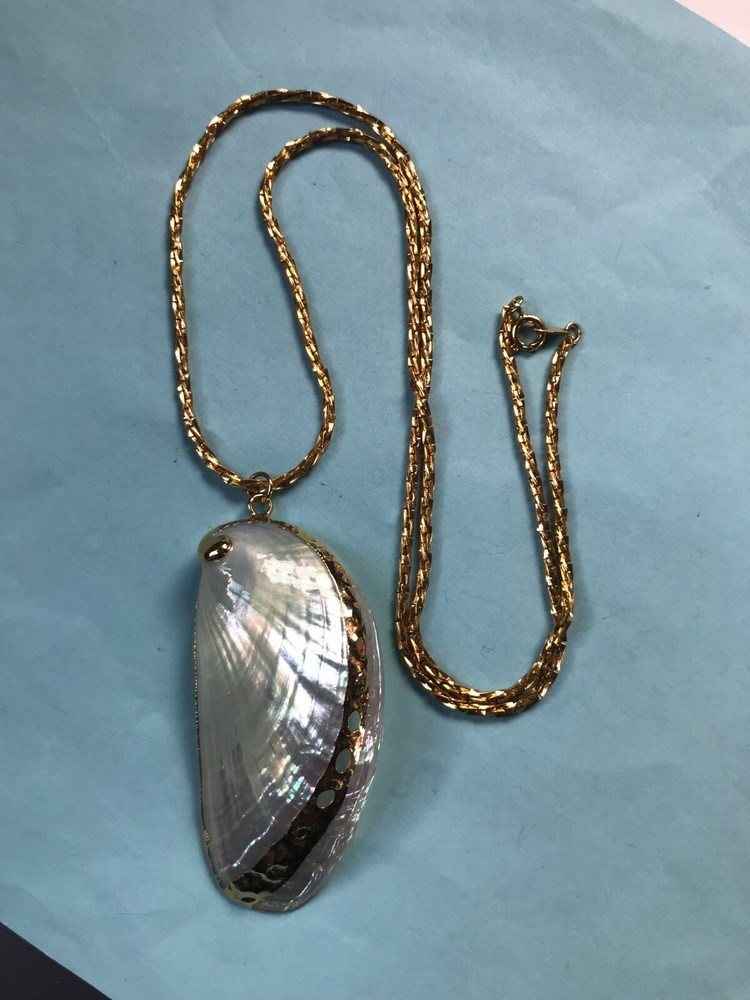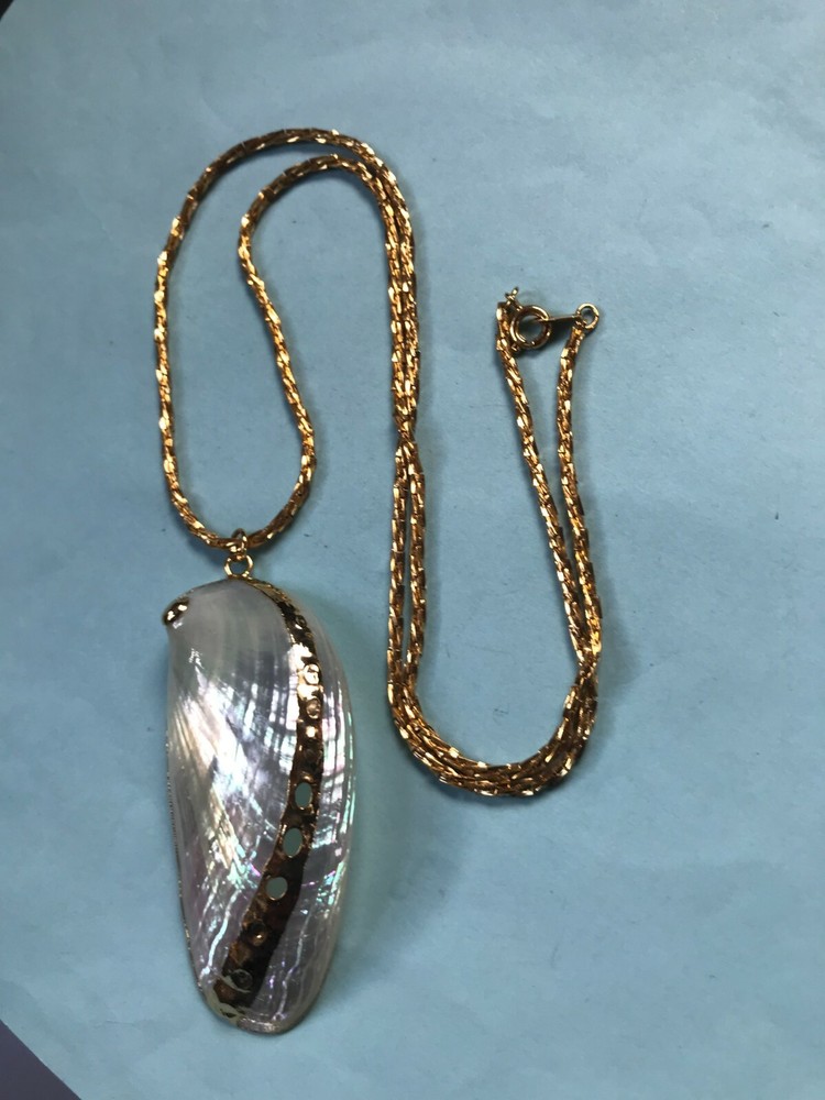 Vintage Long Twist Goldtone Chain w Large Gold-Dipped Polished Iridescent Clam Shell Pendant Necklace – chain is 24 inches in length – pendant is 2.75 x 1 and 1/8 th ’s inches – VERY GOOD condition – minor signs of wear – (Location – Brown Metal Rectangle w European River Picture) *************************************************************************************************************************************************************************************************** NOTE: I am selling these to make more room in our very small, cramped house. Unless I have made a very big mistake, there will be NO RETURNS. Please contact me if you find my descriptions in error and we will work out a deal agreeable to both parties. COMBINED SHIPPING: 1 win = price listed; 2 wins = 50% of lowest listed shipping price; 3 wins = additional $1.00; 4 WINS (in 7 days) = no additional charge on entire order; Combined Shipping includes AUCTION wins as well as STORE wins (Buy It Now). FREE shipping on combined shipping orders exceeding $100.00. FREE shipping for any 4 more Wins on book listings only (no other items in shipment). I will ship worldwide, however, additional shipping charges will apply. I will always attempt to use the cheapest route possible. If you need faster shipping, I will work with you, but you will need to pay the extra shipping charges. I will only be shipping once/week. BOOKS rated using the following scale: FINE – as new condition NEAR FINE – very minor edgewear or other hardly noticeable defect; gift inscription or previous owner’s name might be present or remainder mark; VERY GOOD – minor edgewear, cornerwear, maybe subtle writing or scribbling; remainder mark might be present; previous owner’s name or gift inscription might be present; subtle creases or wrinkles might be present; one or two very tiny tears; pages might be browning; GOOD – multiple condition issues – edgewear, cornerwear, writing or scribbling not affecting the text, creases or winkles, small tears, browning pages; FAIR – many condition problems but still a readable copy POOR – heavy damage but still readable; some books with neat illustrations might be sold with a few pages missing