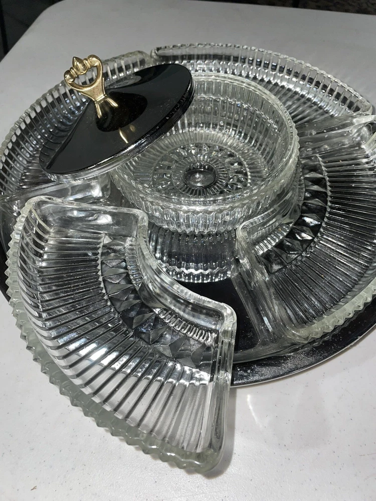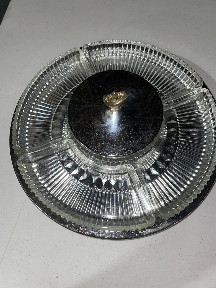 Vintage MCM Kromex Large Chrome Lazy Susan Appetizer/Dip/Relish/Desert Tray. Amazing condition. Kromex made in USA. Chrome serving dish with removable trays and lid. This vintage MCM Kromex lazy susan is a beautiful piece of history that will add charm to any kitchen or dining room. With a clear/silver color, this large chrome tray has five compartments and a lid, making it perfect for serving appetizers, dips, relishes, or desserts. The round shape and desert pattern give it an antique feel, and it is an original piece from the 1950s. The tray also features the Kromex brand and model name, Lazy Susan Appetizer, making it a unique and collectible item. It is perfect for vintage enthusiasts or anyone looking to add a touch of nostalgia to their home decor. Don't miss out on the opportunity to own this beautiful piece of history!