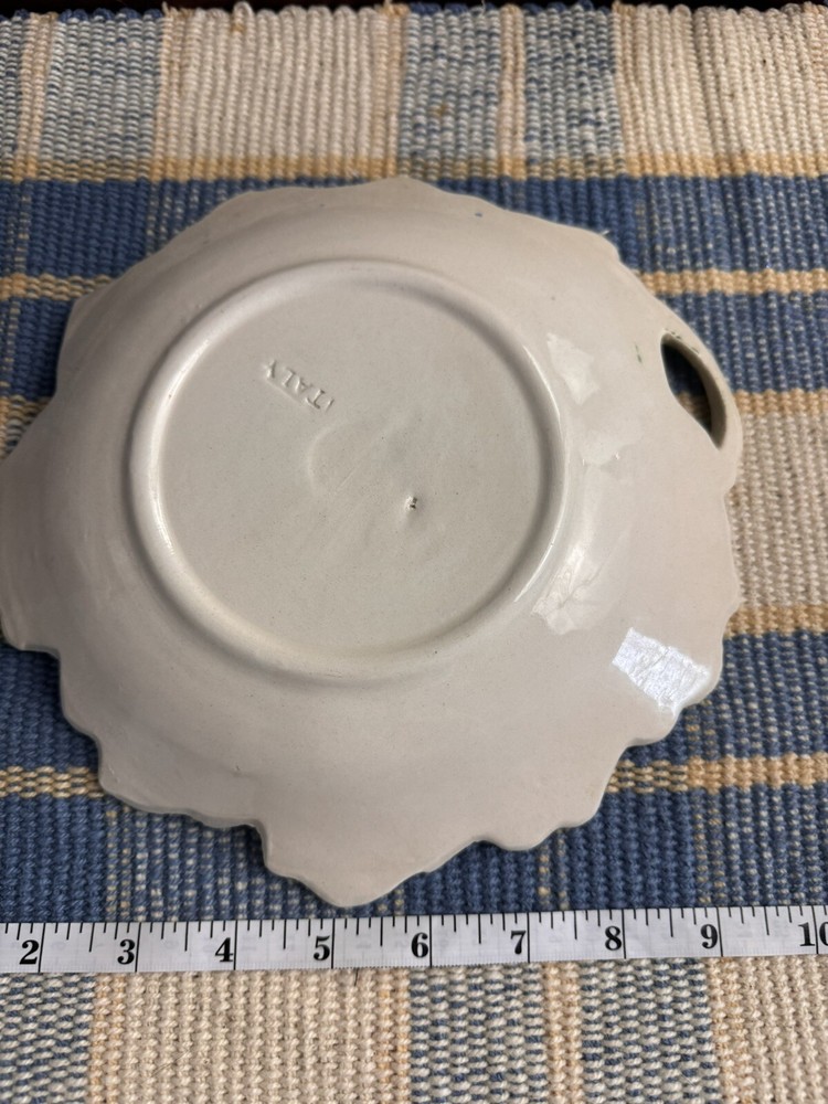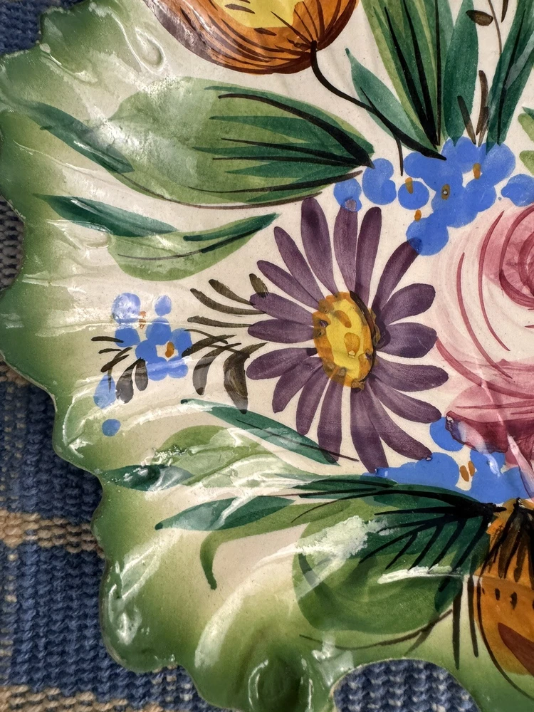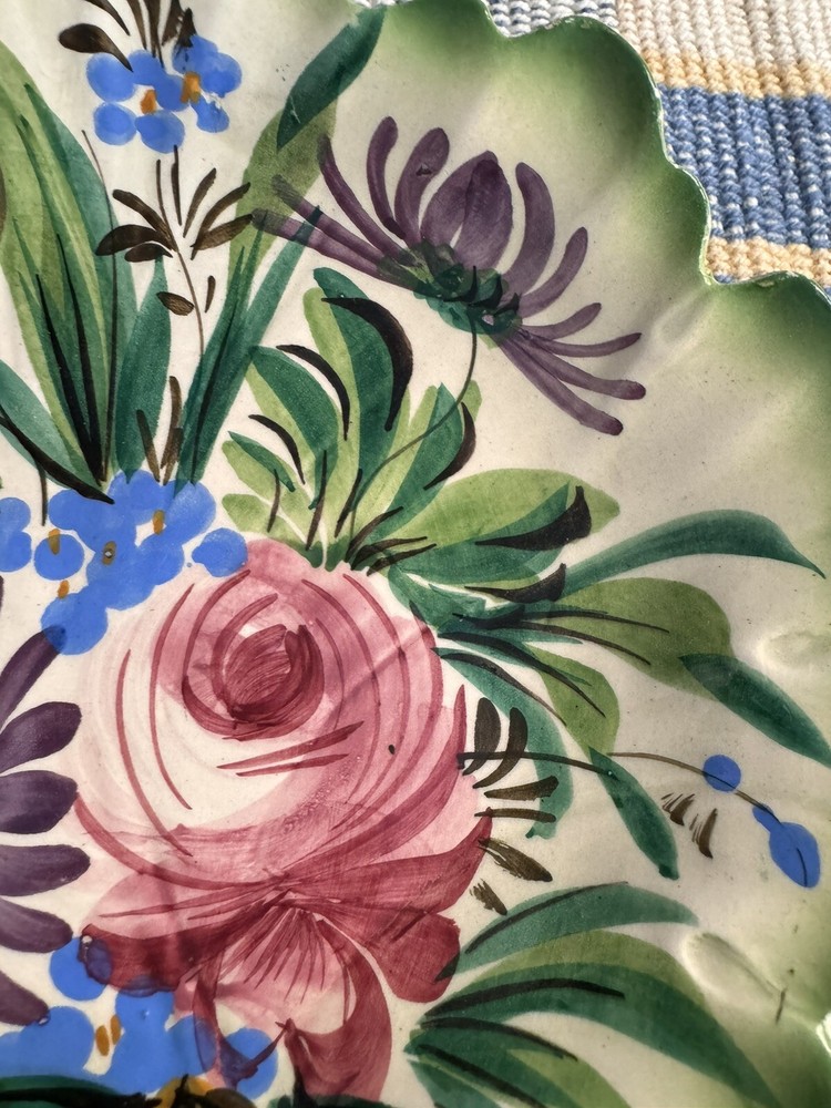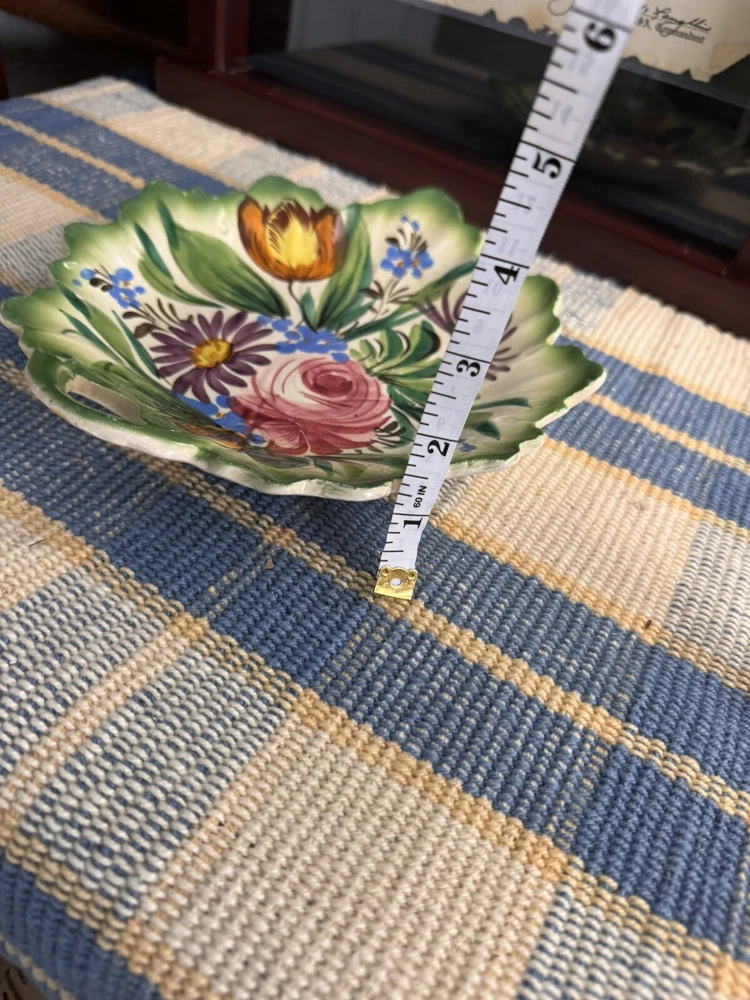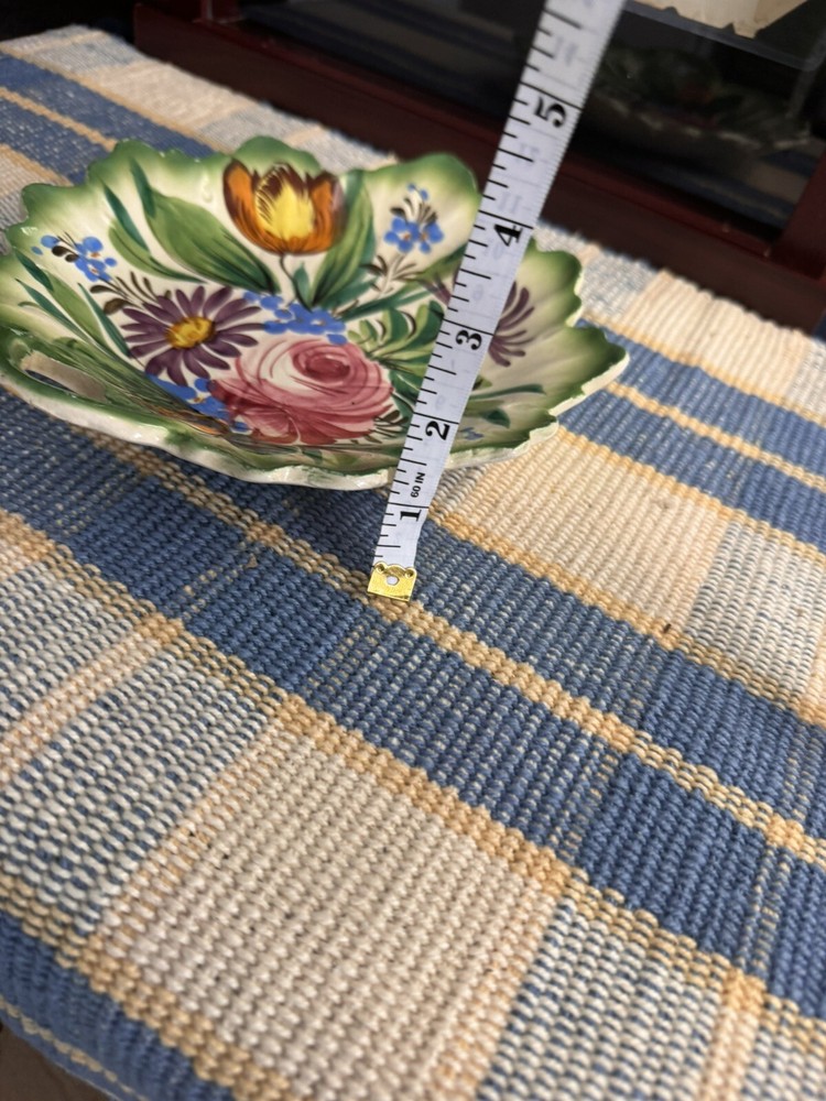 This beautiful vintage plate, hand painted in Italy by M&R, features a stunning rose design on leaf-shaped ceramic plate. The glossy finish and decorative features such as limited edition, stackable, and handmade production, make it a unique addition to any home decor. The plate is perfect for serving at special occasions like baby showers or as a decorative piece in the kitchen or dining room.