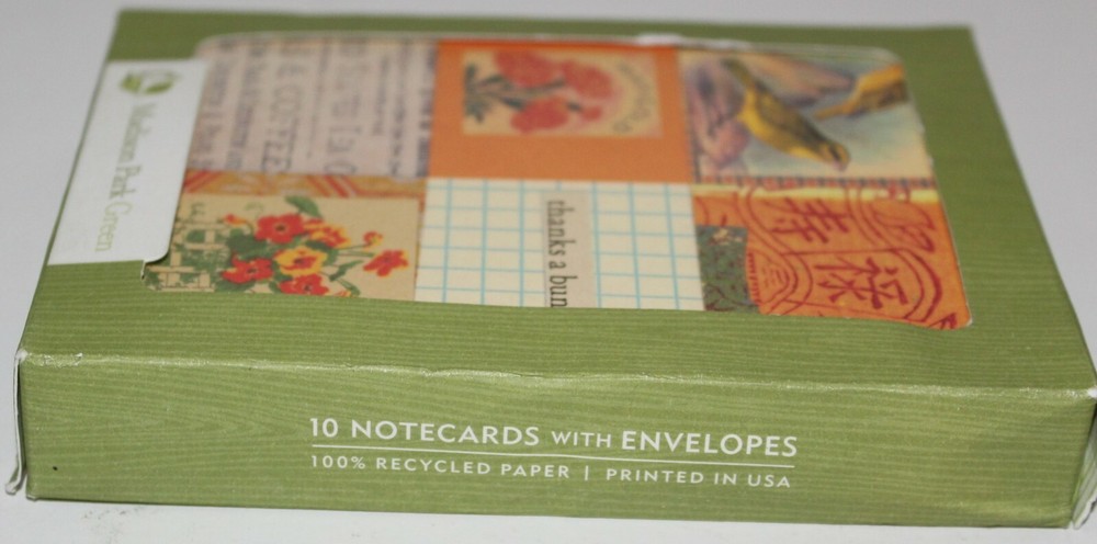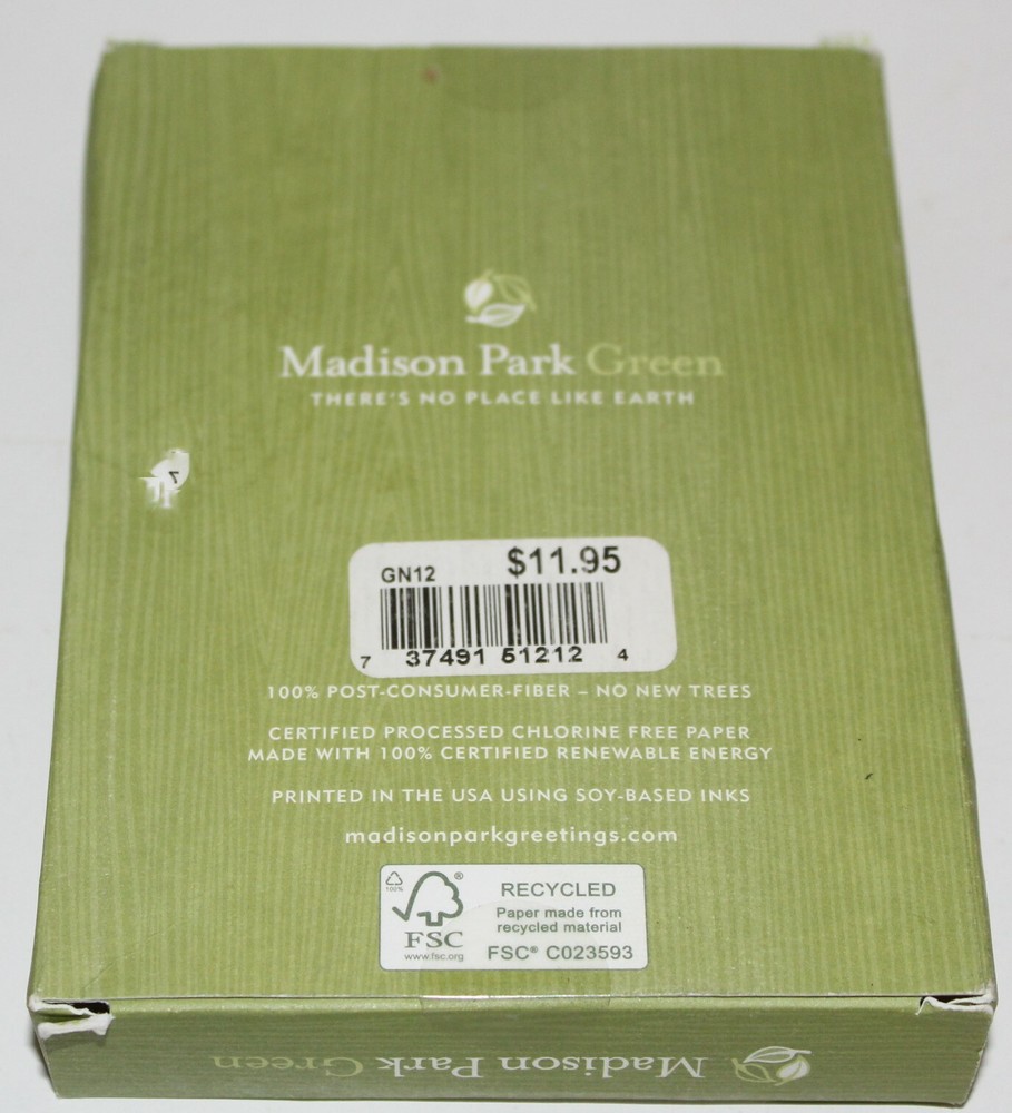 Vintage Madison Park Green Cards and Envelopes 10 NIB Note cards Recycled Paper Made in USA with 100% Post Consumer Fiber, NO new trees. Chlorine Free, made with renewable energy. Inks are Soy based. Box shows some ware but the box is new sealed on both ends.