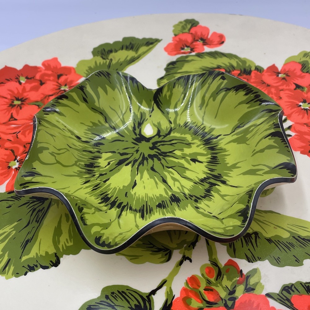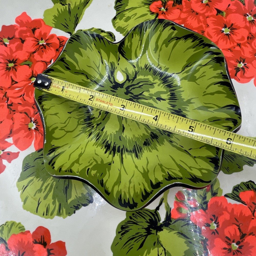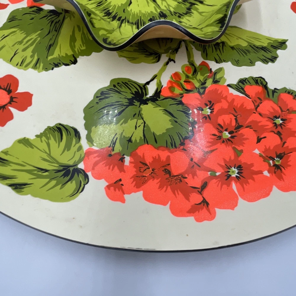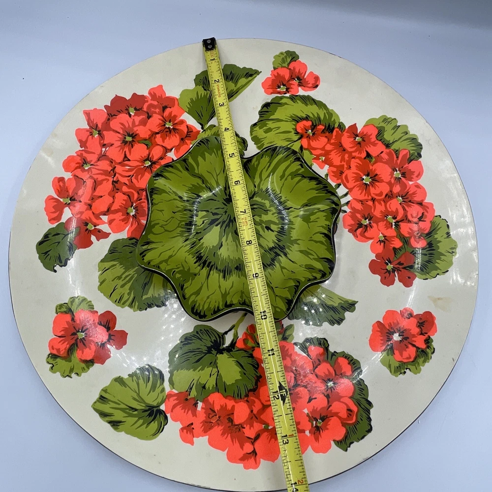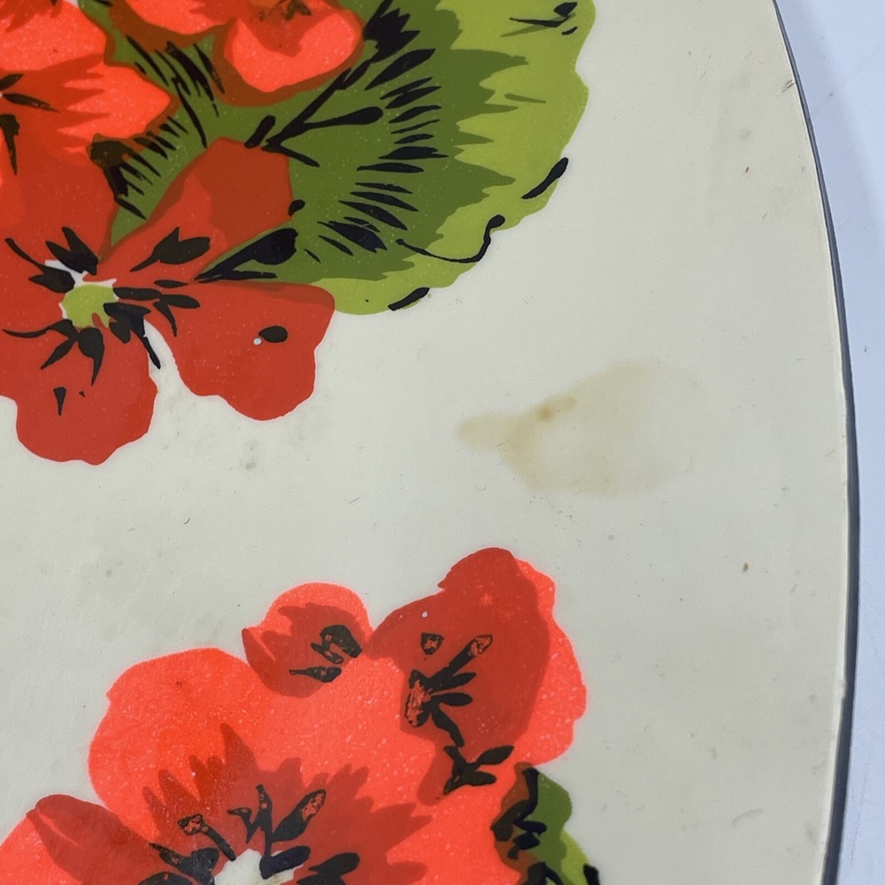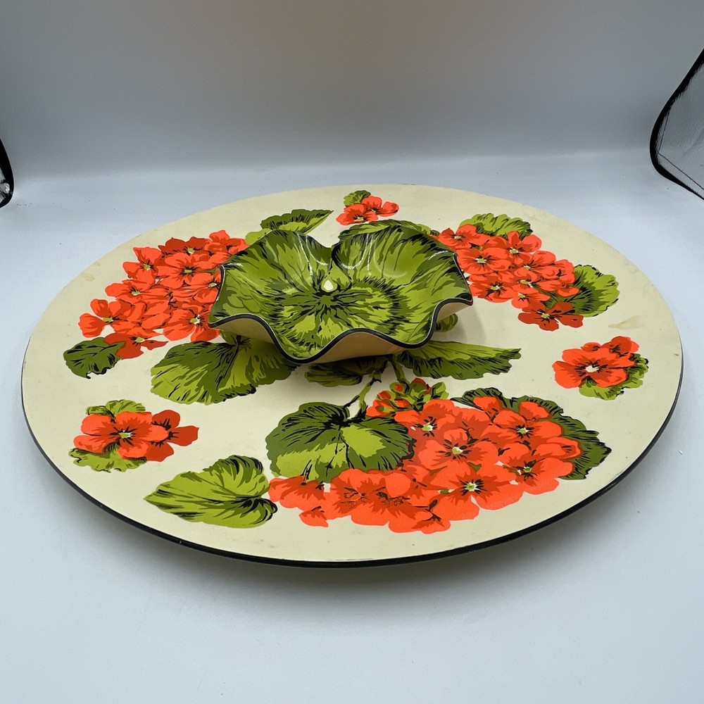 Overall great condition, has some discolorations see photos This Vintage Melamine Chip & Dip Serving Platter features a charming Spring Floral design in Retro Green and Orange colors. The platter has two compartments, with a large round shape and a glossy finish. It is perfect for all occasions and has a vintage/retro style that adds a touch of nostalgia to your table setting. The platter is made of durable melamine material and includes a tray feature for convenient serving. With a width of 14 inches, it is ideal for serving a variety of snacks and appetizers in a stylish and colorful way.