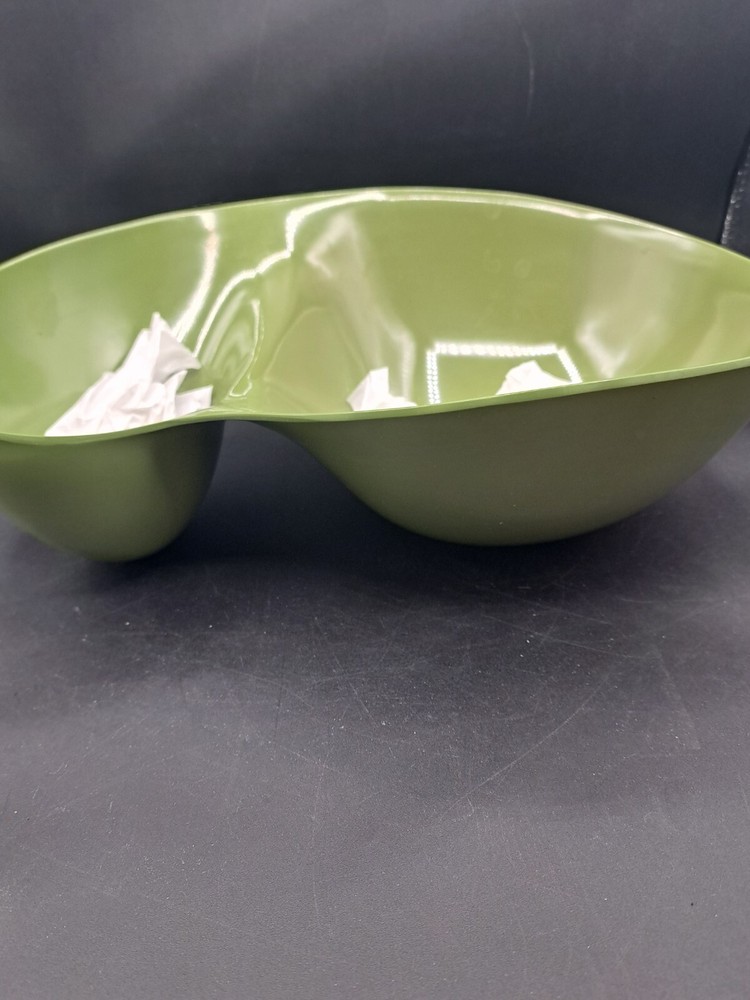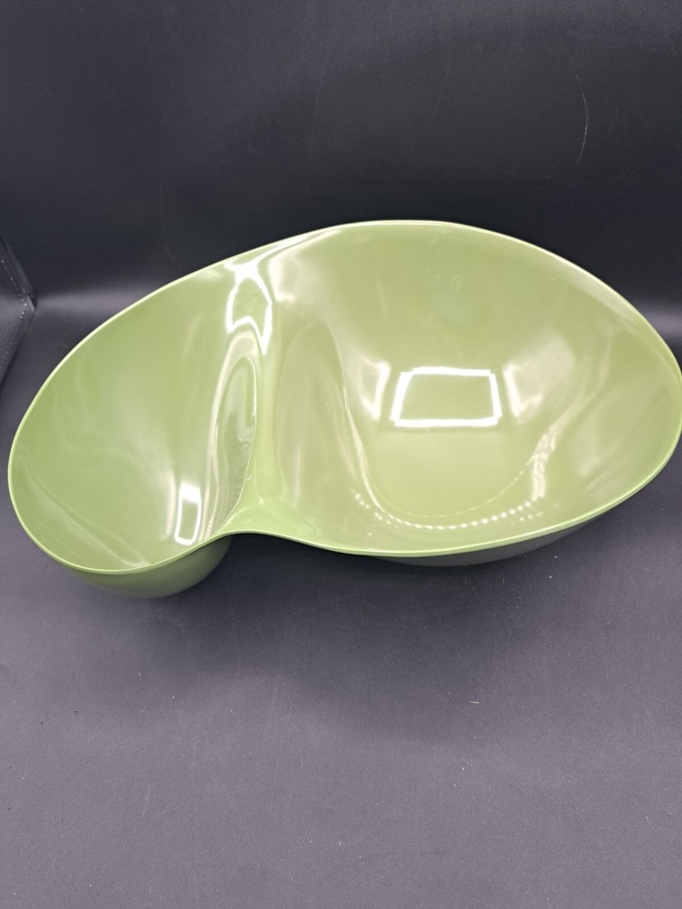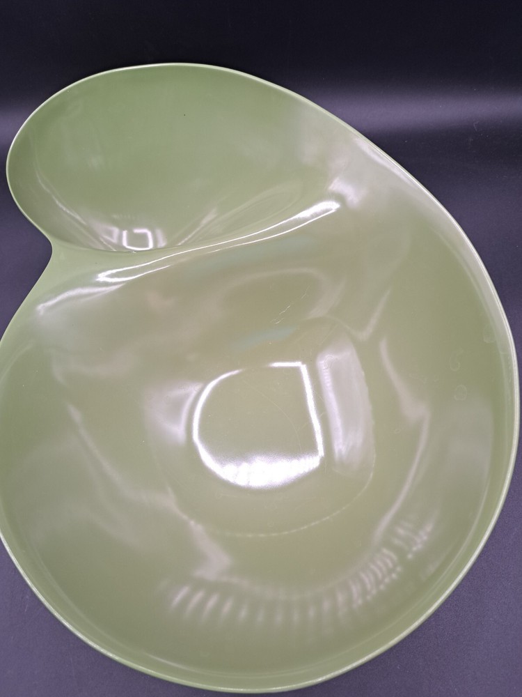 This vintage Melmac Melamine serving bowl is a must-have for any collector or lover of retro kitchenware. The large green bowl is perfect for serving dips, salads, or any other dish you desire. The bowl features a unique MCM style that will add a touch of vintage charm to your kitchen or dining room. The bowl is made of high-quality Melmac material that is durable and long-lasting. It is perfect for both indoor and outdoor use, making it ideal for picnics, parties, or any other occasion. The bowl is in excellent condition and will make a great addition to any collection. Don't miss your chance to own this unique piece of vintage Melmac dinnerware.