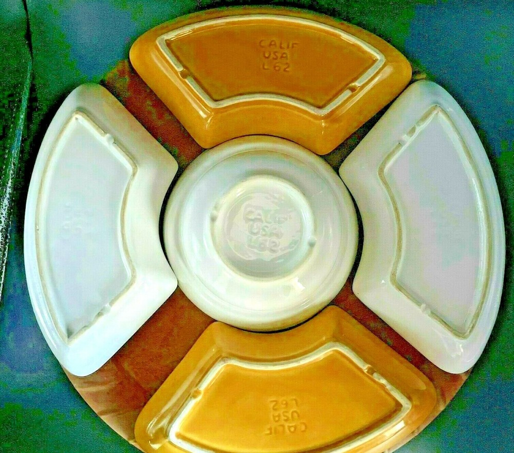 ~Vtg Mid-Century Modern California Pottery Chip Dip Bowl/Lid + 4 Side Bowls Wooden Lazy Susan~ USA ~ ... .Please review pictures...as they are part of the description...