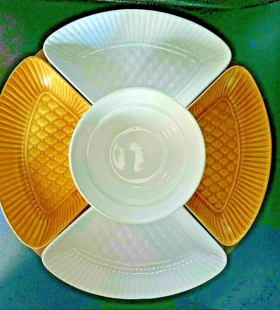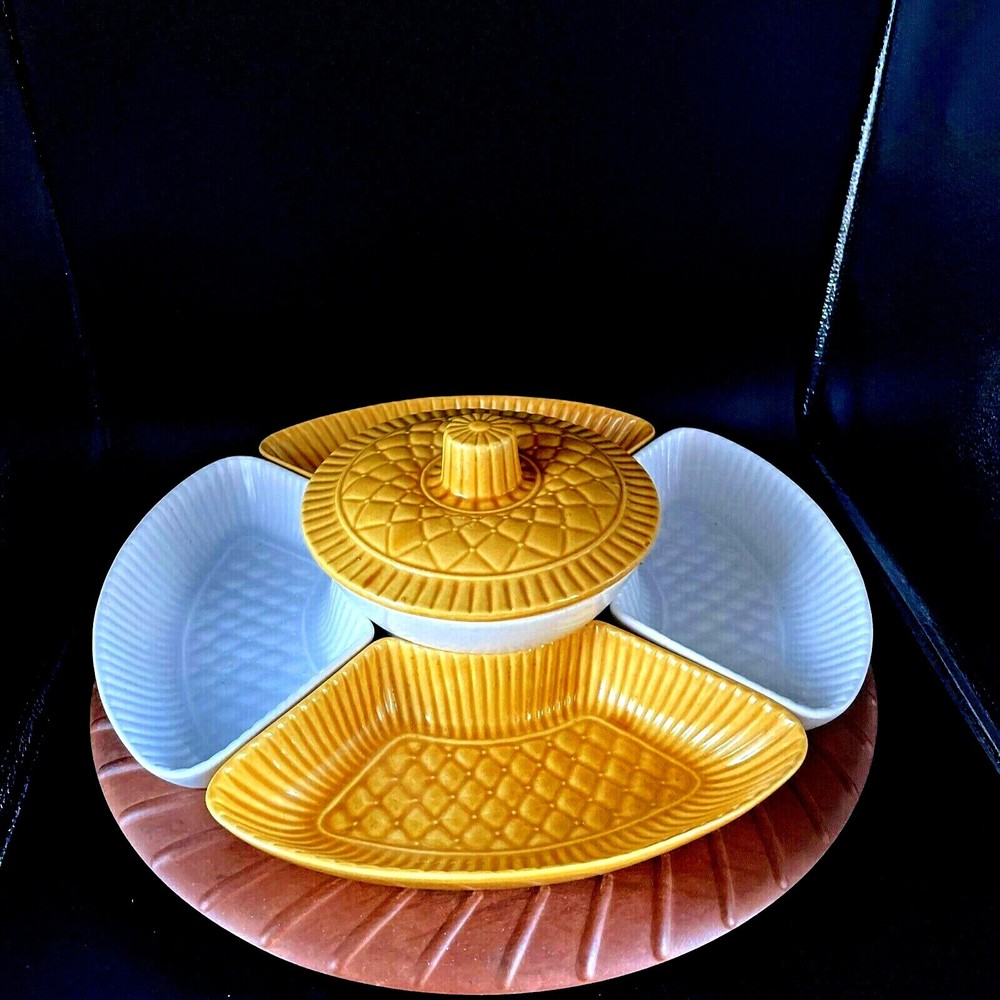 ~Vtg Mid-Century Modern California Pottery Chip Dip Bowl/Lid + 4 Side Bowls Wooden Lazy Susan~ USA ~ ... .Please review pictures...as they are part of the description......