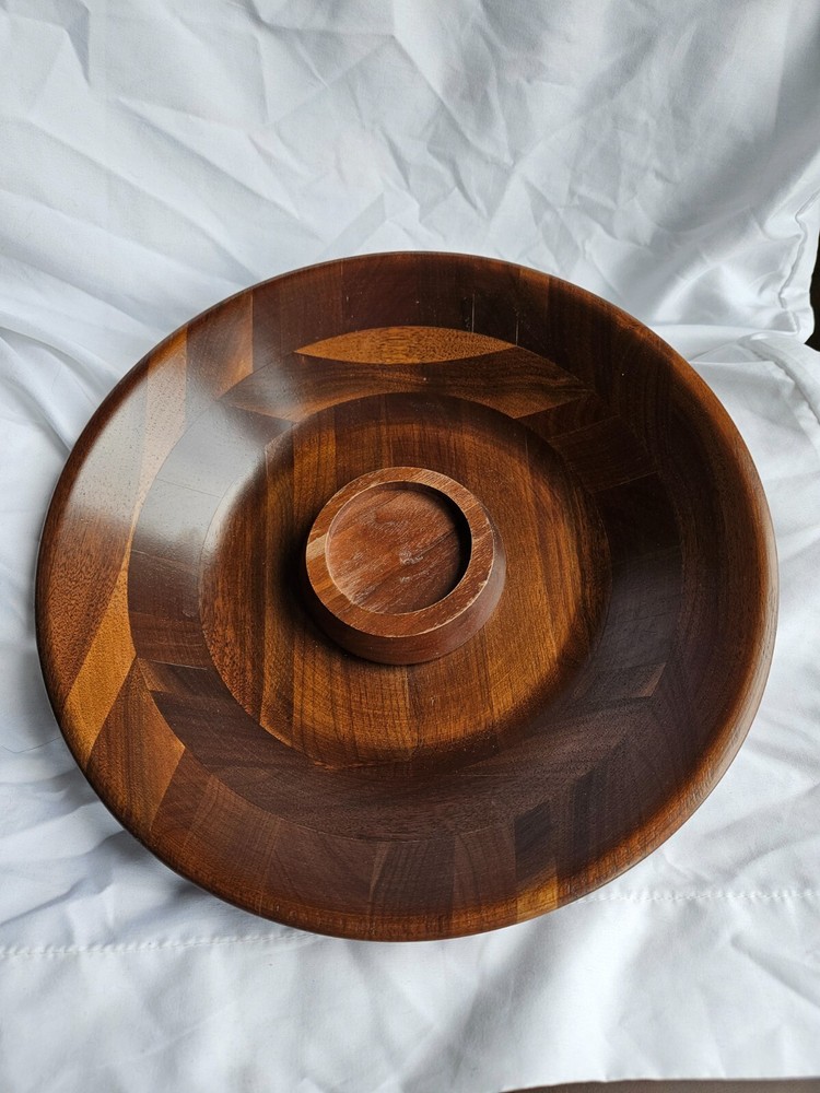 Vintage Mid Century Vermillion Walnut Large 12" Chip and Dip Bowl Chip bowl only. Dip bowl not included. I listed it as used as it has been in a china hutch and shows some age....
