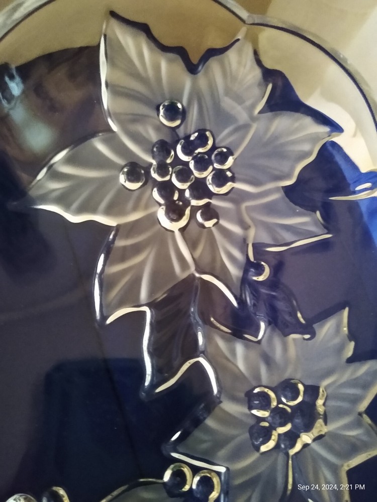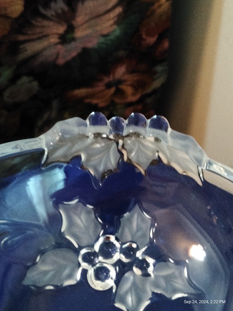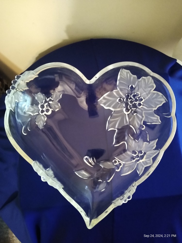 This vintage Mikasa candy dish is a beautiful addition to any holiday-themed collection. The heart-shaped design features a frosted poinsettia and holly flower pattern, making it a perfect festive piece for the season. The dish is made of glossy art glass and weights 3 lbs. The candy dish has one compartment, measuring 10.5 inches in width and 9.5 inches in depth, with a height of 2.5 inches. It is an original, studio-crafted piece from Germany, manufactured in the 1980s. The dish is recommended to be hand-washed only and comes unboxed. This versatile piece is perfect for serving candy, nuts, or other small treats during the holiday season.