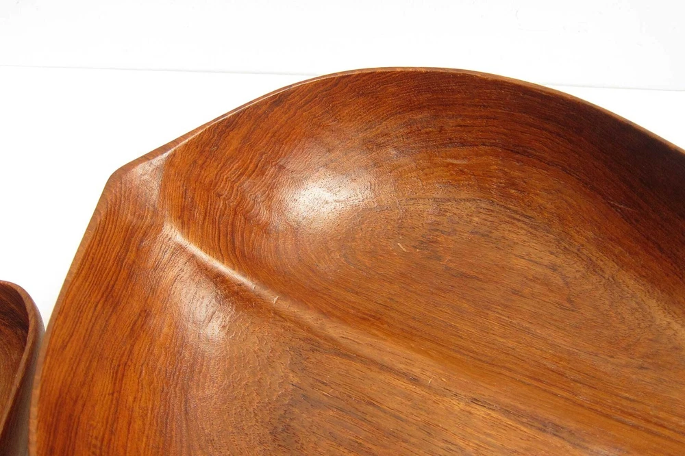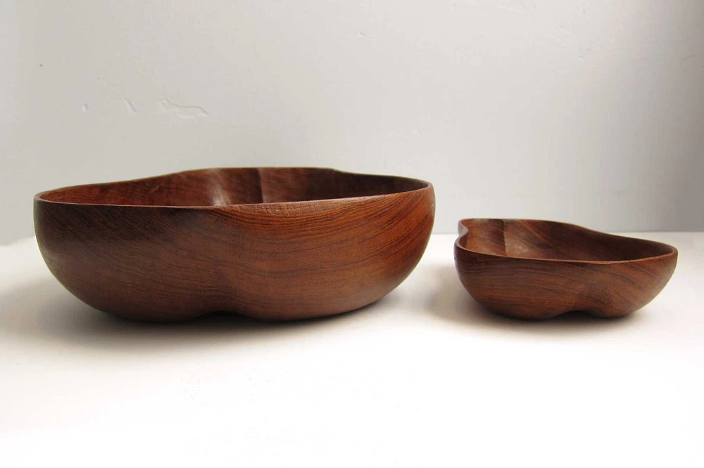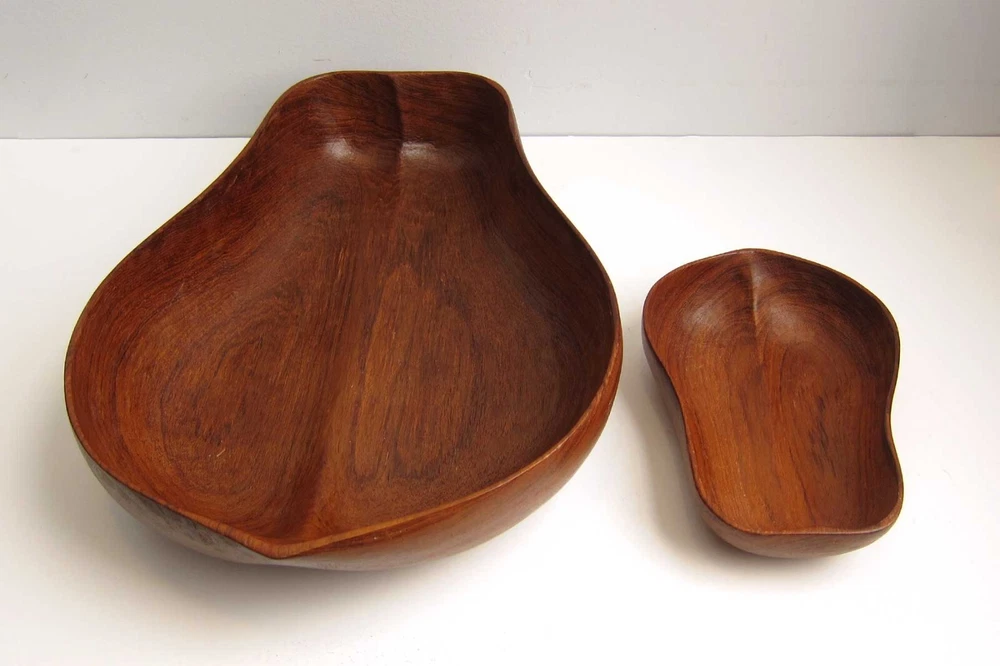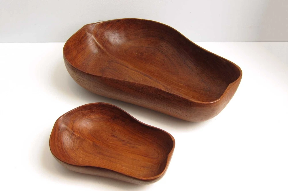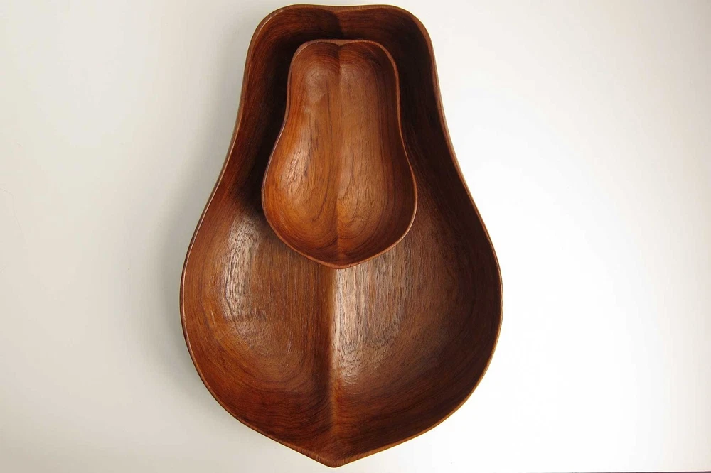 Vintage tropical wood serving bowl set - a hand carved large pear shape bowl and matching smaller bowl. Unmarked. Large bowl measures 15 3/4" x 11" x 3 1/4". Small bowl measures 8" x 5 1/2" x 1 3/4". Both are in wonderful vintage condition with no chips or cracks, and minimal signs of use. Please keep in mind that vintage is most likely to be used and may show wear and age. Any significant flaws are mentioned in the description and seen in the photographs. I want you to be happy with your purchase, so please view all photos as they are part of the description. Feel free to reach out if you have any questions or want to see more pictures before purchasing.