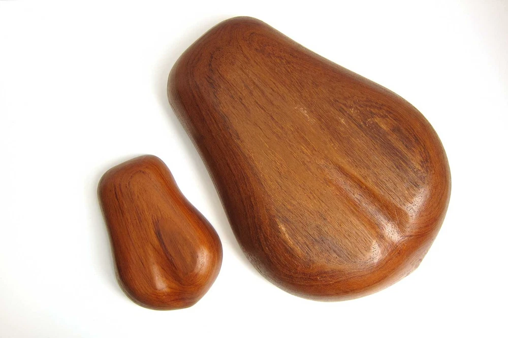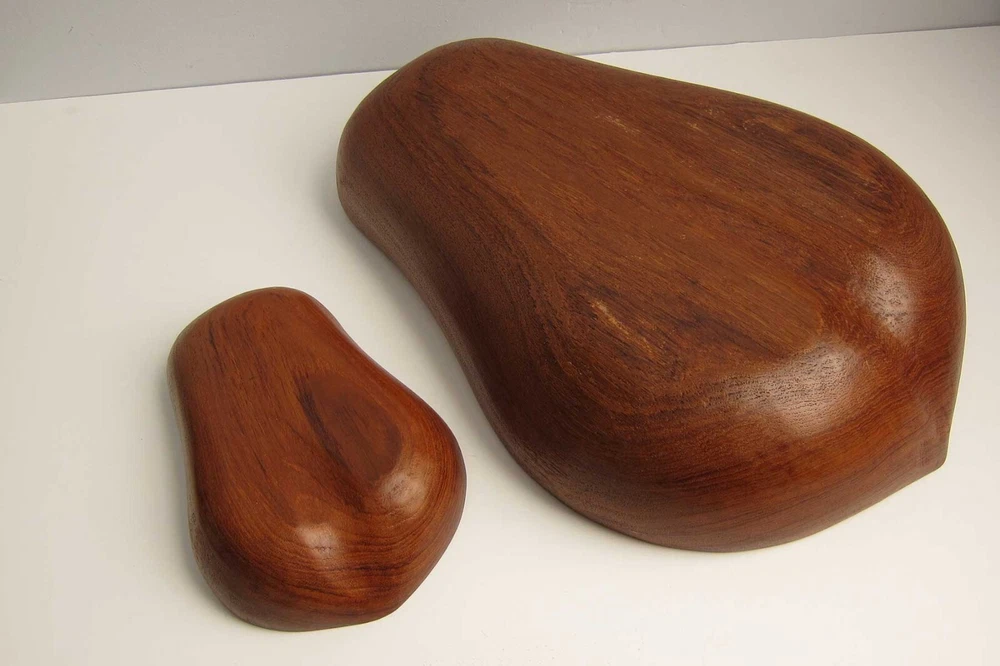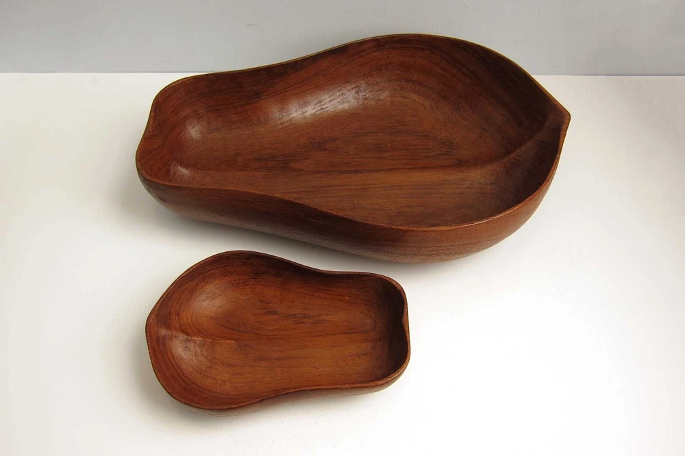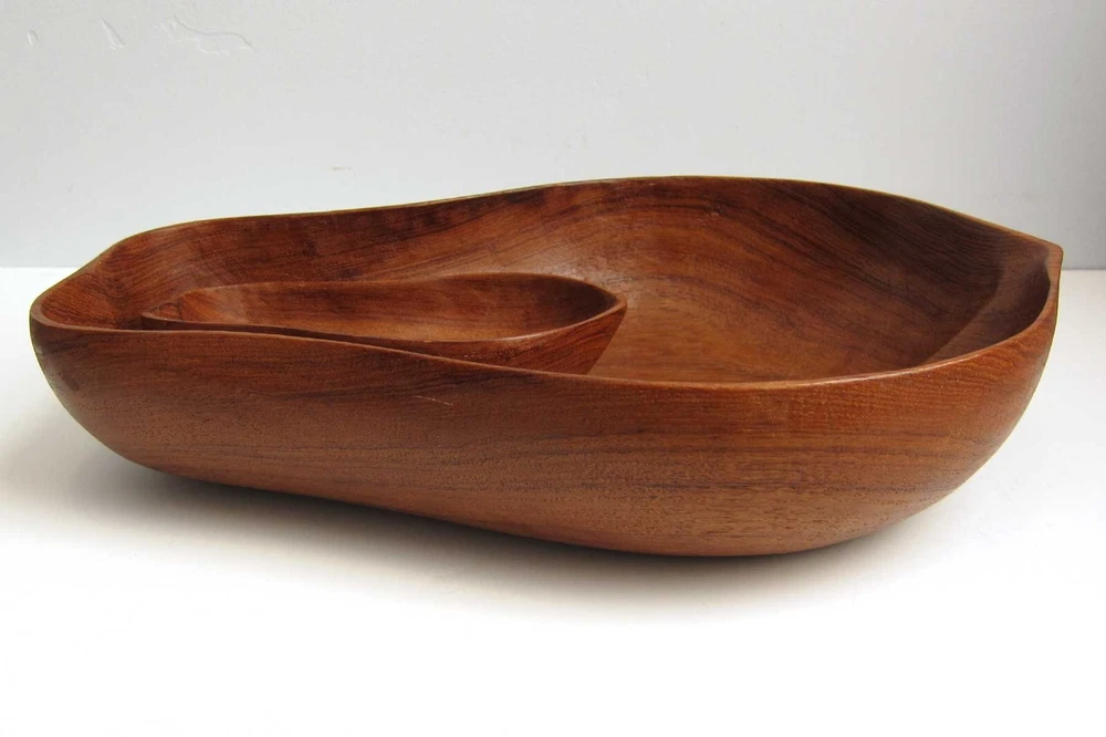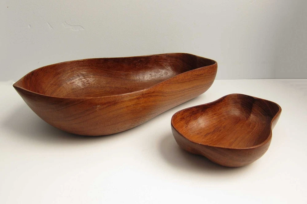 Vintage tropical wood serving bowl set - a hand carved large pear shape bowl and matching smaller bowl. Unmarked. Large bowl measures 15 3/4" x 11" x 3 1/4". Small bowl measures 8" x 5 1/2" x 1 3/4". Both are in wonderful vintage condition with no chips or cracks, and minimal signs of use. Please keep in mind that vintage is most likely to be used and may show wear and age. Any significant flaws are mentioned in the description and seen in the photographs. I want you to be happy with your purchase, so please view all photos as they are part of the description. Feel free to reach out if you have any questions or want to see more pictures before purchasing.