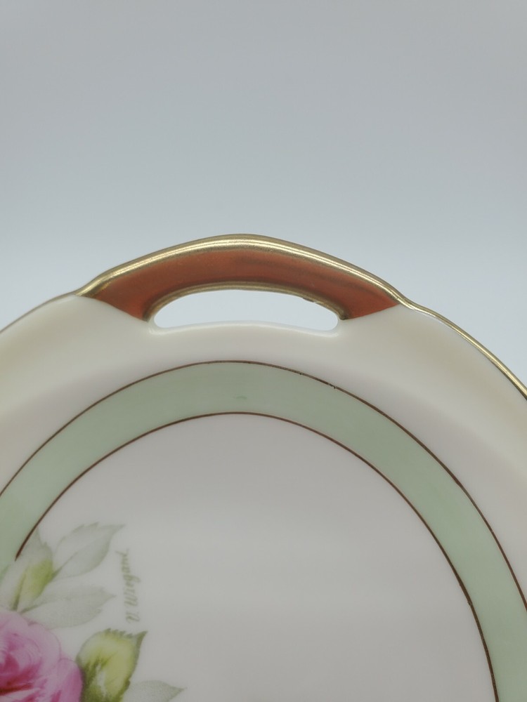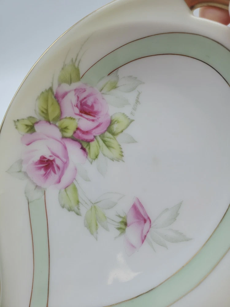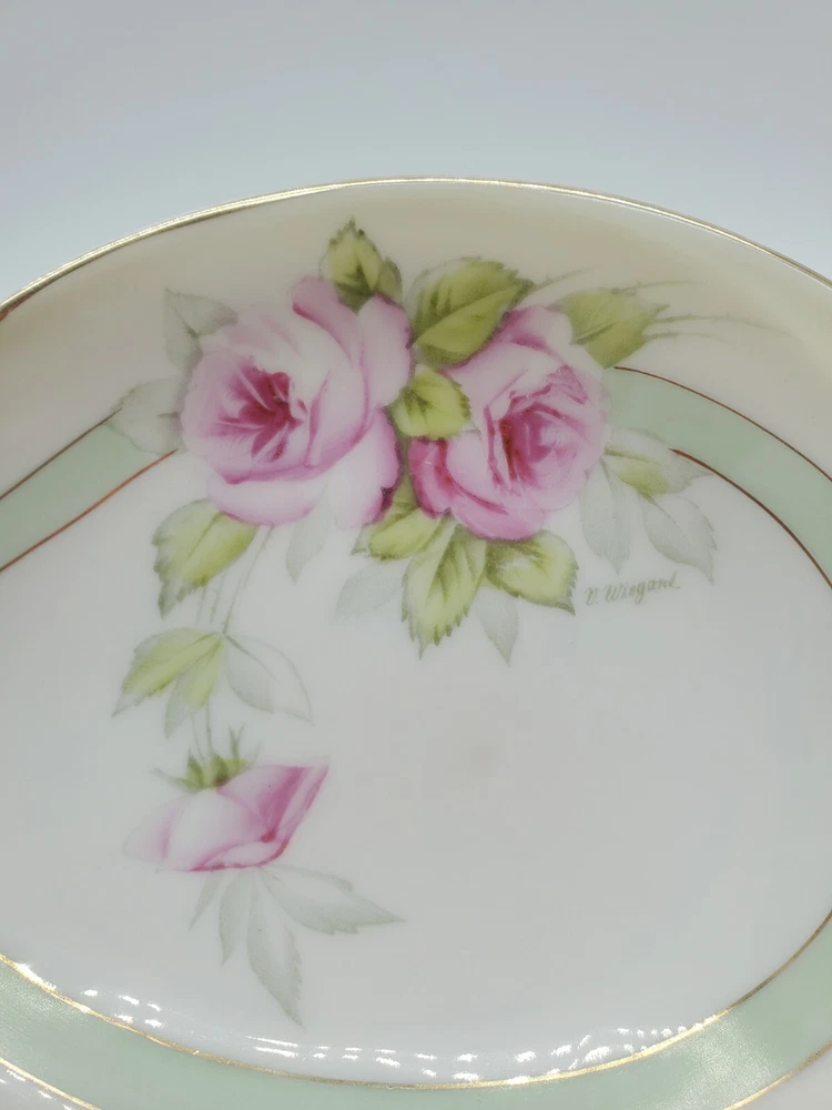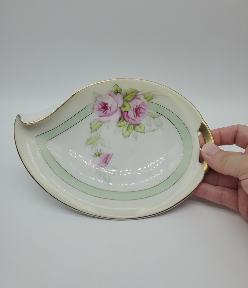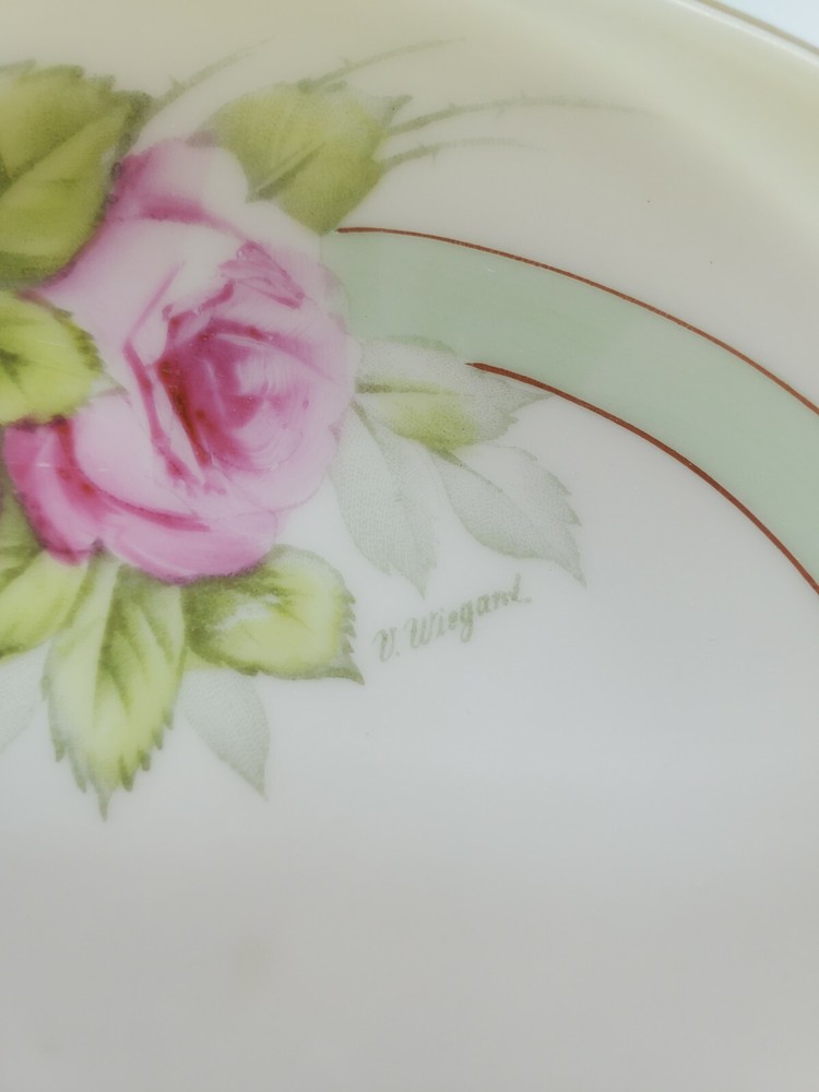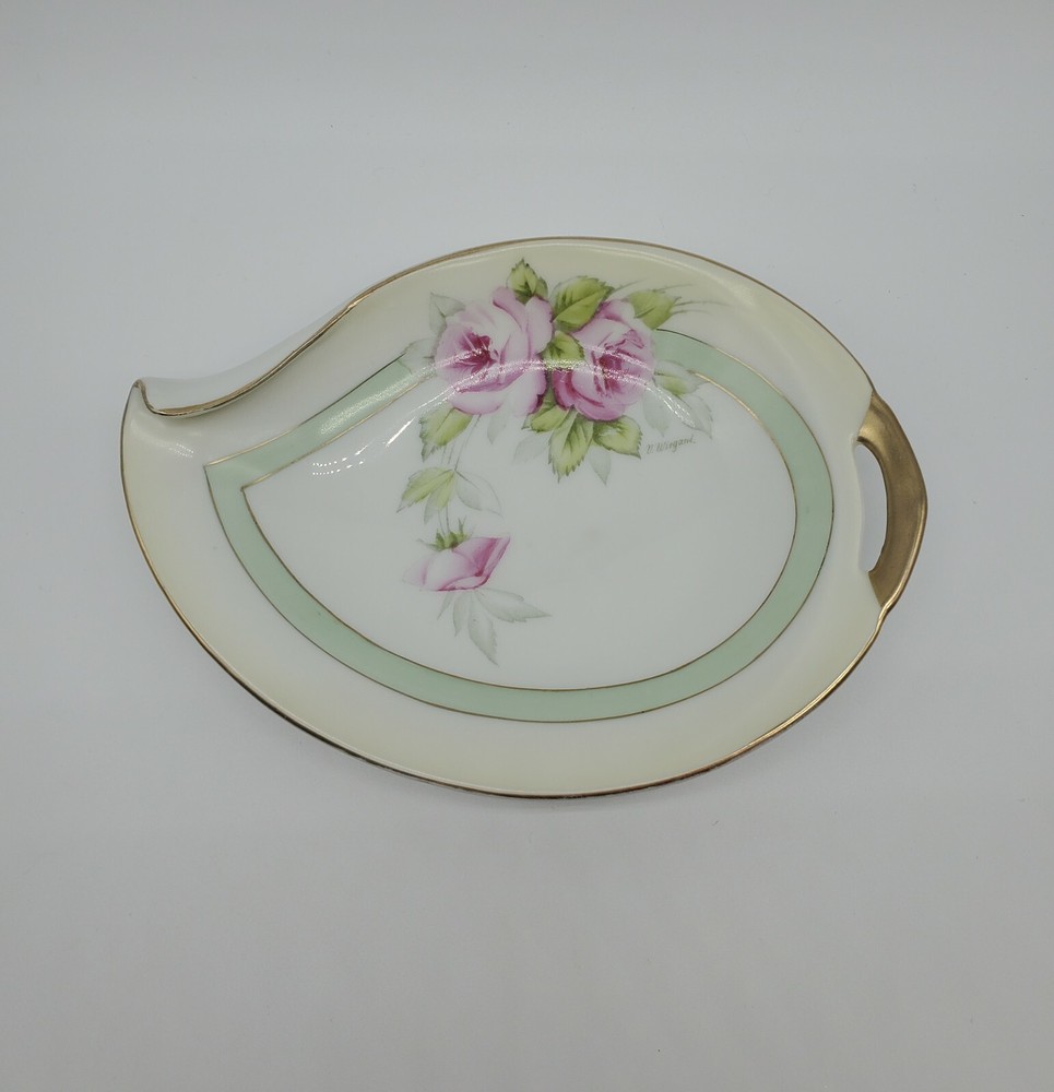Vintage Bavaria Studio Handpainted China, Leaf Shaped Dish with One Handle and Signed, V. Wiegand (seen under the roses). This dish is a white and ivory color with painted pink roses, a pastel green stripe and gold trim. It is in Good, Pre-owned condition, showing minimal wear from age and use. There are what appear to be makers flaws in the painted roses. At the center of the dish, a small faint discoloration is seen. It does not wash off and at the best of my abilities of close inspection, it appears to be within the glaze. **See all photos of above descriptions and approximate measurements ** There are no breaks, no chips, no cracks. Shipped with USPS Priority Mail.