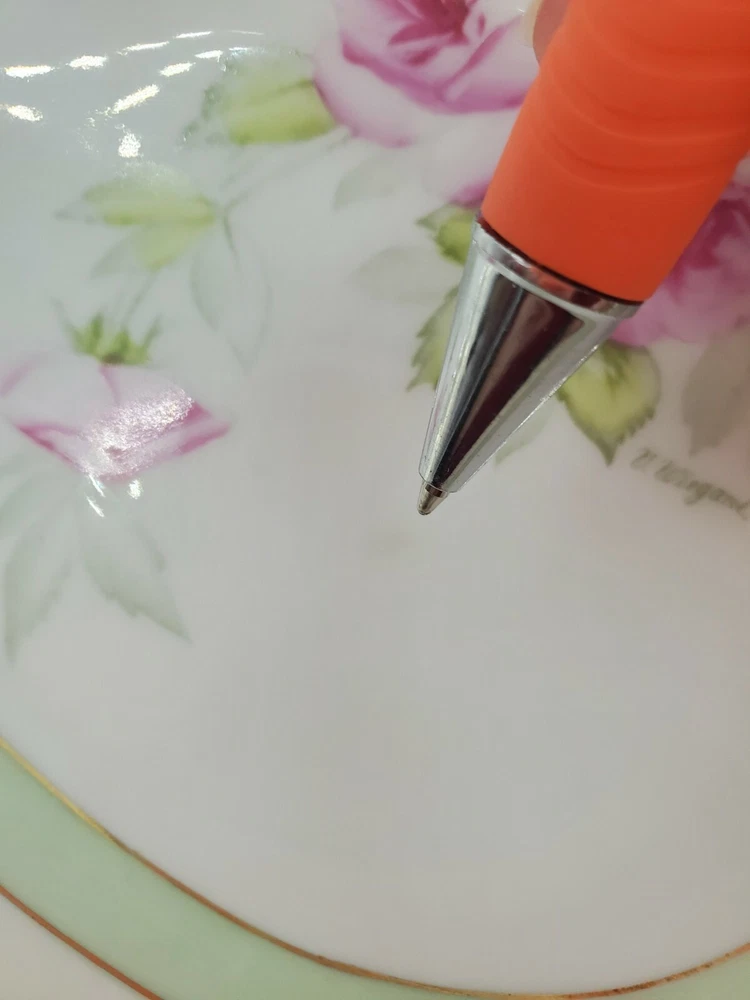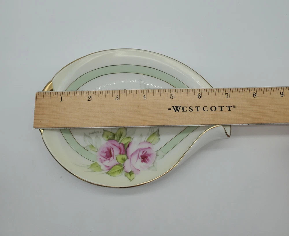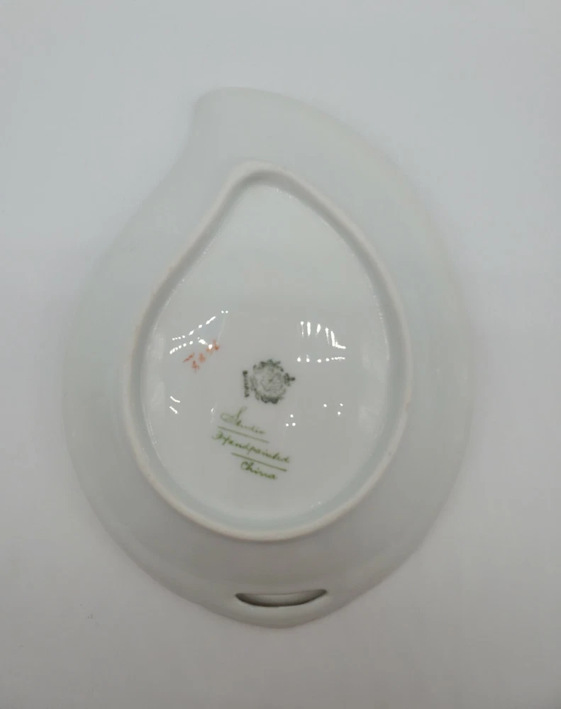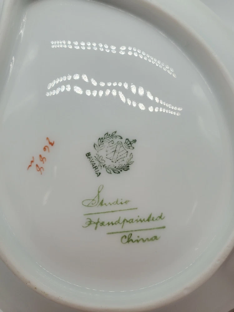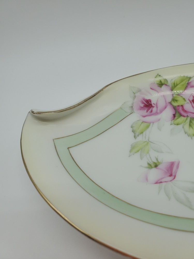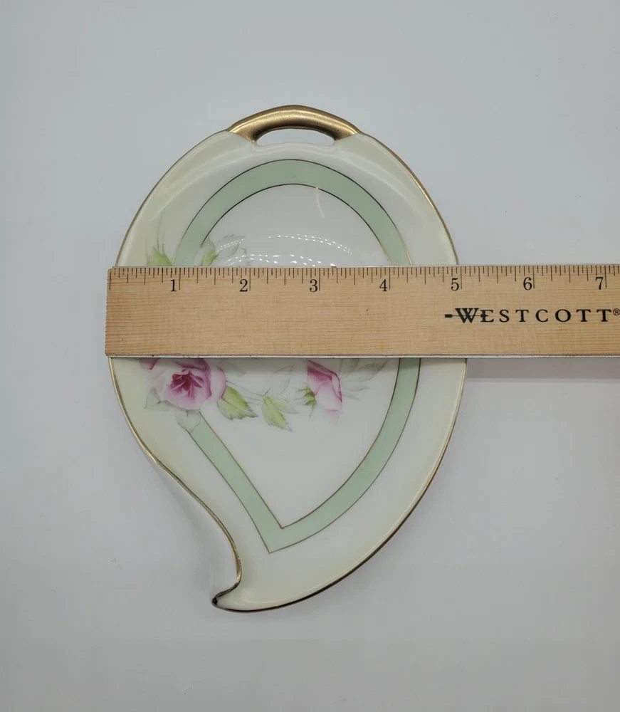 Vintage Bavaria Studio Handpainted China, Leaf Shaped Dish with One Handle and Signed, V. Wiegand (seen under the roses). This dish is a white and ivory color with painted pink roses, a pastel green stripe and gold trim. It is in Good, Pre-owned condition, showing minimal wear from age and use. There are what appear to be makers flaws in the painted roses. At the center of the dish, a small faint discoloration is seen. It does not wash off and at the best of my abilities of close inspection, it appears to be within the glaze. **See all photos of above descriptions and approximate measurements ** There are no breaks, no chips, no cracks. Shipped with USPS Priority Mail.