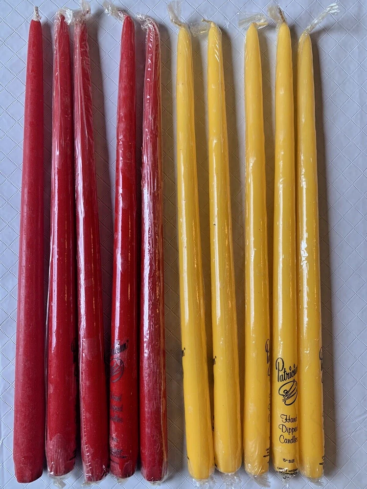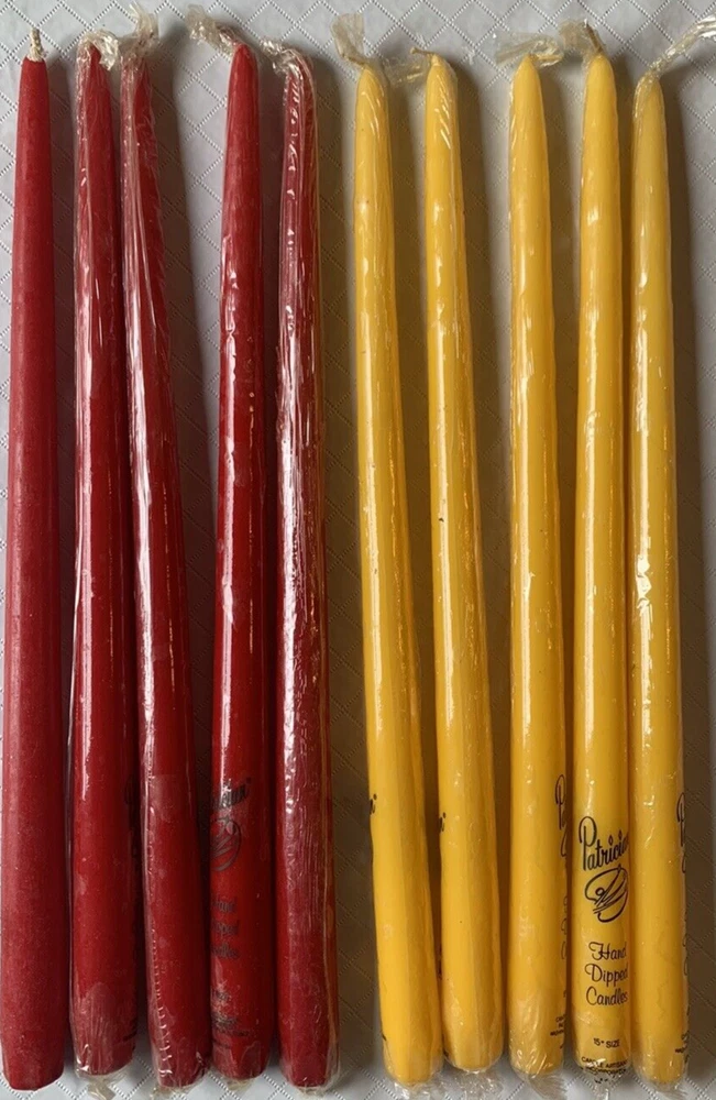 Vintage Patrician Hand Dipped Candles. Smokeless, Dripless, Self Fitting End. Includes 5 Autumn Yellow & 5 Red Candles (10 total), all new unused. Made in USA
