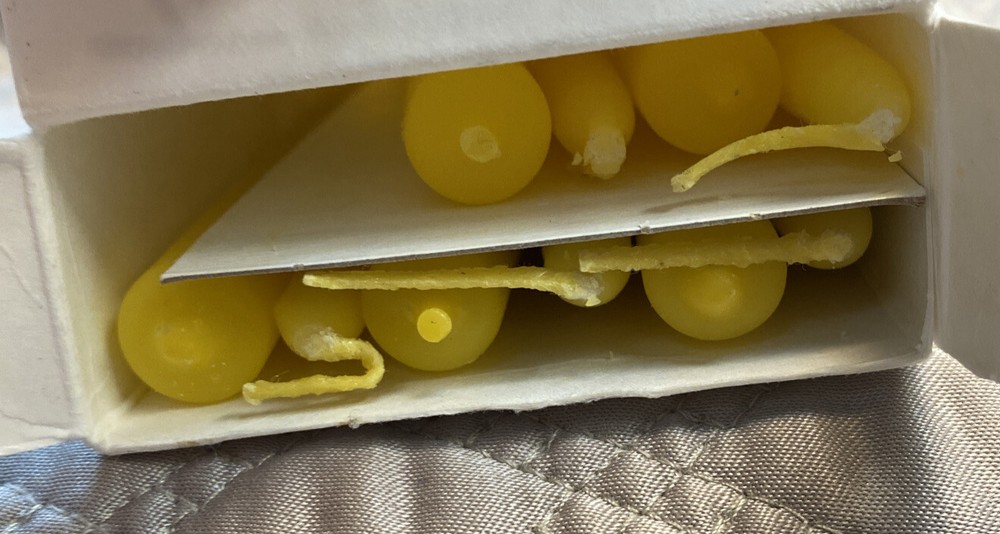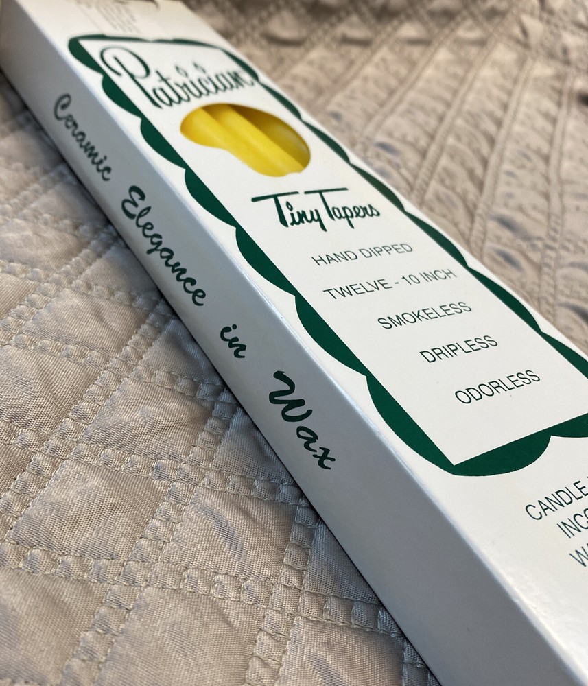 Introducing a set of ten vintage tiny taper candles by Patrician. Made with traditional hand dipping techniques, these yellow candles are smokeless, dripless, and odorless. Each candle is 10 inches in size and comes with non-drip features, making them perfect for both indoor and outdoor use.