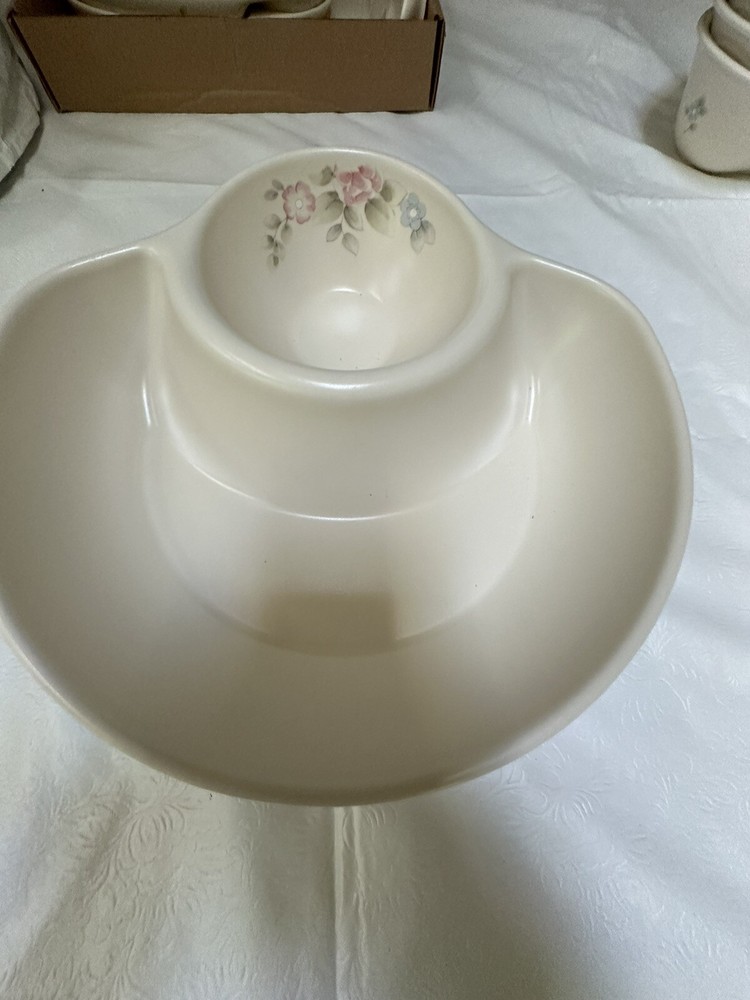 Add a touch of vintage charm to your table setting with this set of three large chip and dip bowls from Pfaltzgraff's Tea Rose collection. Crafted from durable stoneware, these bowls feature a lovely heart-shaped design in a soft pink color that will complement any table decor. Perfect for serving your favorite dips or chips, these bowls are sure to impress your guests and add a touch of elegance to your dining experience. The set includes three serving bowls and is perfect for any occasion, whether it's a casual gathering or a formal dinner party. The bowls are from the 1980s and are considered vintage. With their unique design and high-quality construction, they are sure to be a cherished addition to your collection.