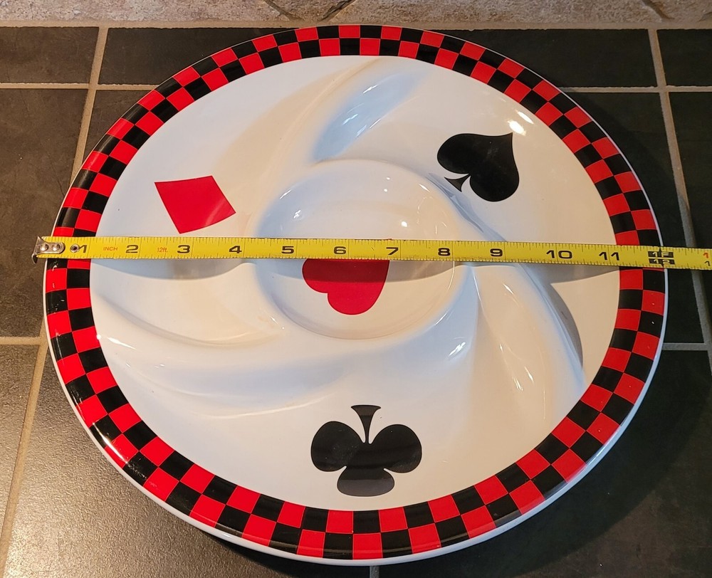 This vintage vegetable and dip platter by Alco Industries features a playful poker card suite pattern, with four compartments for your favorite snacks. The round platter is made of glossy ceramic material and is perfect for all occasions, whether it's a casual get-together or a themed party. The large size provides ample space for chips, vegetables, and dips in a colorful and eye-catching display. Add some fun to your next gathering with this unique piece of dinnerware.