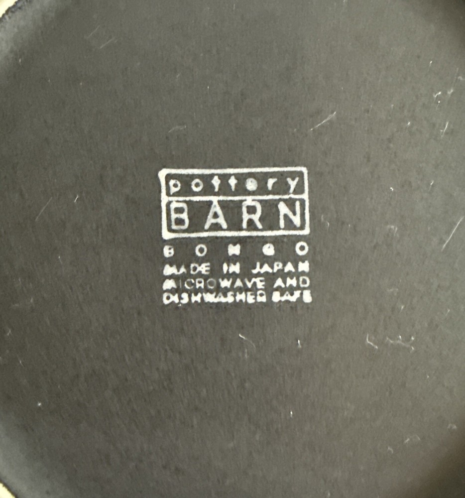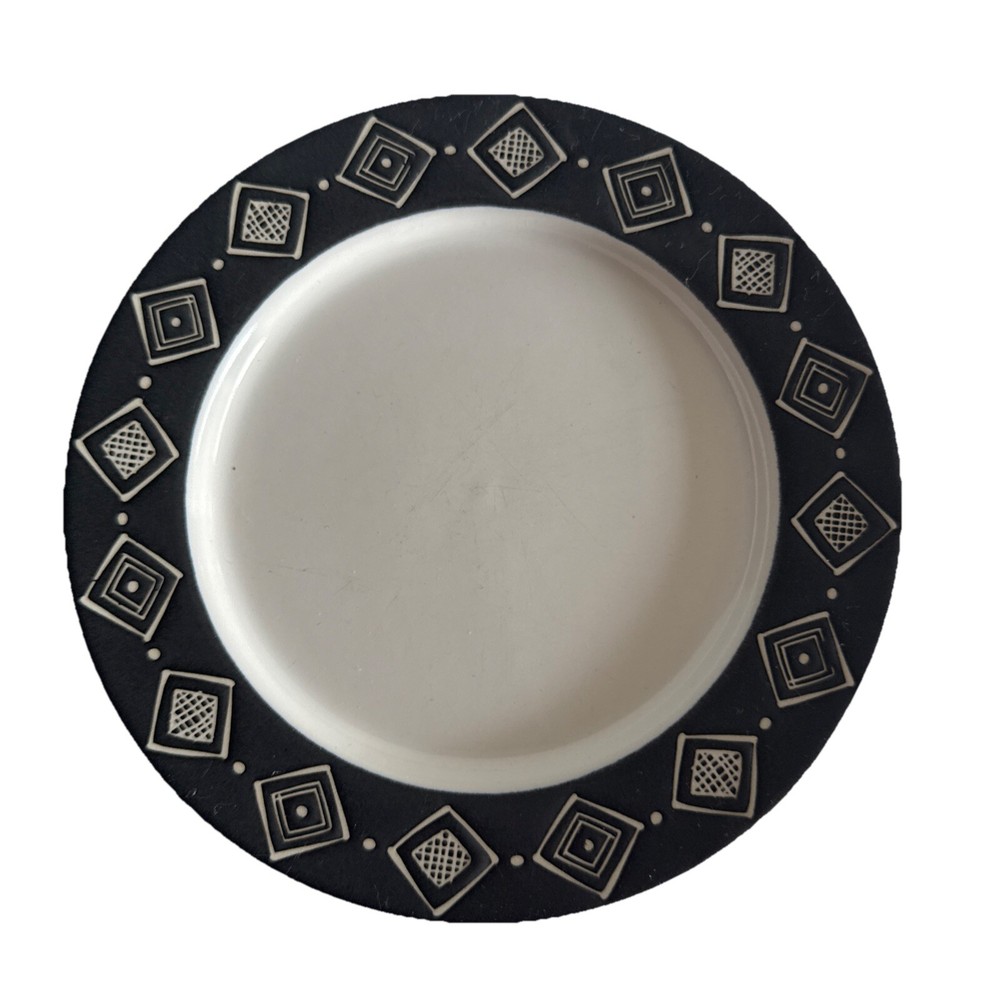 This vintage Pottery Barn Bongo salad/dessert plate features a round shape with a diameter of 7.5 inches. The plate is black in color with a matte finish and a geometric theme, making it suitable for all occasions. It is microwave and dishwasher safe, manufactured in Japan during the 1990s, and bears a printed backstamp. This unique plate is ideal for adding a touch of retro style to your table setting.