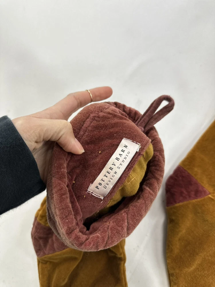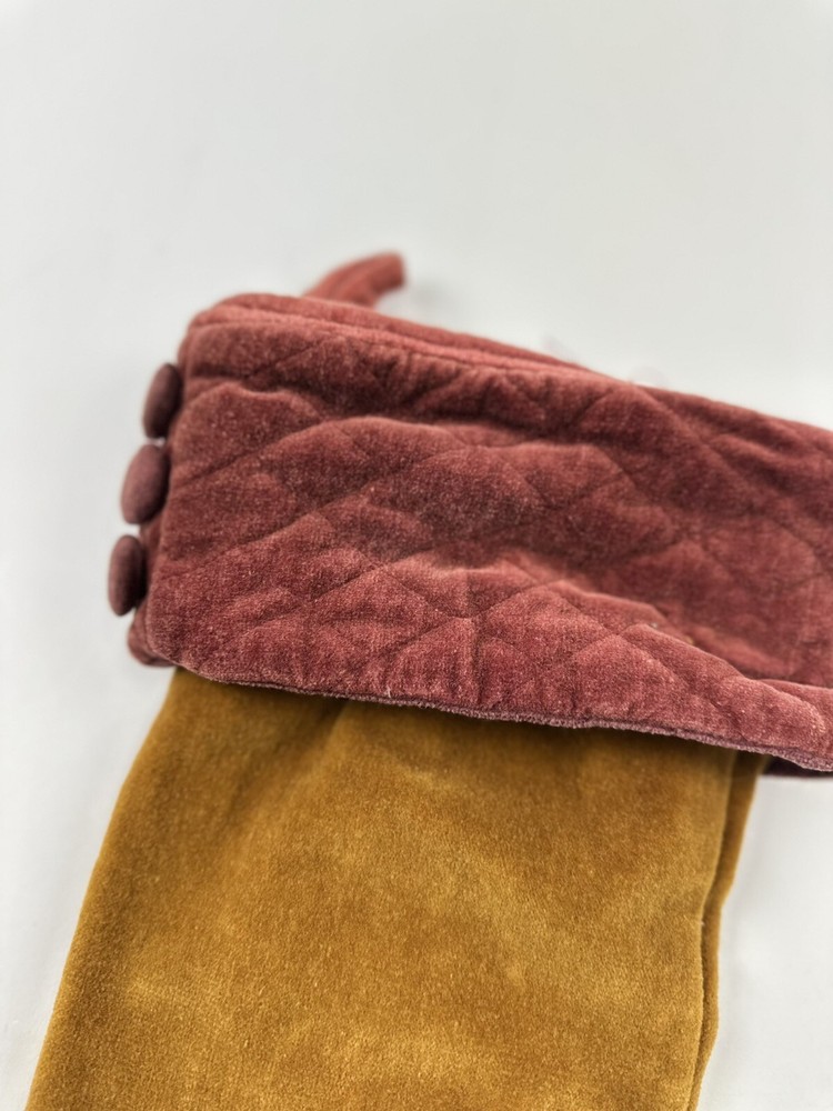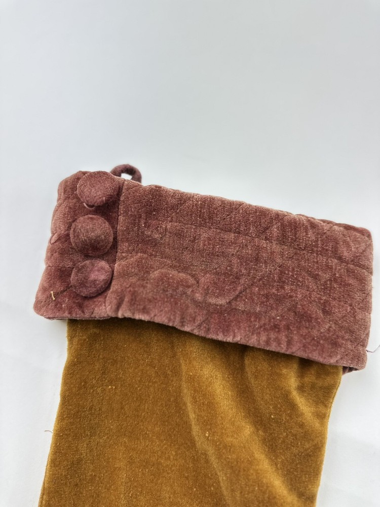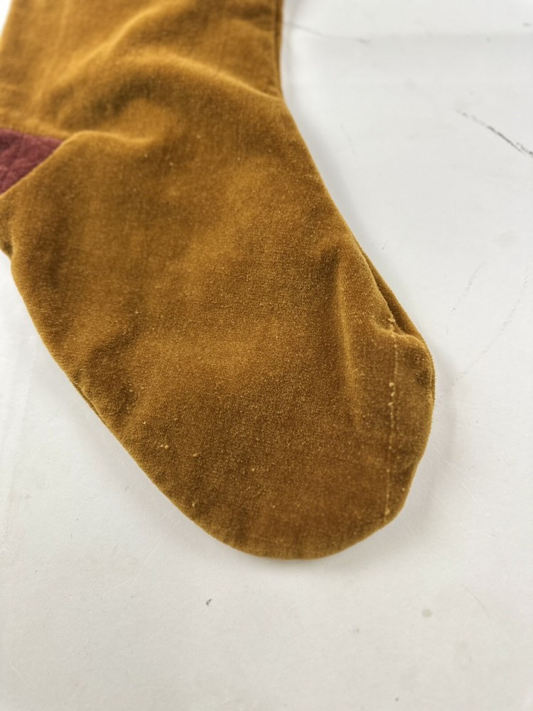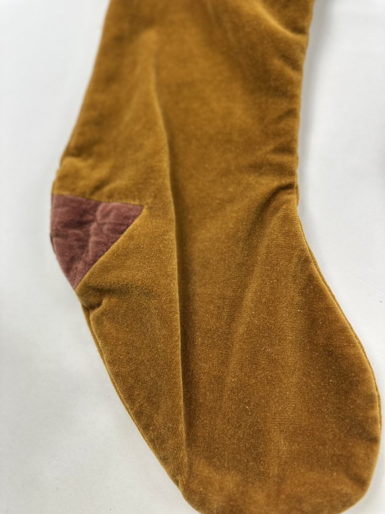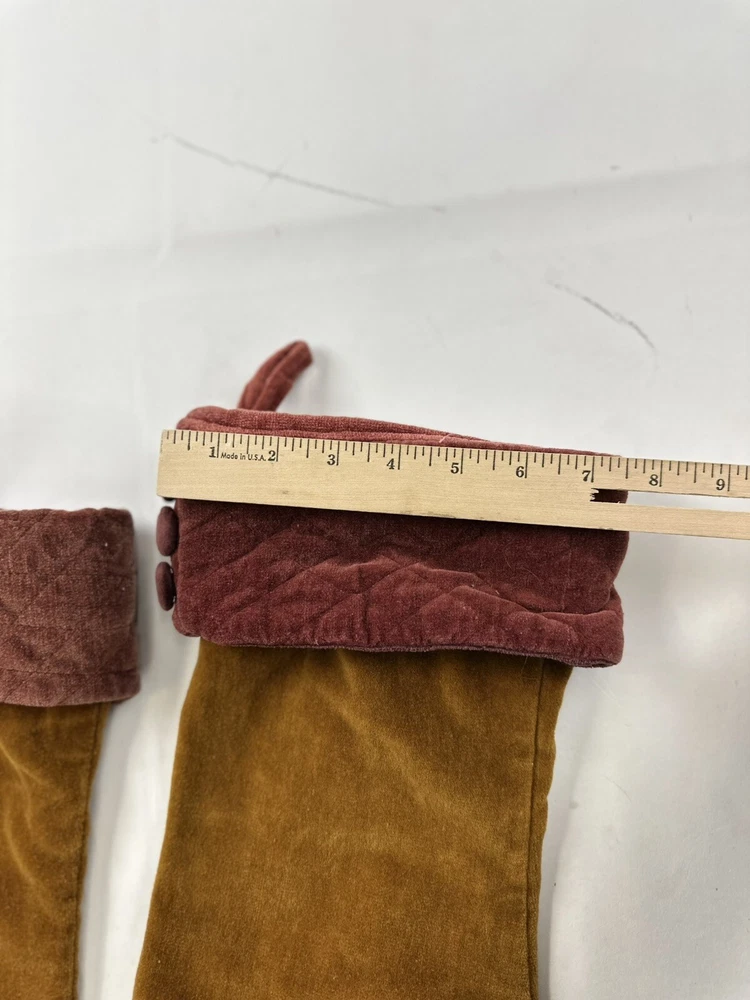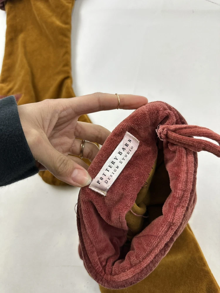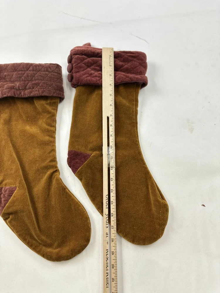 This product is a set of two vintage Pottery Barn Christmas stockings, each measuring 19 inches in length and height. The stockings are made of luxurious gold velvet, featuring a geometric pattern and a sock shape. Perfect for the Christmas occasion, these stockings add a touch of elegance to holiday decor. The rare design and brand make them a unique and stylish addition to any festive setting.