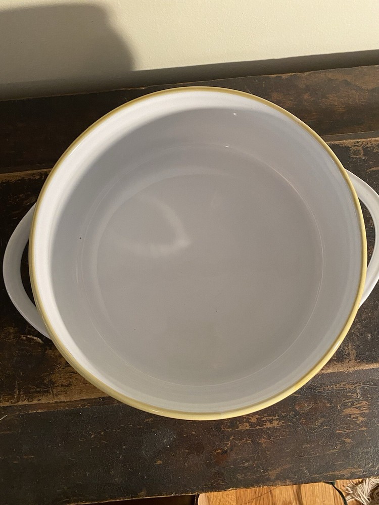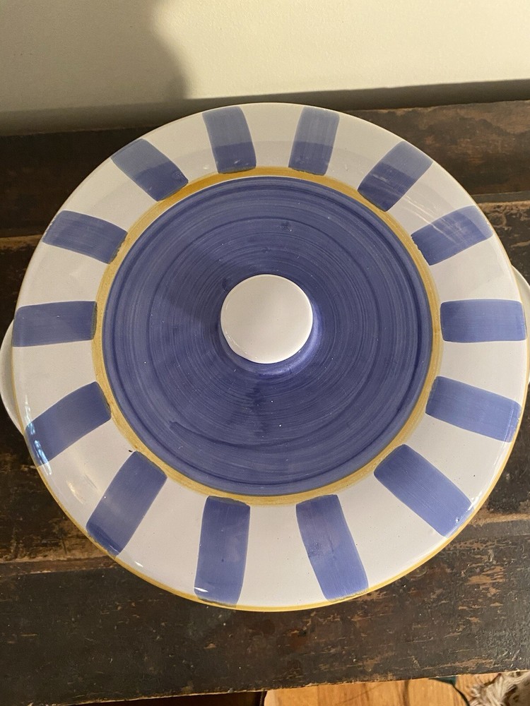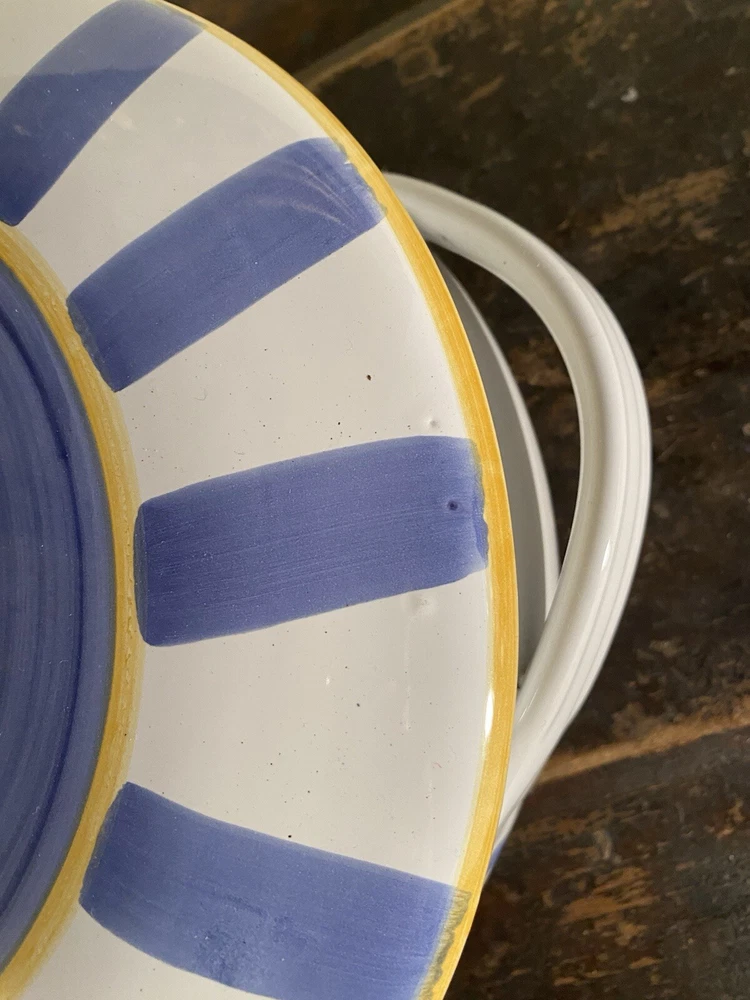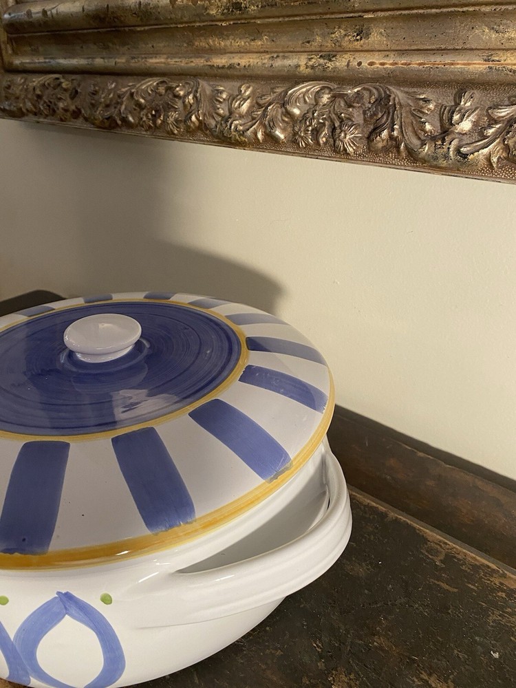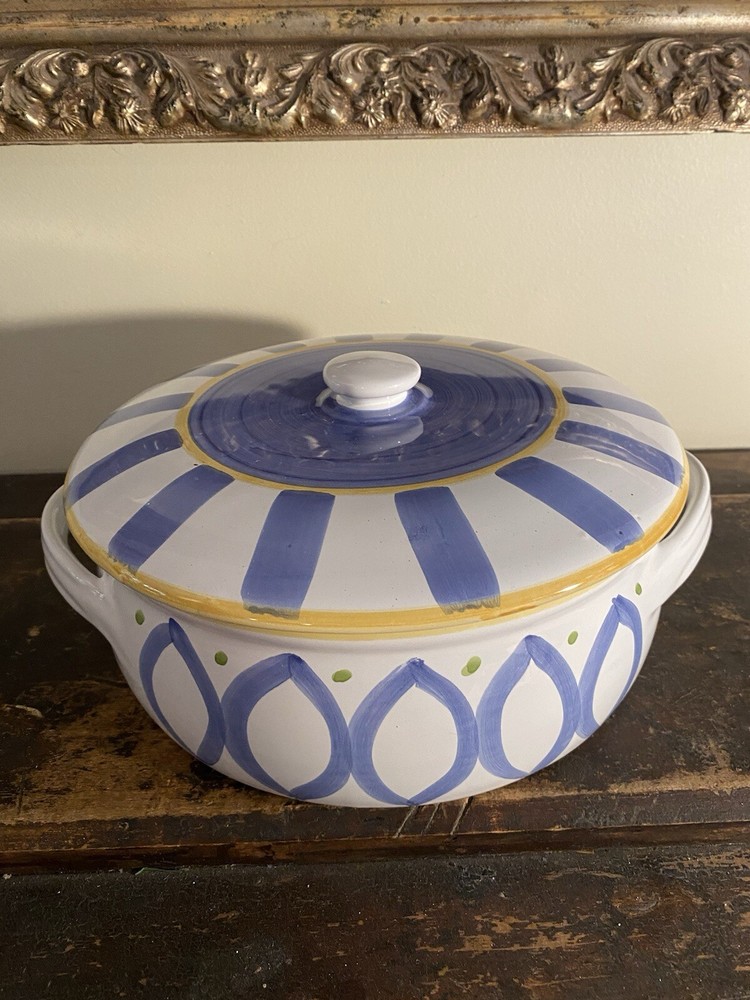 Vintage pottery barn italy covered casserole. This is a nice preowned condition. A couple of small flaws like a Nick on the underside bottom. A couple of tiny dings on the top. I’ve taken pictures of any flaws that I’ve noticed. Diameter is 9 3/4 inches not including the handles..