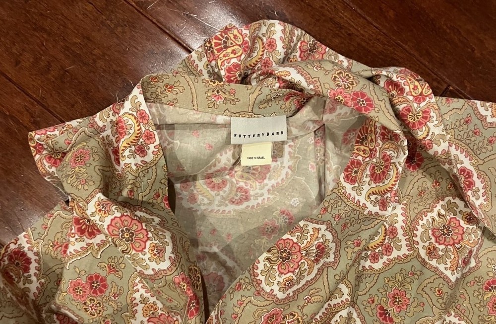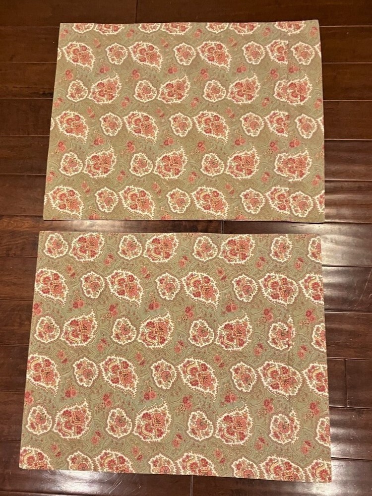 This pair of Pottery Barn standard pillow shams are 30 inches long and 24 inches wide. They are in excellent used condition with no rips, tears, or stains and minimal signs of wear. The pillow cases feature a delicate floral paisley print in a soft color palate of pink and white against a taupe background.