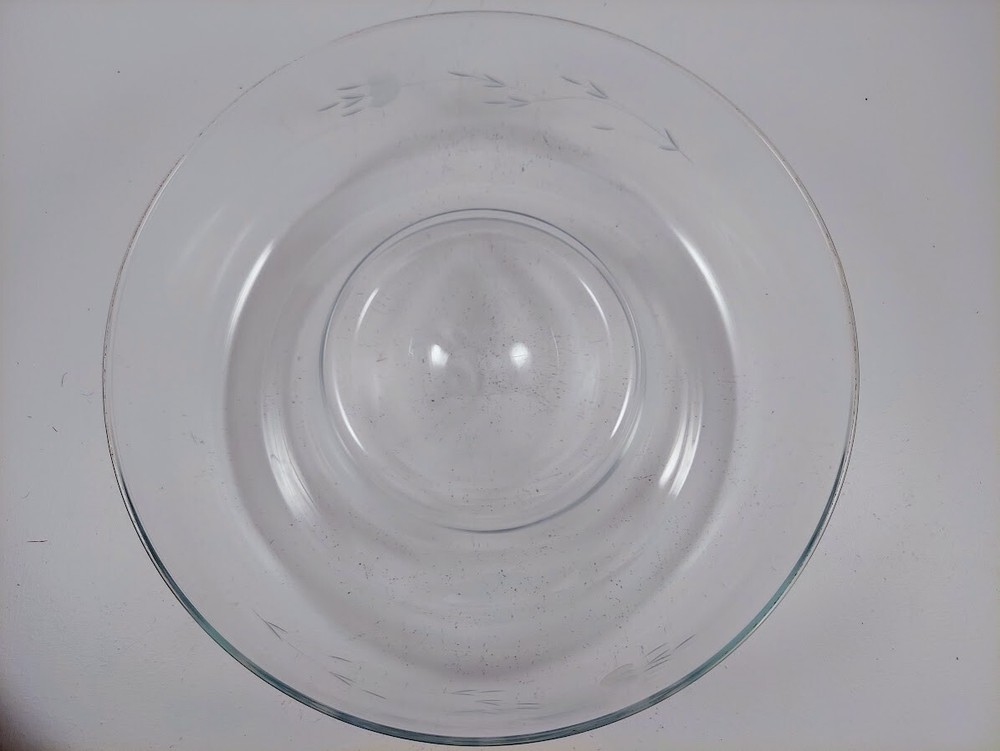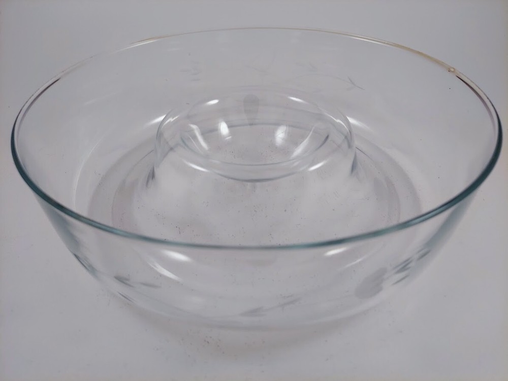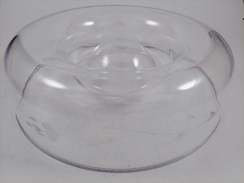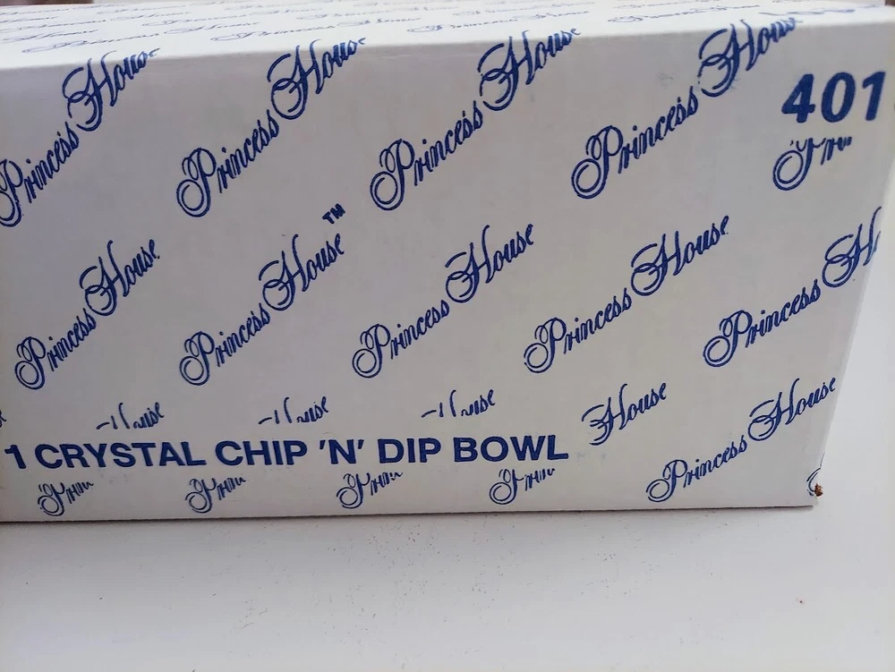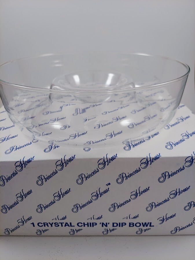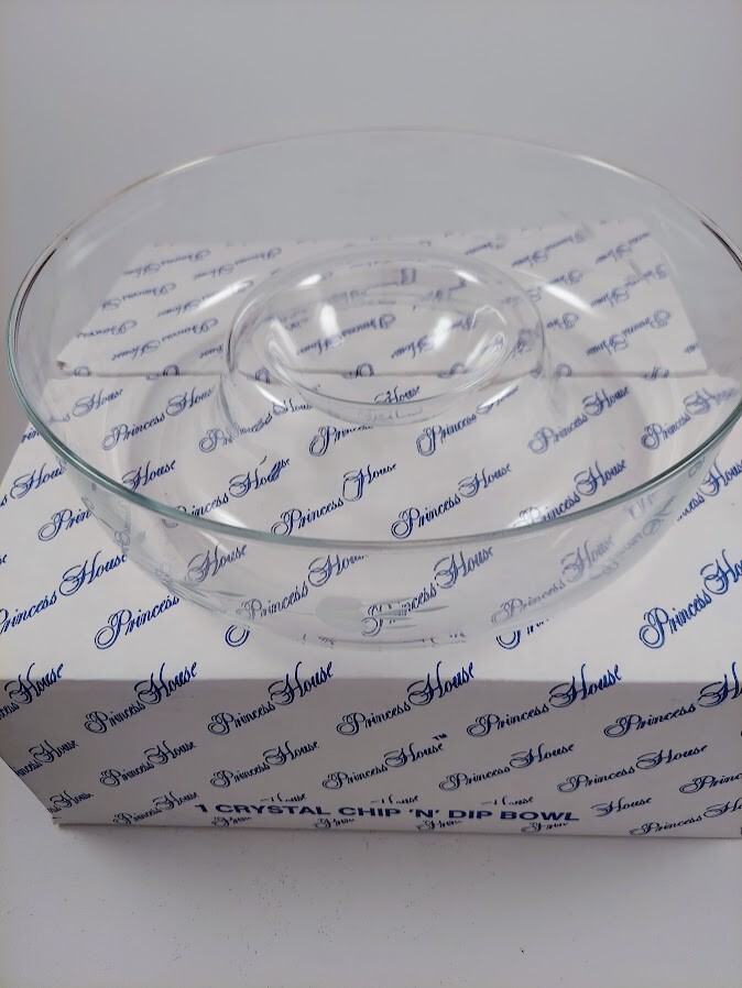 This Vintage Princess House Heritage Crystal Large Chip & Dip Bowl is a stunning piece of American-made glassware from the 1980s. The elegant design features a vintage pattern with a clear crystal material, making it perfect for serving chips and dips at parties. The large 11-1/4" diameter bowl with a depth of 3-1/4" is brand new in its original box, showcasing the intricate flowers theme of the Princess House Heritage collection. This bowl is a beautiful addition to any home, bringing a touch of vintage charm to the table. It comes to you NEW in the box with the original packaging.