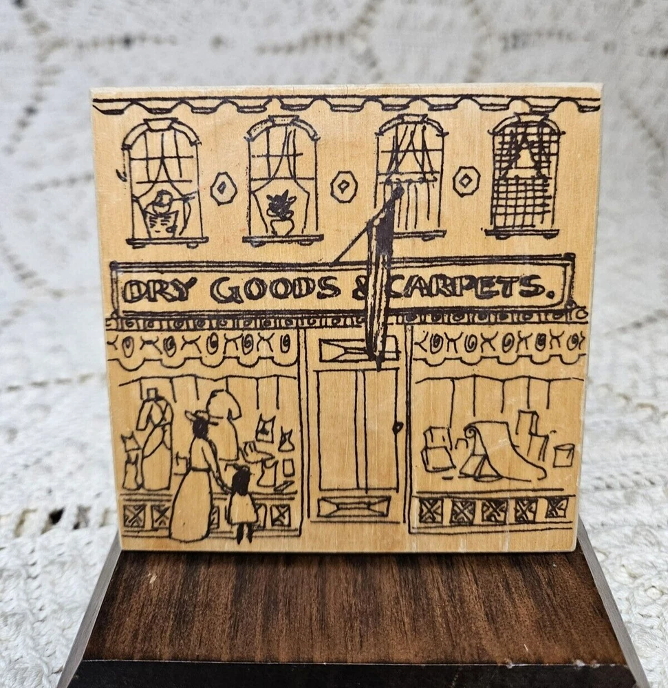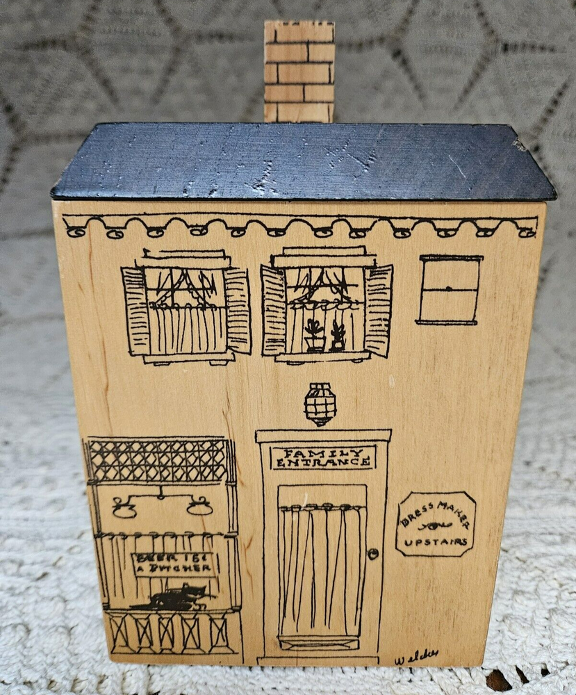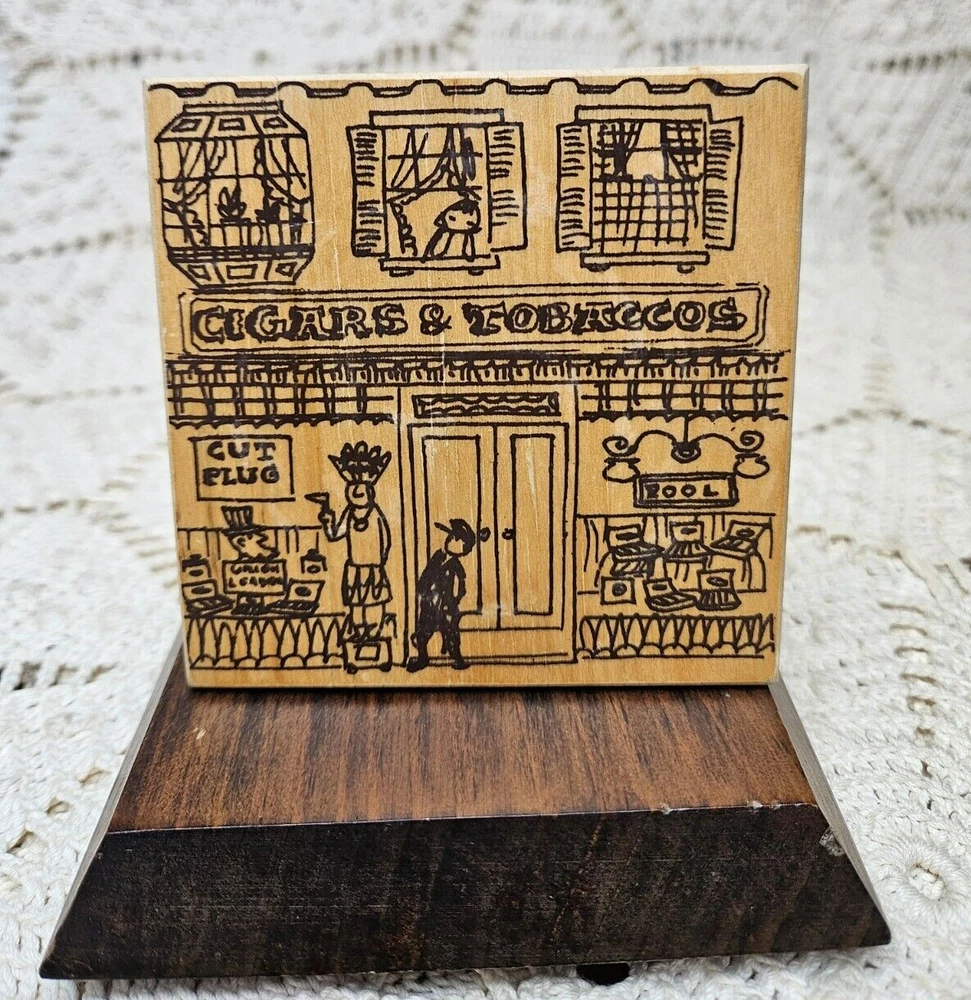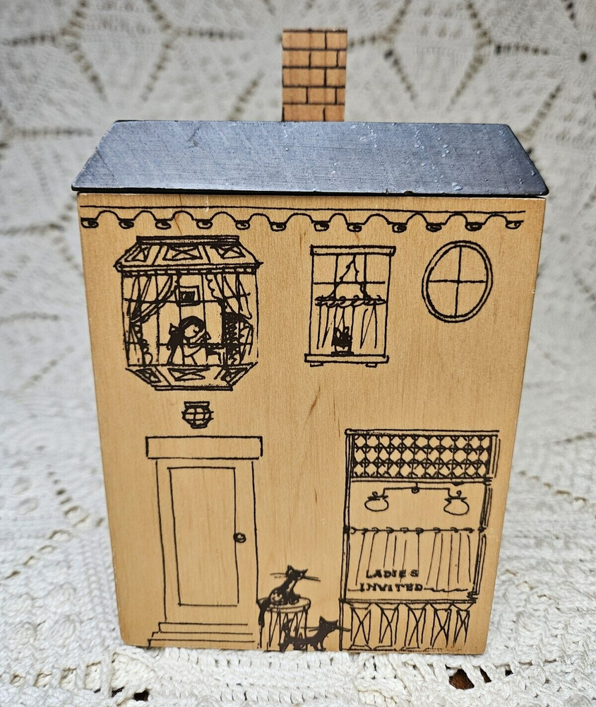 This is a fantastic whimsical coaster set featuring the art of author and illustrator Rosalind Welcher, Fisher Studios 1978. The four sides of the canister are the four sides of a lovely old saloon building. There are 12 coasters, all of which have different store fronts displayed. There are a couple small chips in the corner of the roof (lid), pictured. Only two of the coasters appear to have been used (Dry Goods & Carpets, and Cigars & Tobaccos), with some marks left on the wood from use, however the other ten coasters appear unused. Three sides on the canister feature tiny cats, while the front of the saloon has a dog trotting by. This set is a rare find with beautiful art from Rosalind Welcher in 1978! While I would like to send out pretty packages, I tend to instead utilize recycled shipping materials whenever possible in an effort to do my small part for our planet.