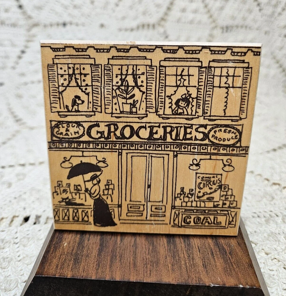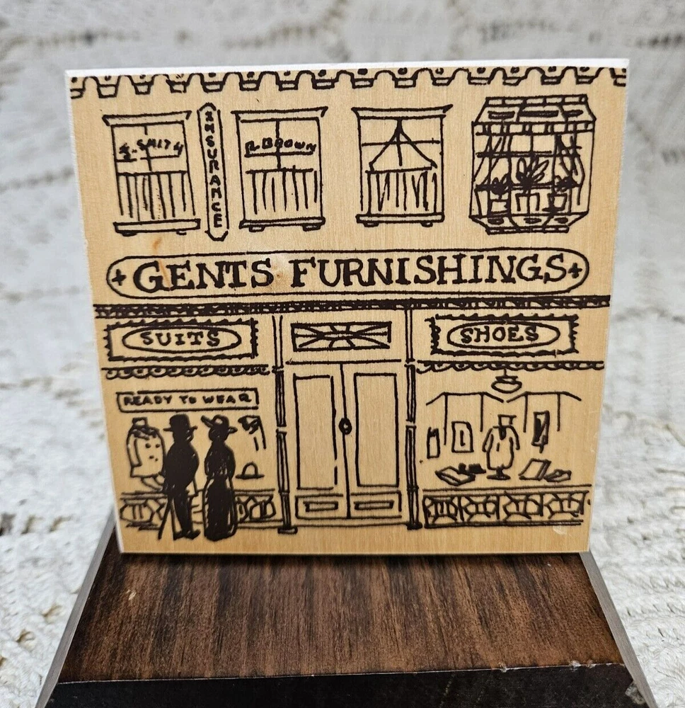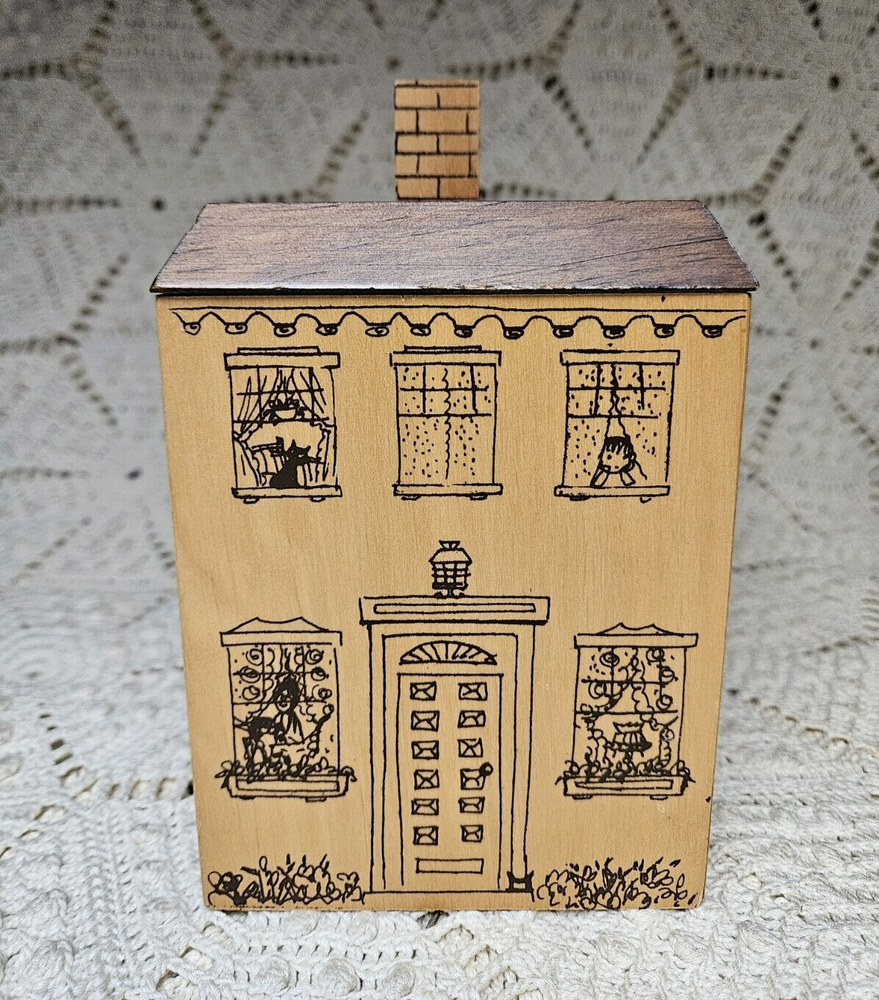 This is a fantastic whimsical coaster set featuring the art of author and illustrator Rosalind Welcher, Fisher Studios 1978. The four sides of the canister are the four sides of a lovely old saloon building. There are 12 coasters, all of which have different store fronts displayed. There are a couple small chips in the corner of the roof (lid), pictured. Only two of the coasters appear to have been used (Dry Goods & Carpets, and Cigars & Tobaccos), with some marks left on the wood from use, however the other ten coasters appear unused. Three sides on the canister feature tiny cats, while the front of the saloon has a dog trotting by. This set is a rare find with beautiful art from Rosalind Welcher in 1978! While I would like to send out pretty packages, I tend to instead utilize recycled shipping materials whenever possible in an effort to do my small part for our planet.