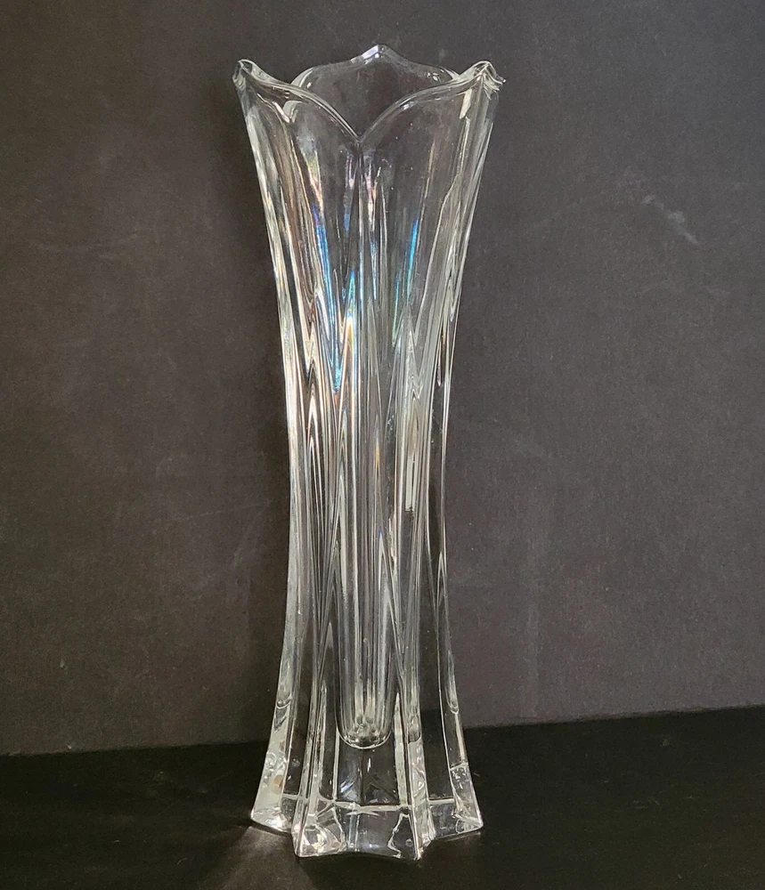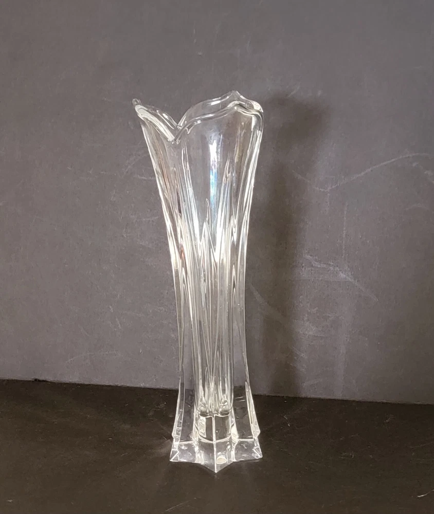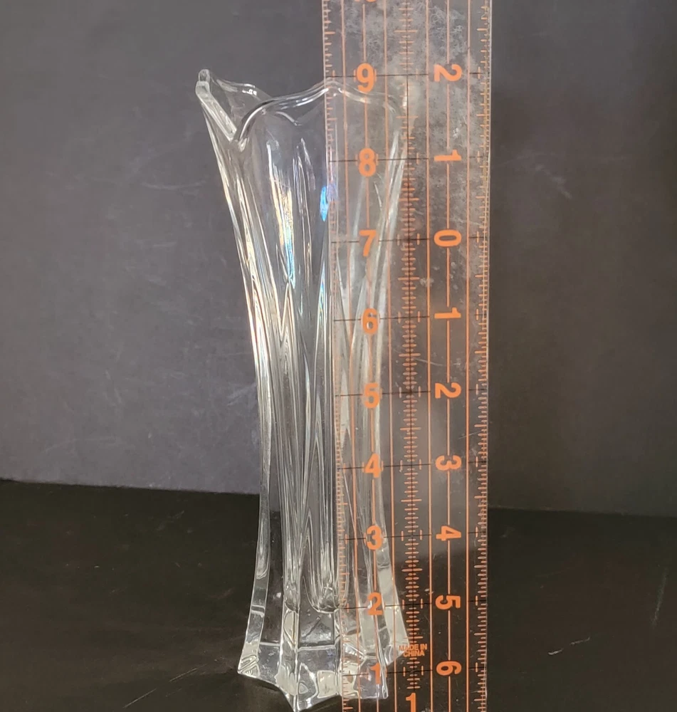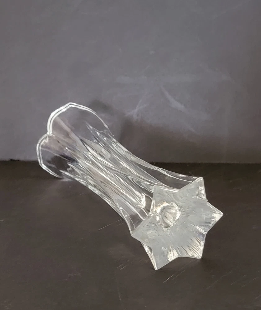 Vintage elegance to your collection with this rare Gorham German Crystal Tulip Top vase. The hand-blown, shaped, and polished glass technique gives this vase a unique and stunning appearance. The clear crystal material adds a subtle touch of sophistication to any room. The vase shows a touch of iridescence when hit by natural light. This mid-20th century vase features a tulip top design with six blades that taper down to a star of David base. The vase stands at 9 inches tall and is an original, studio-crafted piece from Germany. Art deco style and very rare at this price.
