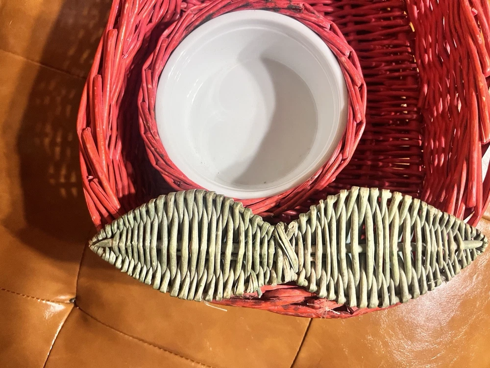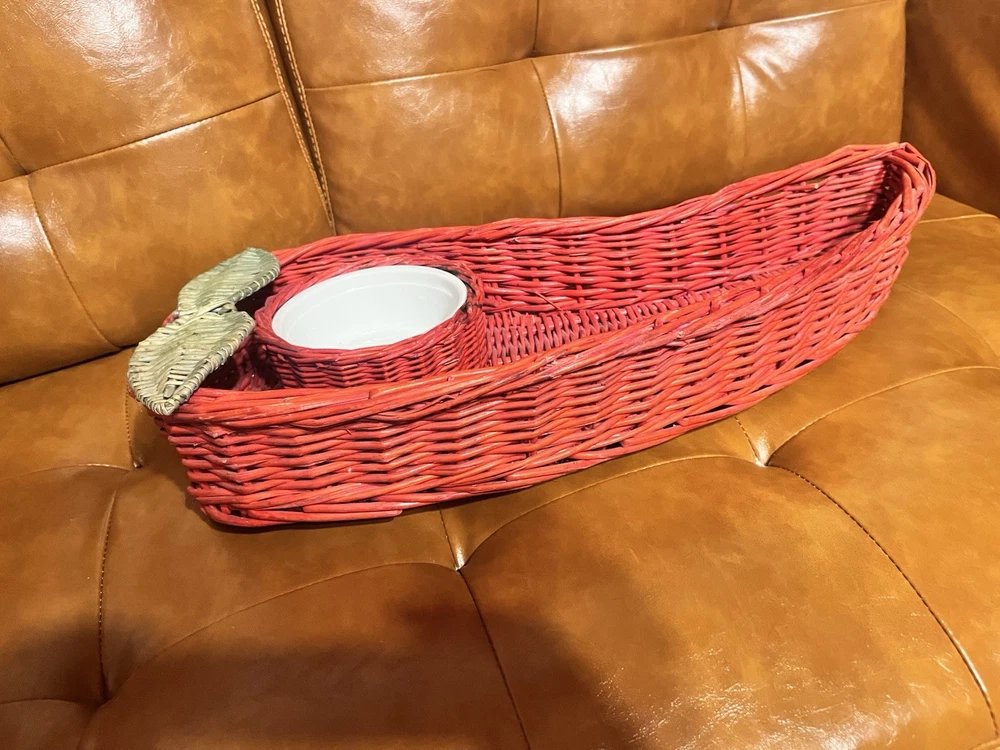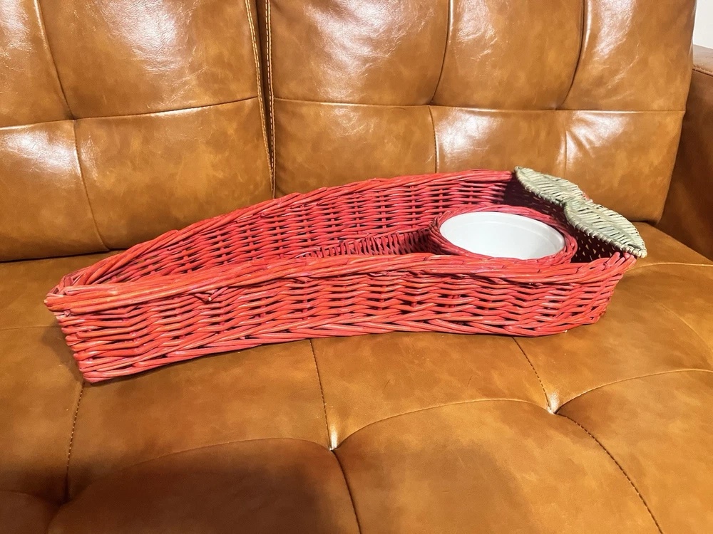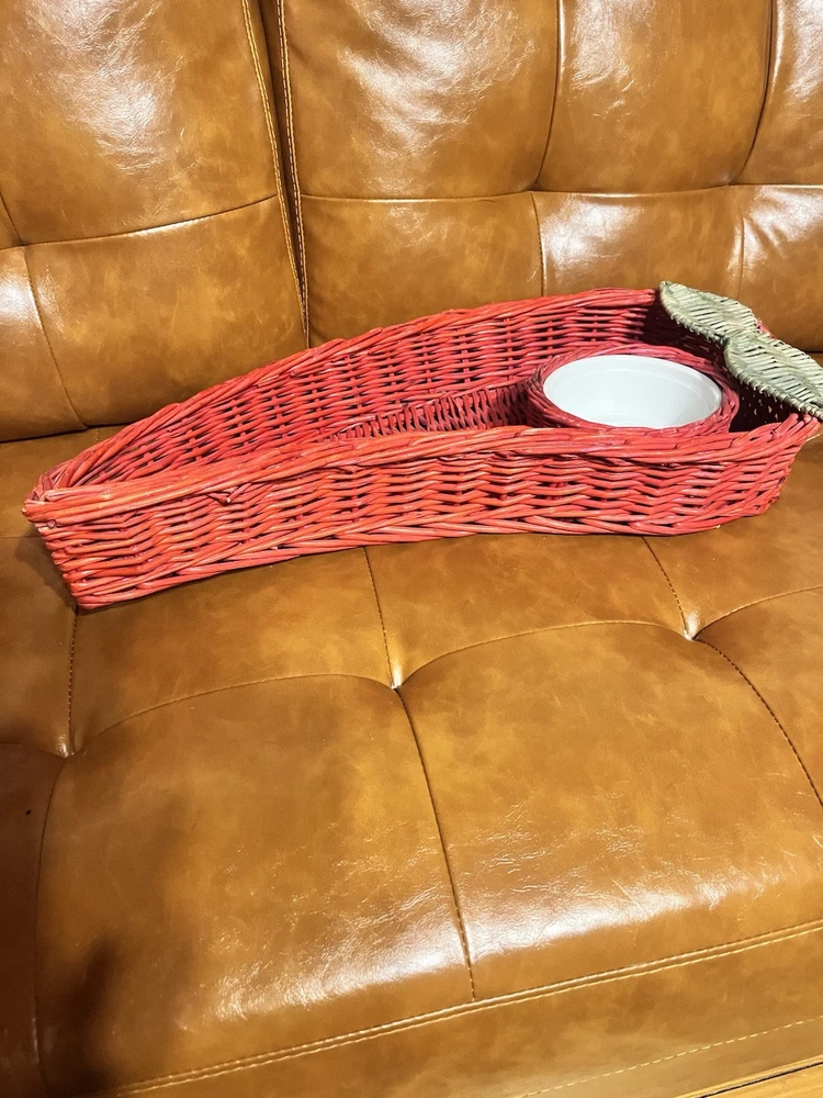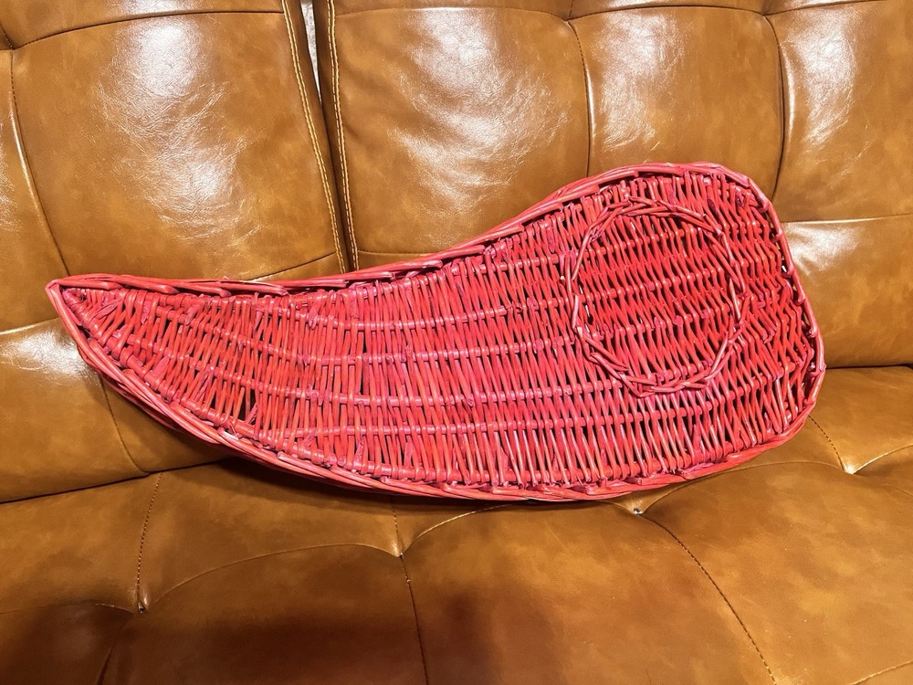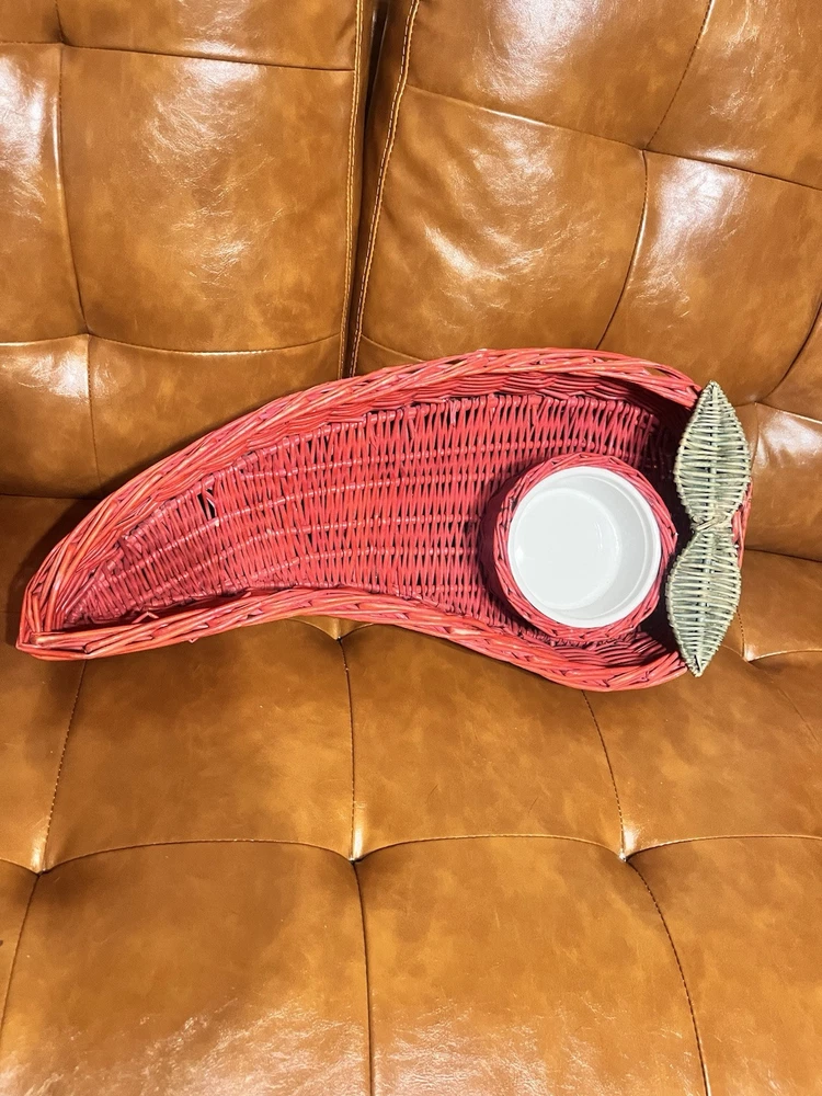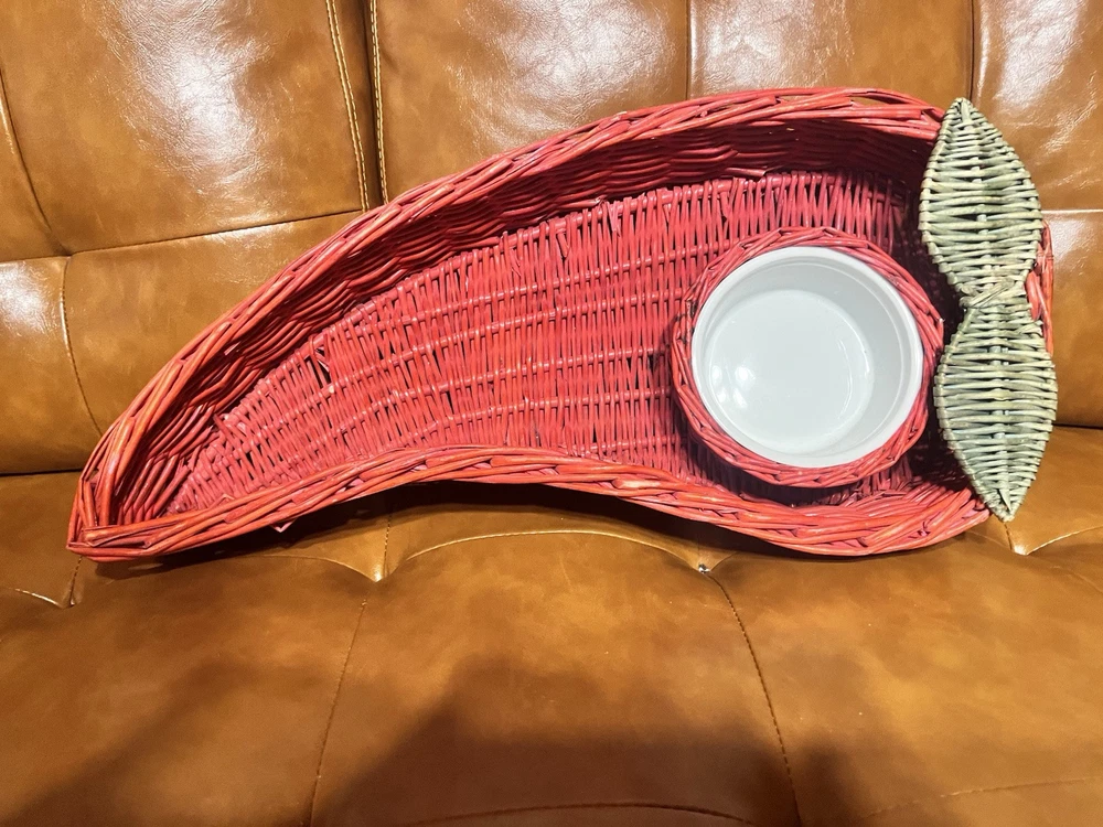 This vintage serving tray set includes two large red hot chili pepper-shaped baskets made of wicker rattan, paired with white ceramic dip bowls. The bohemian style design from the 1980s features a unique and decorative touch, perfect for use as a wall display or serving guests at gatherings. The bold red color and playful chili pepper shape add a fun and vibrant element to any home decor or collectibles display.