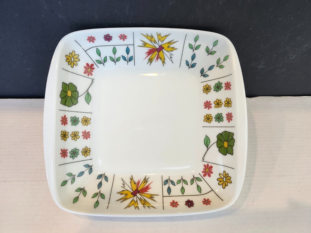 This vintage dish measures about 5 3/4 inches square. It's in excellent vintage condition - no chips or cracks. The colors are bright and the surface is perfect.