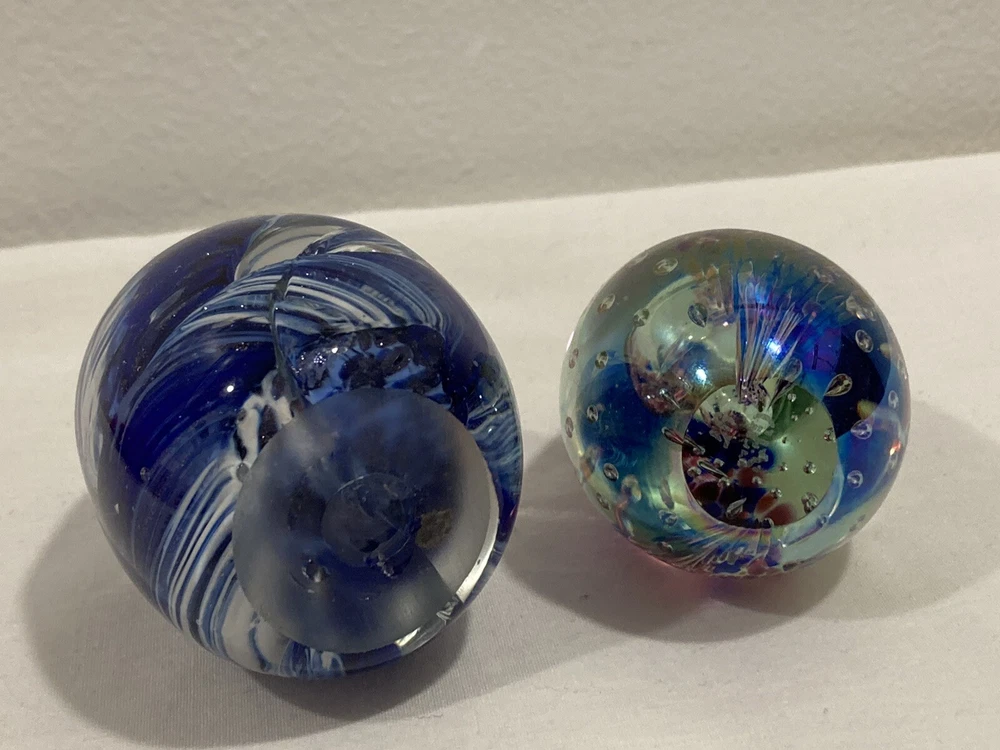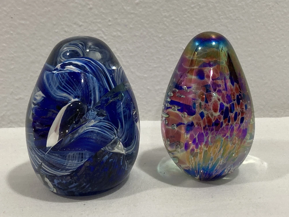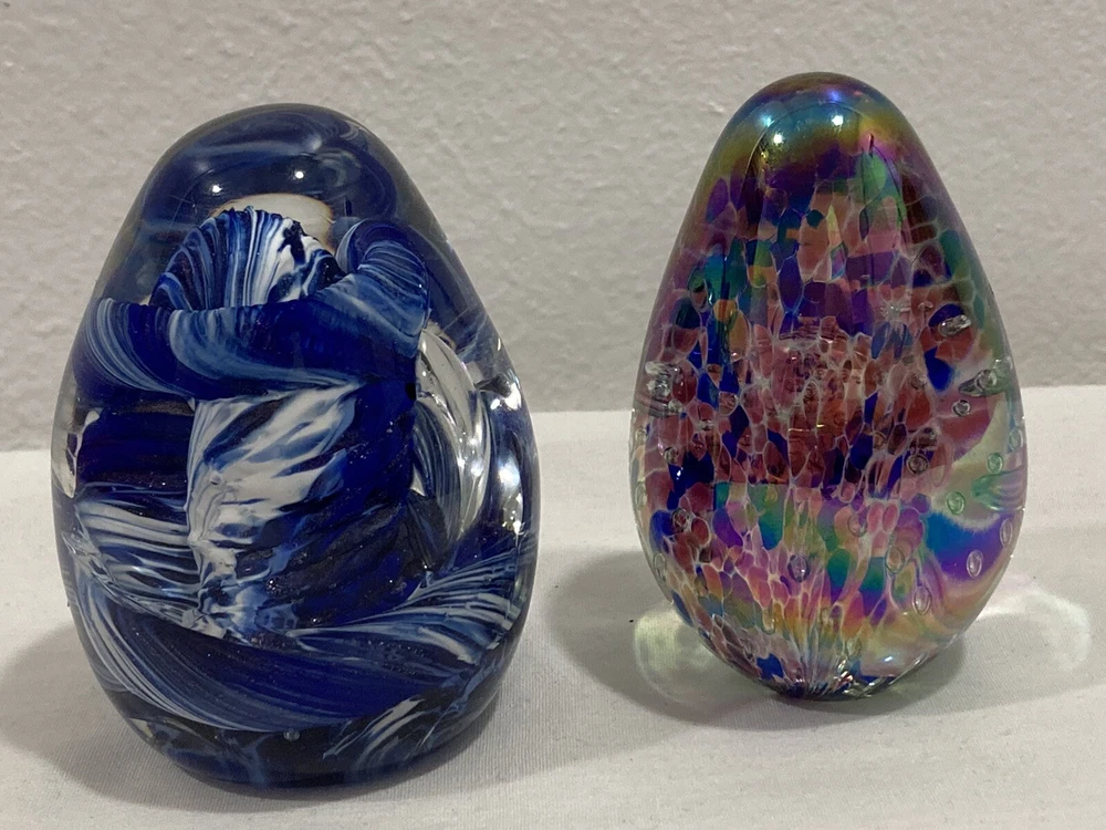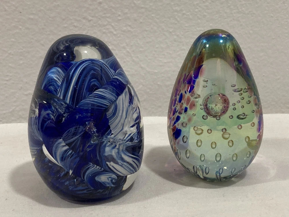 ITEM: Vintage Studio Artist Signed Blue, White and Clear Abstract Swirl Design and GES 97 Multicolor Control Trapped Bubble Style Egg Shaped ART GLASS PAPERWEIGHT ----MIX LOT OF 2---- DESCRIPTION : Nice Studio hand blown artist signed abstract blue, white and clear swirl design egg shaped paperweight with a signature that is short and hard to read the first letter looks like an O or a D. Interesting design that has almost a broken, cracked or shattered look on the interior. Also a signed " GES 97" multi-color control bubble translucent style egg shaped paperweight. Nice mixed lot of 2. This would make a great display piece, resell in your shop, collection, paperweight, wonderful gift, or for other personal use or decor! MEASUREMENTS: Approx. GES on is 2 3/4" inches tall by 1 3/4" inches across with a 3/4" diameter base The artist signed one is 3" inches tall and 2" inches across with a 1 1/4" inch diameter base CONDITION: Good pre-owned condition on the pair. Just noticed a few very small surface scratches/marks/scuffs. Perhaps some light surface marks, wear, scratches/scuffs, and general wear and imperfections from age and prior use. Nice pieces with no significant flaws like chips, cracks, breaks, or repairs, etc. Please see ALL photos for details on item and condition. I sell items the way I find them and suggest all items be cleaned, dusted, polished, buffed, etc. PAYMENT: I accept PAYPAL ONLY and item must be paid for within 72 hours (3 days) or an unpaid item case will be started. I have to file a case to get back the seller fees and re-list the item. If you need more time for any reason just contact me and let me know what is going on. Also, eBay now adds and collects sales tax automatically to orders depending on which state you are in. SHIPPING: Will ship to USA ONLY. NO INTERNATIONAL SHIPPING AT THIS TIME SORRY . If you are outside the US the order/bid will be cancelled immediately. Will combine shipping for multiple purchased items so please wait for my invoice before checkout. I ship USPS PRIORITY or FIRST CLASS MAIL depending on size of item. INSURANCE is included in the shipping costs. I ship through eBay so will only ship to address on the purchaser account. Will ship within Two Business Days although in most cases it will ship the next day. I upload all tracking information so you can watch the item in transit. I use bubble wrap and ship items as if I was sending them to myself with care. I am located in Boise, IDAHO. RETURNS: Due to the nature of items that I sell I have a NO RETURN POLICY . Please check detailed description and see all photos before purchasing or bidding on an item. Also, ask any questions you may have ahead of time. I do my best to describe things accurately and upload many photos from many different perspectives to show and highlight the item for what it is. I would only consider a return if I grossly misrepresented the item or sent the wrong thing. Please keep in mind in most cases I am selling a vintage/antique item that has patina and some type of condition issues. If you are looking for new modern throw away junk with free shipping and free returns please shop on Amazon. BUY IT NOW vs. AUCTION : I do both but if an item is an auction it will stay that way so please do not ask what the BIN is for an auction. I like to give everyone a fair shot at getting the item. If an item is a BUY IT NOW please send your best offer in the worst that can happen is a counter offer. I am on here to sell items and make people happy I am not trying to be an over priced crazy person :) so please let me know what you think is a fair price if I am too high on something. FEEDBACK: Positive feedback is very important to me and the eBay community. If you are not happy for any reason please contact me immediately and we can resolve the issue. ------------------------------------------------------------------------------------------------------------------------------------------------------------------------------------------------------------------------------------------------------------------------------------------------------------------------------------------------------------------------------------------------------------------------------------------------------------------------------------------------------------------------------------------------------------------------------------------------------------------------------------------------------------------------------------------------------------------------------------------------ ABOUT ME: When I was young I was a big time collector and enjoyed collecting baseball cards, comic books, video games, etc. My father was a bottle and rock collector and later in his life he enjoyed reselling antiques as well. My great grandfather had a Museum in New Hampshire and was also a big time collector in his day, so in short this is in my DNA. I am passionate about what I do and love hunting for rare and obscure items that I think others will love as well. I consider myself a collector for collectors and what I mean by that is I enjoy finding and selling things that are rare and desired by others. I also know as a collector that you always want to get a deal on the item that you have been looking for, so this is what I am trying to do here on eBay. I am a long time member with a great feedback score and am trustworthy and honest. If you see any mistakes or errors in the listing please let me know and I will fix it, I am by no means an expert on everything that I sell. I love doing $9.95 auctions with no reserve and whenever possible enjoy listing mixed lots. Please check my eBay Store as well and if you have any questions or concerns please just email me through eBay mail thanks!