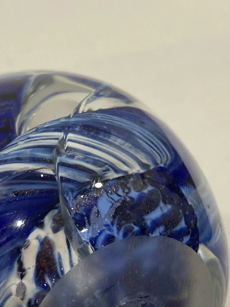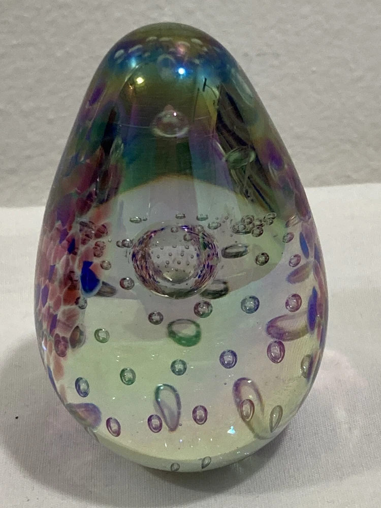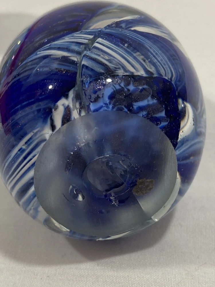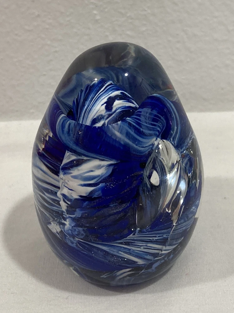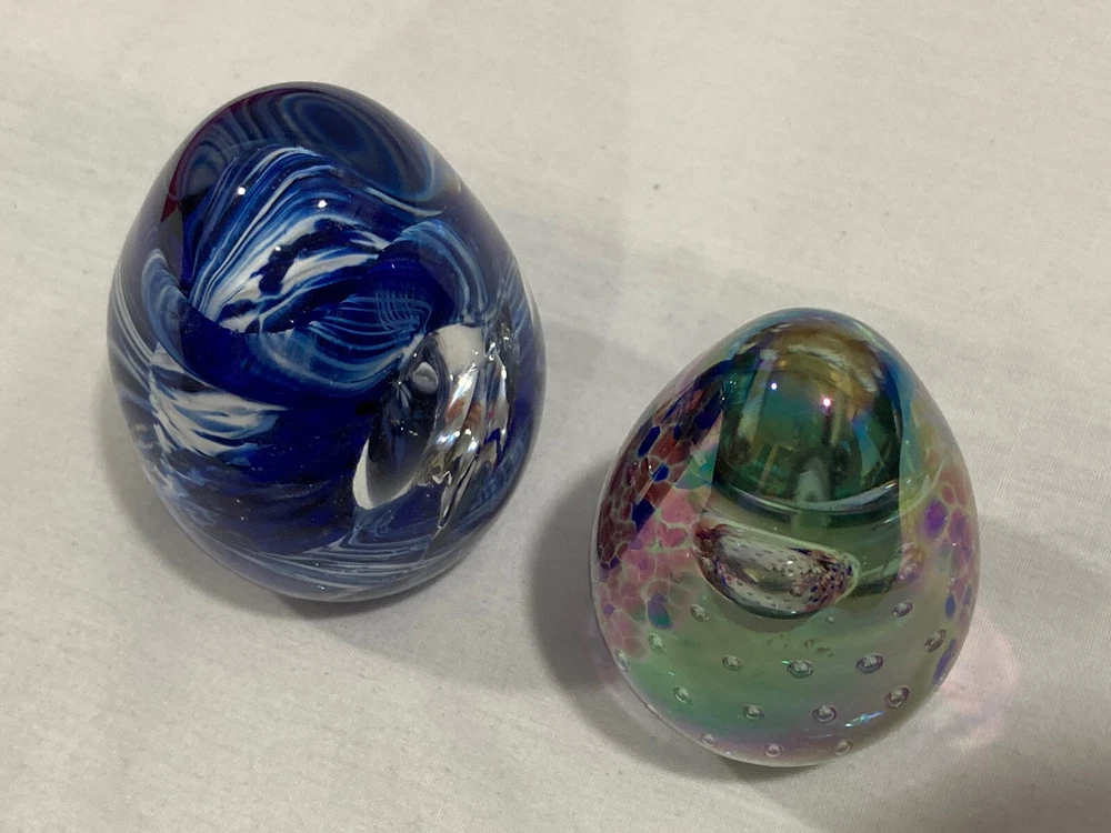 ITEM: Vintage Studio Artist Signed Blue, White and Clear Abstract Swirl Design and GES 97 Multicolor Control Trapped Bubble Style Egg Shaped ART GLASS PAPERWEIGHT ----MIX LOT OF 2---- DESCRIPTION : Nice Studio hand blown artist signed abstract blue, white and clear swirl design egg shaped paperweight with a signature that is short and hard to read the first letter looks like an O or a D. Interesting design that has almost a broken, cracked or shattered look on the interior. Also a signed " GES 97" multi-color control bubble translucent style egg shaped paperweight. Nice mixed lot of 2. This would make a great display piece, resell in your shop, collection, paperweight, wonderful gift, or for other personal use or decor! MEASUREMENTS: Approx. GES on is 2 3/4" inches tall by 1 3/4" inches across with a 3/4" diameter base The artist signed one is 3" inches tall and 2" inches across with a 1 1/4" inch diameter base CONDITION: Good pre-owned condition on the pair. Just noticed a few very small surface scratches/marks/scuffs. Perhaps some light surface marks, wear, scratches/scuffs, and general wear and imperfections from age and prior use. Nice pieces with no significant flaws like chips, cracks, breaks, or repairs, etc. Please see ALL photos for details on item and condition. I sell items the way I find them and suggest all items be cleaned, dusted, polished, buffed, etc. PAYMENT: I accept PAYPAL ONLY and item must be paid for within 72 hours (3 days) or an unpaid item case will be started. I have to file a case to get back the seller fees and re-list the item. If you need more time for any reason just contact me and let me know what is going on. Also, eBay now adds and collects sales tax automatically to orders depending on which state you are in. SHIPPING: Will ship to USA ONLY. NO INTERNATIONAL SHIPPING AT THIS TIME SORRY . If you are outside the US the order/bid will be cancelled immediately. Will combine shipping for multiple purchased items so please wait for my invoice before checkout. I ship USPS PRIORITY or FIRST CLASS MAIL depending on size of item. INSURANCE is included in the shipping costs. I ship through eBay so will only ship to address on the purchaser account. Will ship within Two Business Days although in most cases it will ship the next day. I upload all tracking information so you can watch the item in transit. I use bubble wrap and ship items as if I was sending them to myself with care. I am located in Boise, IDAHO. RETURNS: Due to the nature of items that I sell I have a NO RETURN POLICY . Please check detailed description and see all photos before purchasing or bidding on an item. Also, ask any questions you may have ahead of time. I do my best to describe things accurately and upload many photos from many different perspectives to show and highlight the item for what it is. I would only consider a return if I grossly misrepresented the item or sent the wrong thing. Please keep in mind in most cases I am selling a vintage/antique item that has patina and some type of condition issues. If you are looking for new modern throw away junk with free shipping and free returns please shop on Amazon. BUY IT NOW vs. AUCTION : I do both but if an item is an auction it will stay that way so please do not ask what the BIN is for an auction. I like to give everyone a fair shot at getting the item. If an item is a BUY IT NOW please send your best offer in the worst that can happen is a counter offer. I am on here to sell items and make people happy I am not trying to be an over priced crazy person :) so please let me know what you think is a fair price if I am too high on something. FEEDBACK: Positive feedback is very important to me and the eBay community. If you are not happy for any reason please contact me immediately and we can resolve the issue. ------------------------------------------------------------------------------------------------------------------------------------------------------------------------------------------------------------------------------------------------------------------------------------------------------------------------------------------------------------------------------------------------------------------------------------------------------------------------------------------------------------------------------------------------------------------------------------------------------------------------------------------------------------------------------------------------------------------------------------------------ ABOUT ME: When I was young I was a big time collector and enjoyed collecting baseball cards, comic books, video games, etc. My father was a bottle and rock collector and later in his life he enjoyed reselling antiques as well. My great grandfather had a Museum in New Hampshire and was also a big time collector in his day, so in short this is in my DNA. I am passionate about what I do and love hunting for rare and obscure items that I think others will love as well. I consider myself a collector for collectors and what I mean by that is I enjoy finding and selling things that are rare and desired by others. I also know as a collector that you always want to get a deal on the item that you have been looking for, so this is what I am trying to do here on eBay. I am a long time member with a great feedback score and am trustworthy and honest. If you see any mistakes or errors in the listing please let me know and I will fix it, I am by no means an expert on everything that I sell. I love doing $9.95 auctions with no reserve and whenever possible enjoy listing mixed lots. Please check my eBay Store as well and if you have any questions or concerns please just email me through eBay mail thanks!