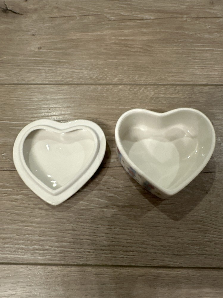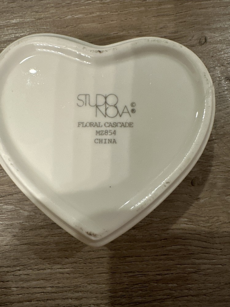 This vintage Studio Nova trinket box is a beautiful addition to any collection. The heart-shaped white porcelain box features an art nouveau style with a glossy finish and a delicate floral pattern. The box comes boxed in its original packaging and is ready to display in any room. Perfect for all occasions, this ceramic trinket box is great for storing small items and makes a lovely gift for adults who love flowers and hearts. The box is from the original Studio Nova collection and is an original piece made in China. Add this charming trinket box to your collection today!