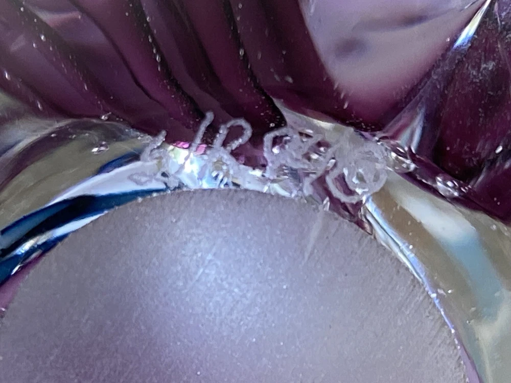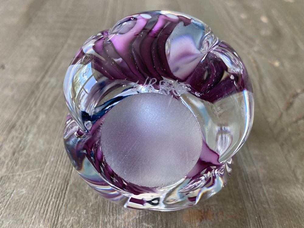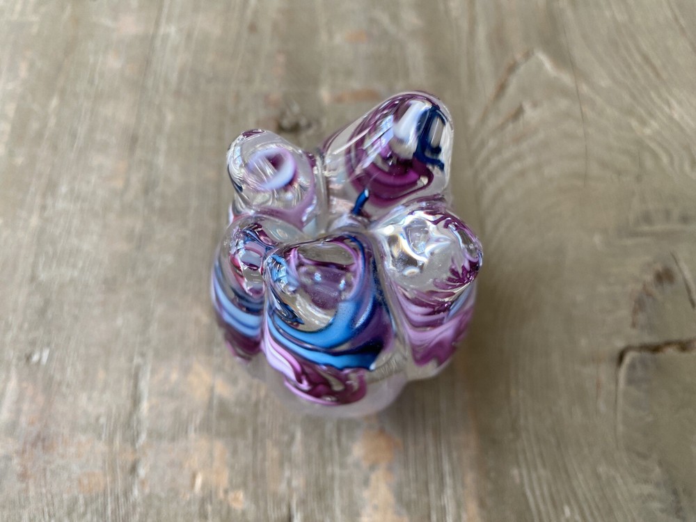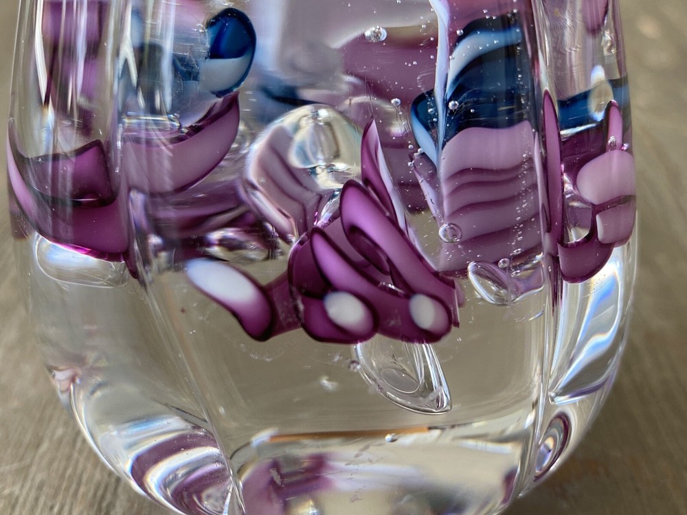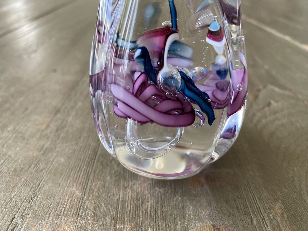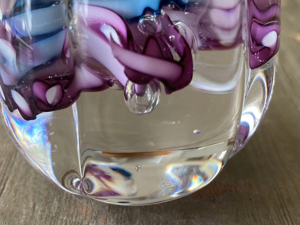 This glass paperweight weighs 1lb before packaging. The paperweight measures 3 1/2" tall and 2 1/4" in diameter at the base. This is a vintage 1994 Schmidt Rhea art glass paperweight. It is in the shape of a tulip, with 5 petals emerging. Inside the clear glass are swirls of blues and pinks. It is a stunning color combination. This piece is signed and dated on the bottom: "S/R 94". There are no chips or cracks on this piece. It is in excellent condition. Absolutely beautiful. Thanks for looking! Follow me on eBay & Instagram @KellysVintagePicks