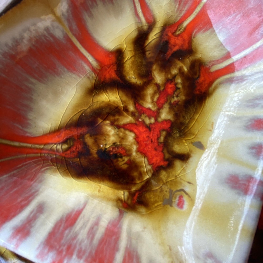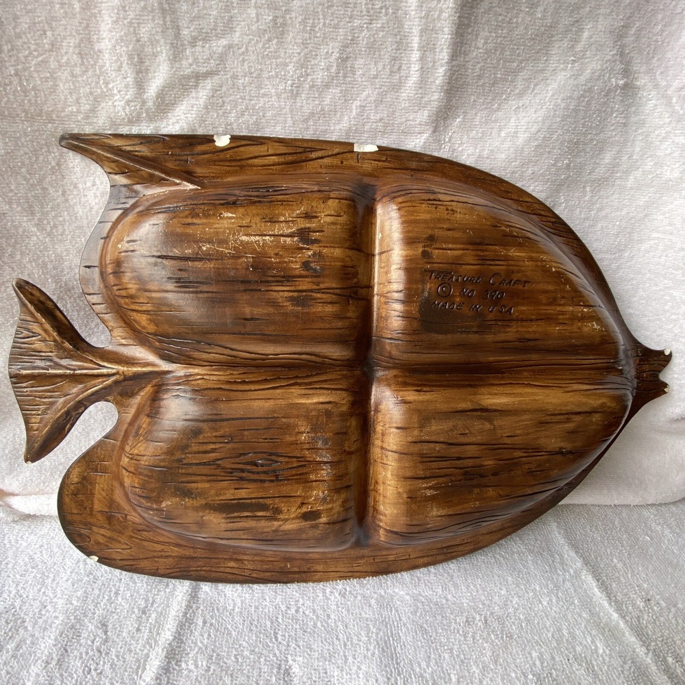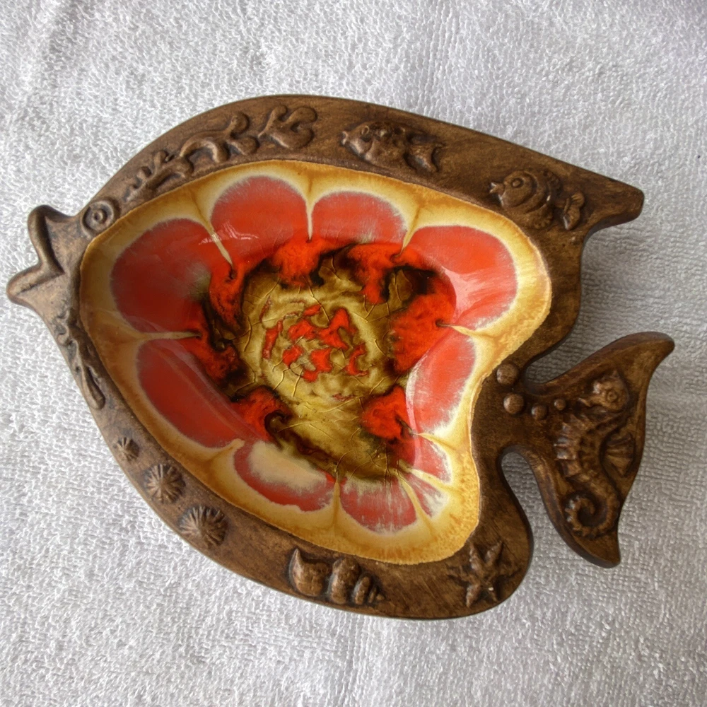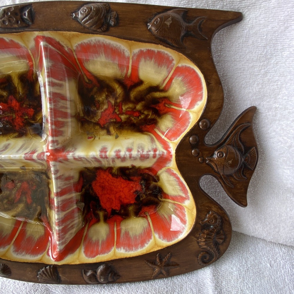 Vintage Treasured Craft ceramic glazed fish shaped tray. Large 4 sectioned tray and small dip dish. Glazed fronts with red yellows and browns. On back, Smalls chips. See photos. Made in USA.