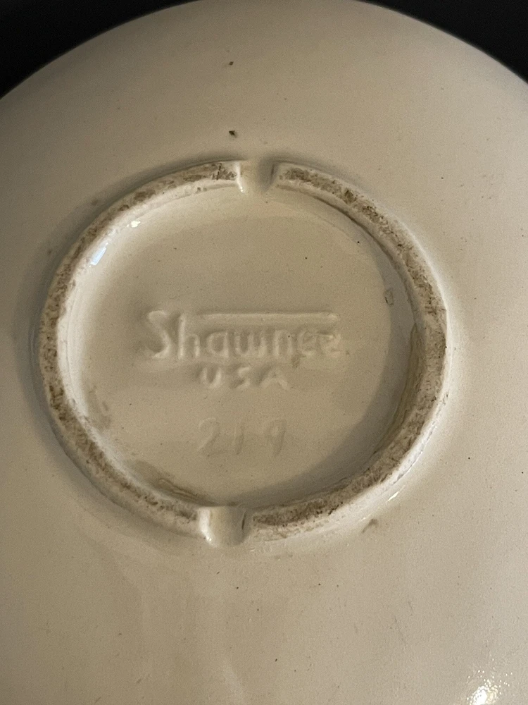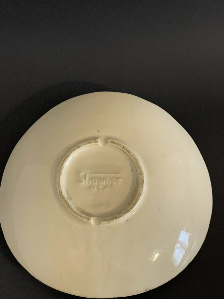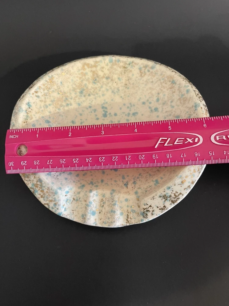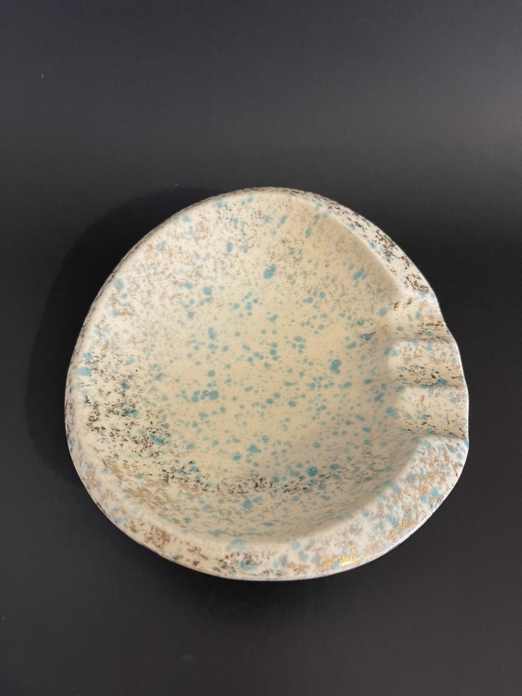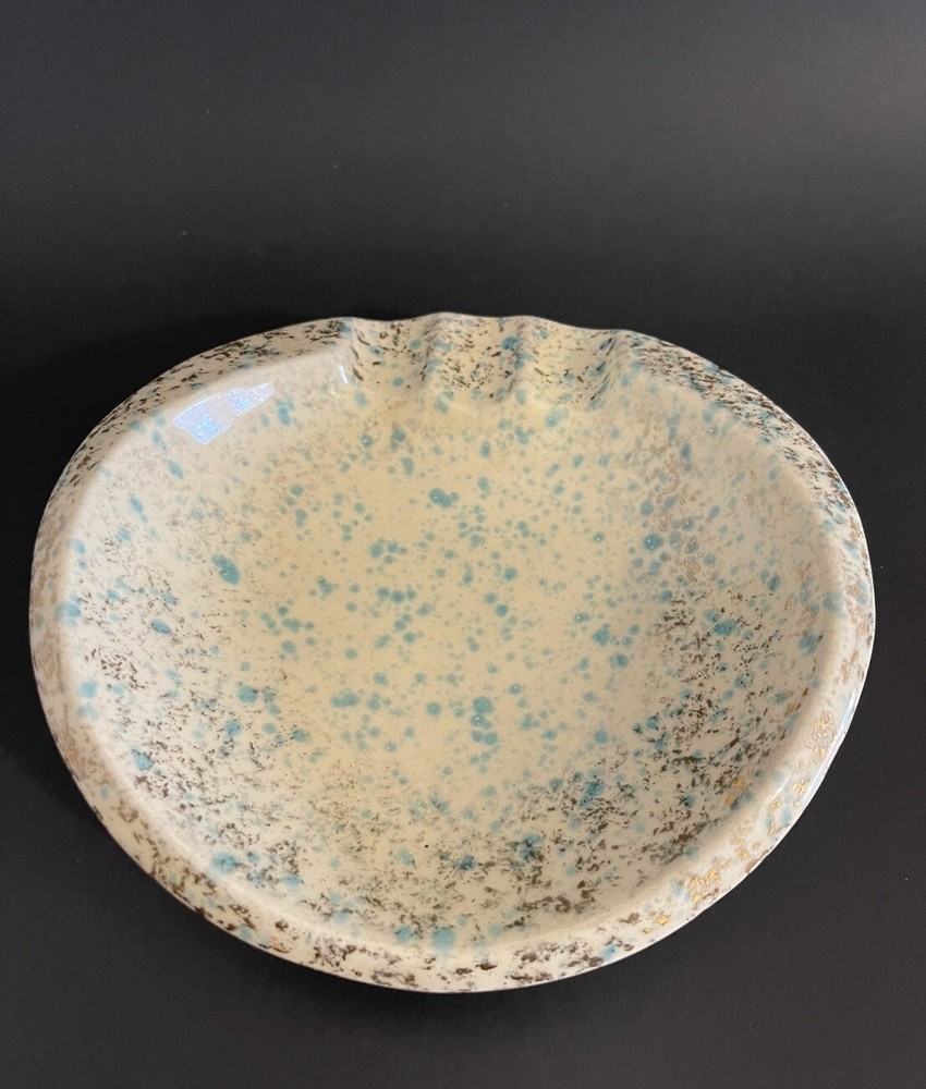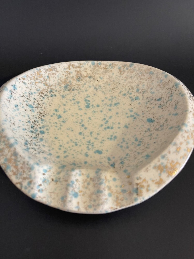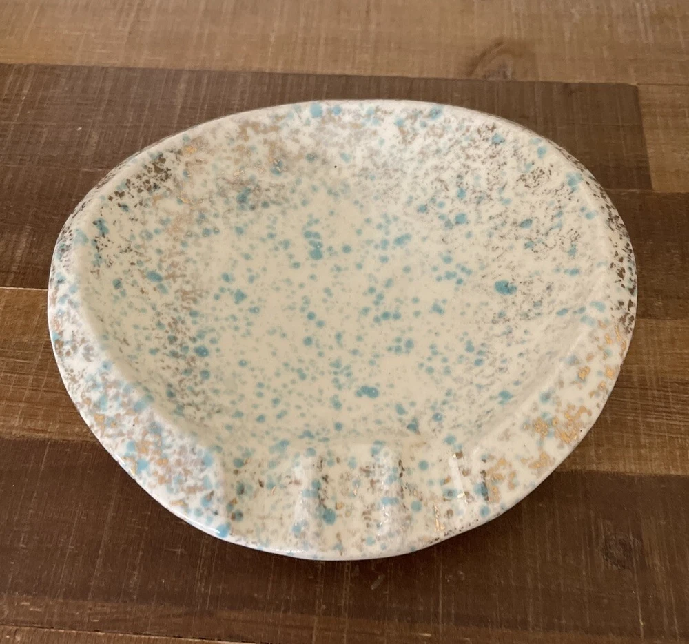 For sale is a vintage Shawnee Pottery ashtray from the Studio Hostess Line, measuring 6 1/2 inches in a beautiful ice blue color. This piece was produced using the art pottery technique in the United States and has an impressed backstamp. It is suitable for holding cigarettes and features a unique mid-century modern style with houses and architecture theme. This Shawnee pottery item could be used as a trinket dish.