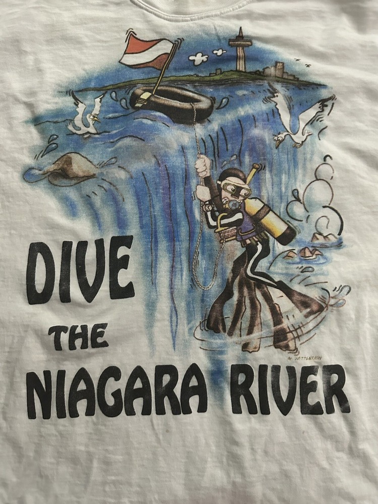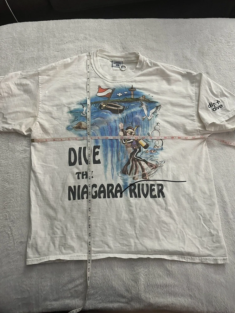 Get yourself a unique piece of vintage clothing with this Signal Sports Dip Dive Niagara Falls '92 graphic t-shirt. This white t-shirt features a crew neckline and short sleeves, making it a perfect addition to your summer or spring wardrobe. The t-shirt is made of comfortable cotton, ensuring a regular fit that's perfect for any sports-themed event. Distressed neck