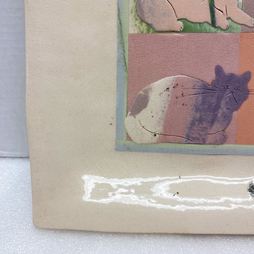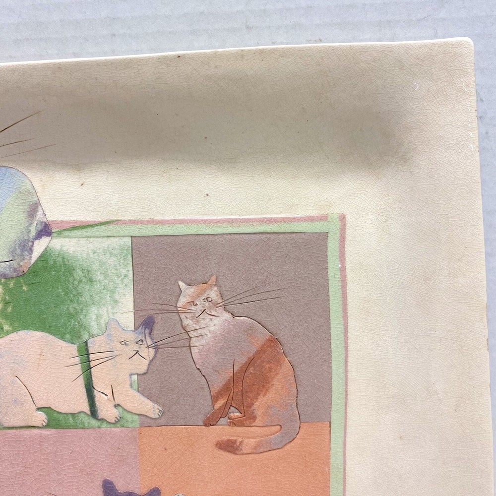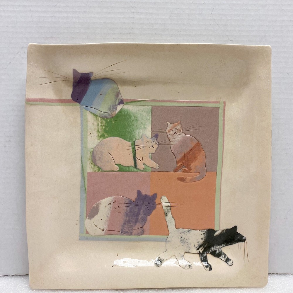Vintage Signed Kamrass Kiok NYC Studio Pottery Cat Square Platter Plate 11.5”. MCM abstract feline five cats cat art deco plate platter server artisan decorative catch all trinket tray. Cosmetic wear includes crazing, various marks to edges and top and bottom surfaces. Please refer to detailed photos for more information on wear. The Signed Kamrass Kiok NYC Studio Pottery Cat Square Platter is a unique and eye-catching piece of functional art. Handcrafted in the Kiok NYC Studio, this platter features a charming cat design that adds a playful touch to any table or display. The platter is made of high-quality pottery and is signed by the artist, Kamrass Kiok, adding to its authenticity and value. Its square shape adds a modern and contemporary flair to the design. This platter is not only a functional serving piece but also a statement piece that showcases the creativity and craftsmanship of the artist.