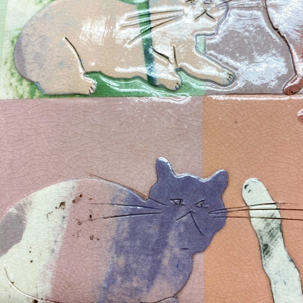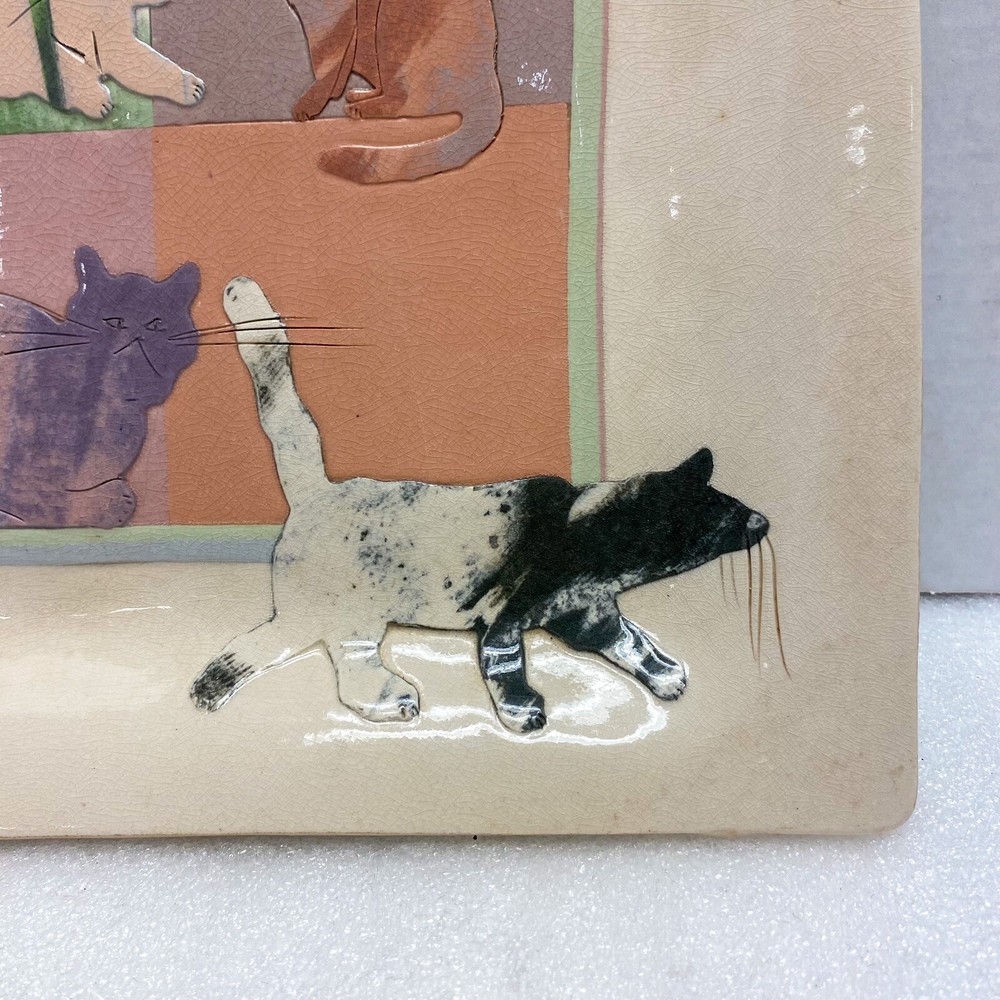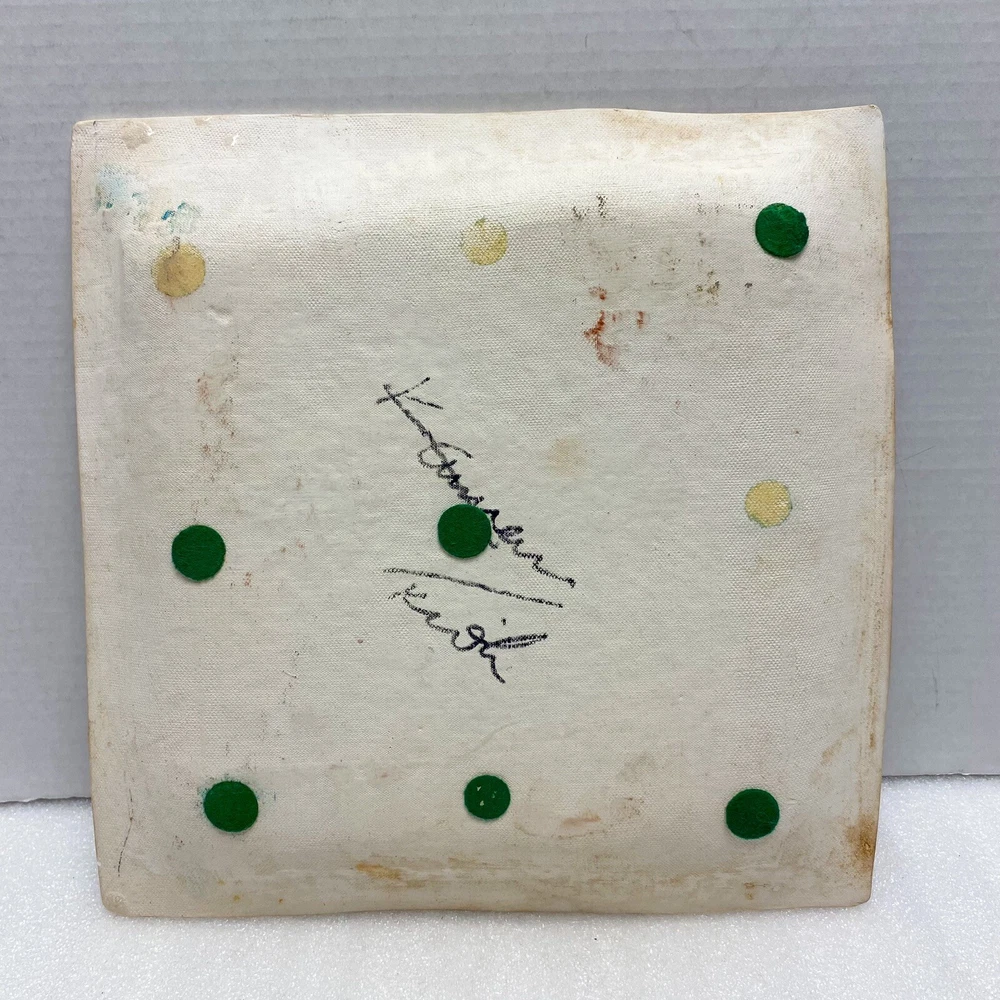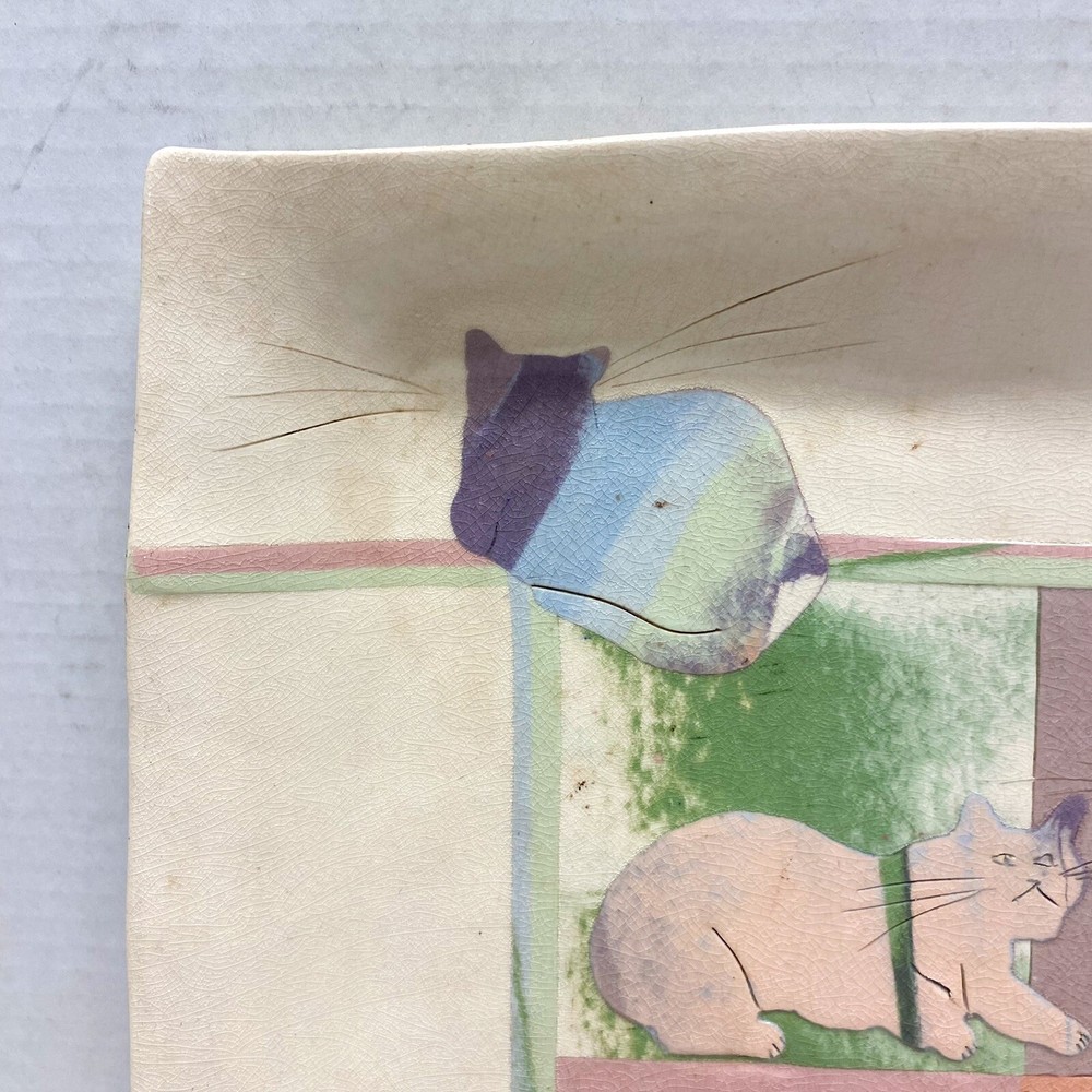 Vintage Signed Kamrass Kiok NYC Studio Pottery Cat Square Platter Plate 11.5”. MCM abstract feline five cats cat art deco plate platter server artisan decorative catch all trinket tray. Cosmetic wear includes crazing, various marks to edges and top and bottom surfaces. Please refer to detailed photos for more information on wear. The Signed Kamrass Kiok NYC Studio Pottery Cat Square Platter is a unique and eye-catching piece of functional art. Handcrafted in the Kiok NYC Studio, this platter features a charming cat design that adds a playful touch to any table or display. The platter is made of high-quality pottery and is signed by the artist, Kamrass Kiok, adding to its authenticity and value. Its square shape adds a modern and contemporary flair to the design. This platter is not only a functional serving piece but also a statement piece that showcases the creativity and craftsmanship of the artist.