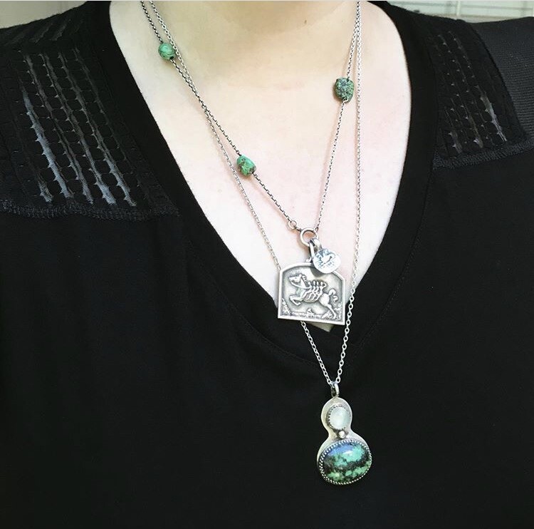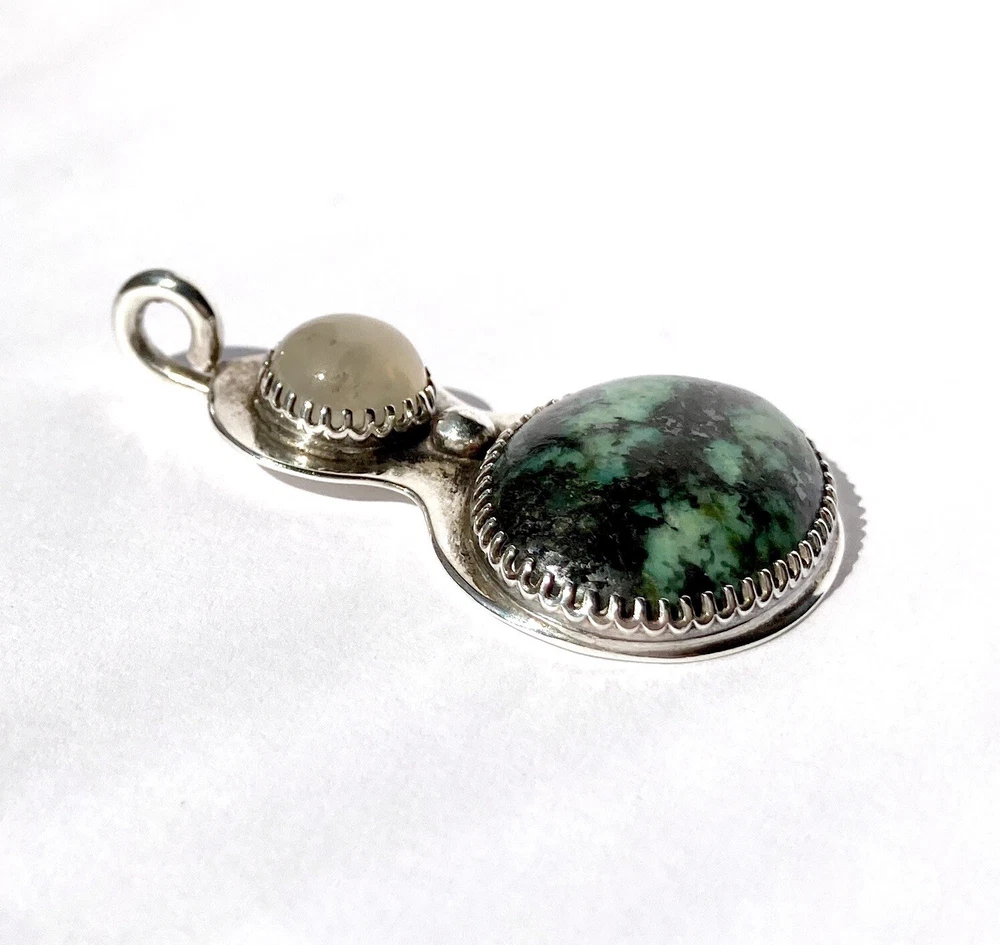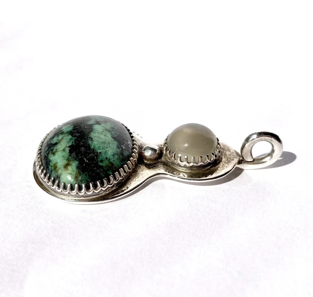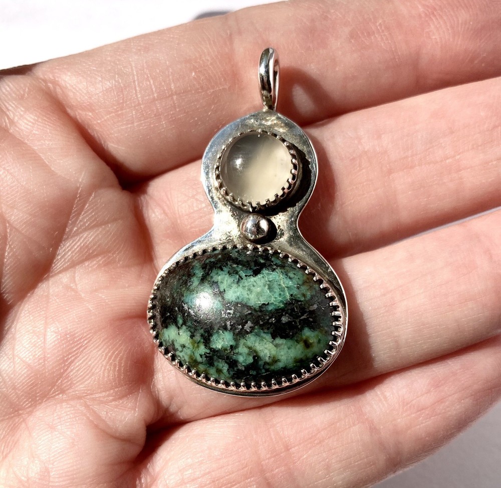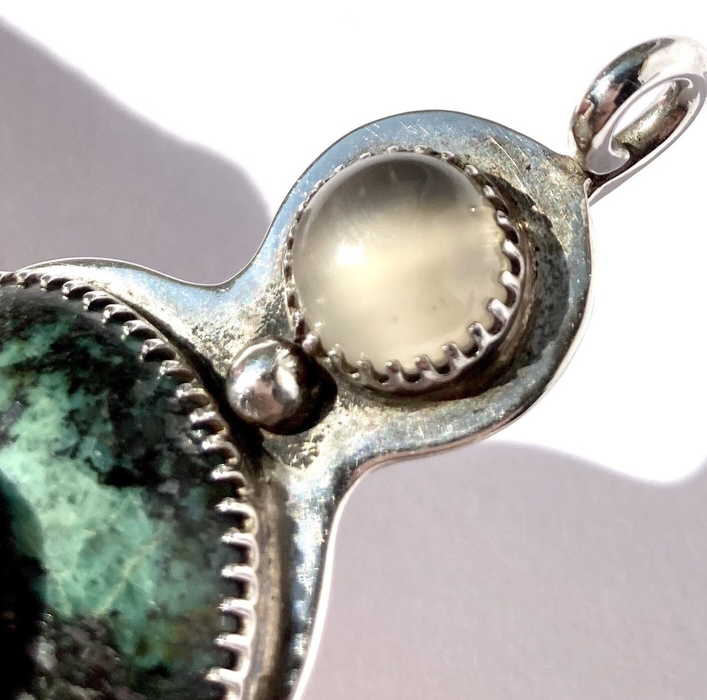 *Listing is for the pendant only.* For your consideration, a cool vintage sterling silver turquoise pendant. Studio made, unsigned, I suspect it’s Navajo in origin. The white stone looks like white chalcedony or moonstone. Overall good condition with mild wear. Measures 1.75 inches in length with the bail, 1.5 inches in length without the bail, and 1 inch in width. Weight 11.7 grams.