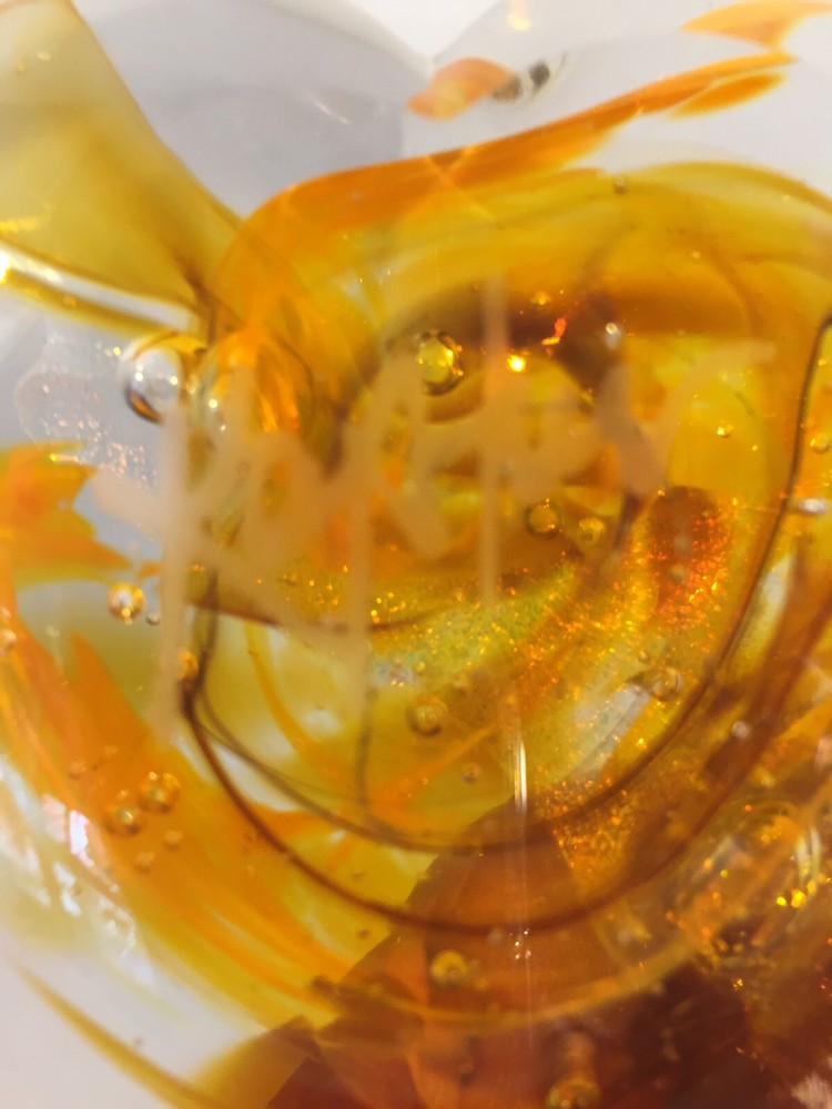 BEAUTIFUL MECHELE KAPTUR SIGNED HEART SHAPED BLOWN GLASS PAPERWEIGHT. AMBER LIGHT GOLD COLOR WITH AN IRIDESCENT WAVE DESIGN. MEASURES 4" X 4" X 1 1/2". EXCELLENT CONDITION....