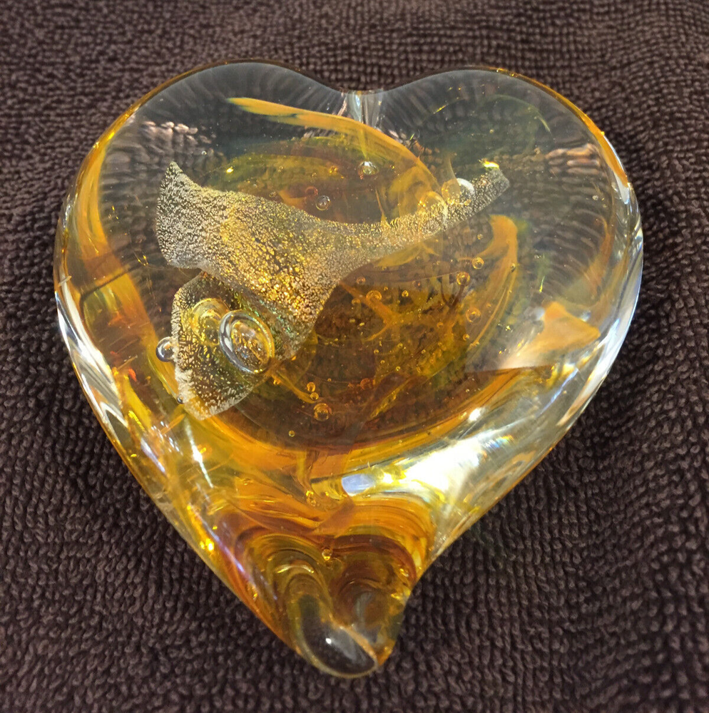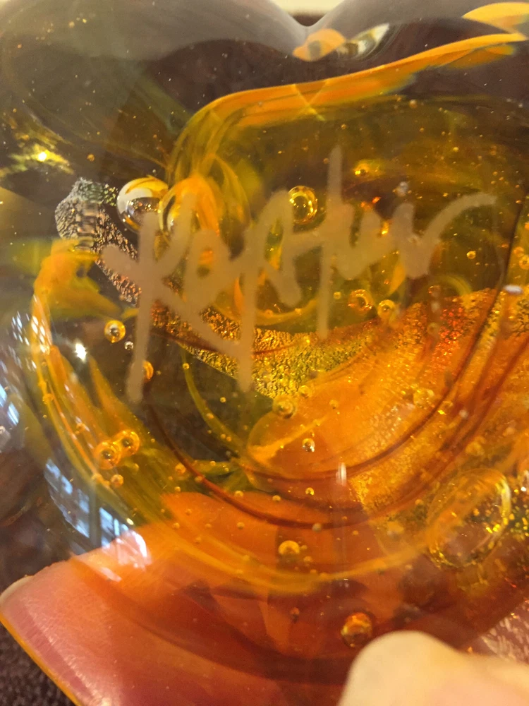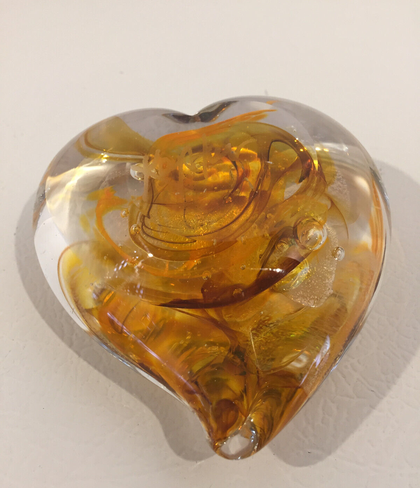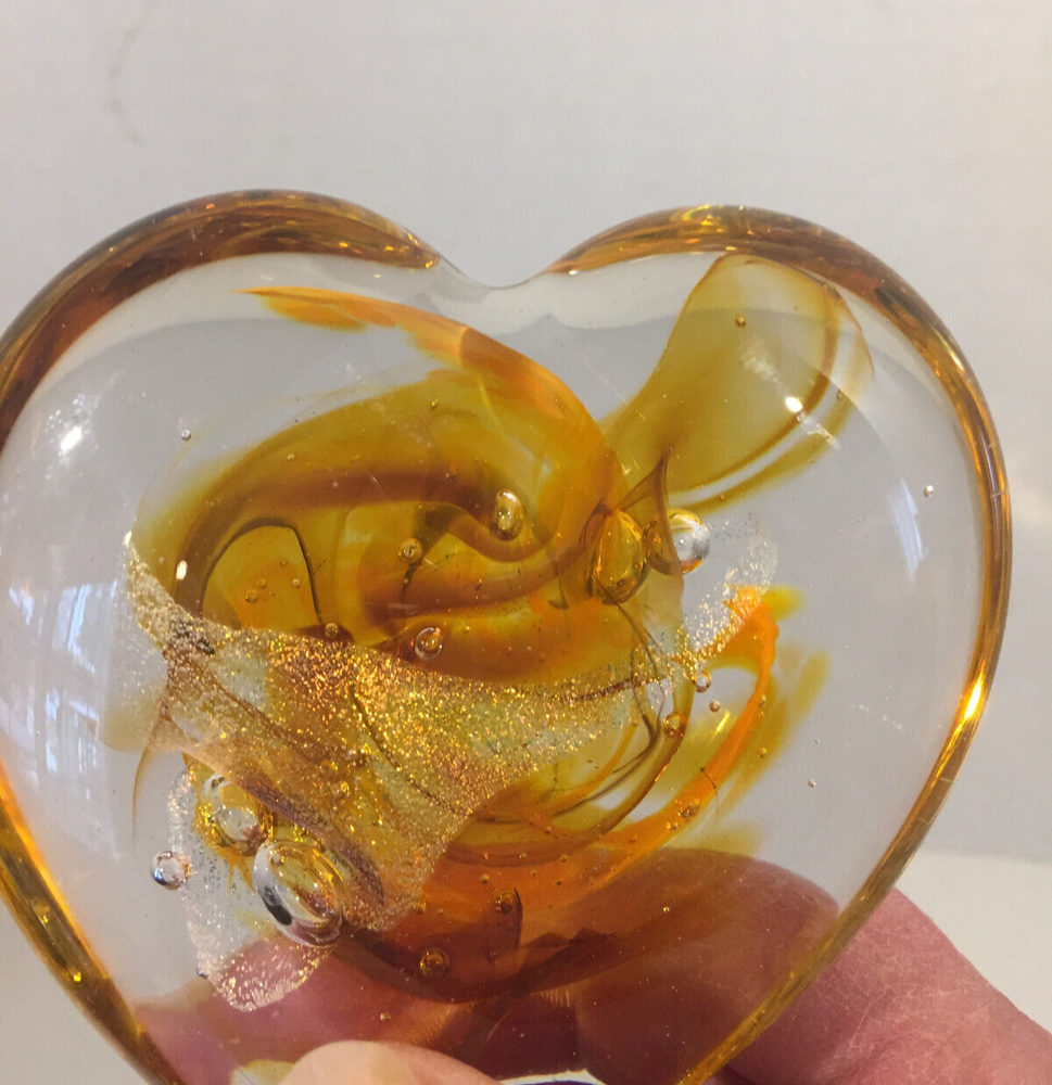 BEAUTIFUL MECHELE KAPTUR SIGNED HEART SHAPED BLOWN GLASS PAPERWEIGHT. AMBER LIGHT GOLD COLOR WITH AN IRIDESCENT WAVE DESIGN. MEASURES 4" X 4" X 1 1/2". EXCELLENT CONDITION.