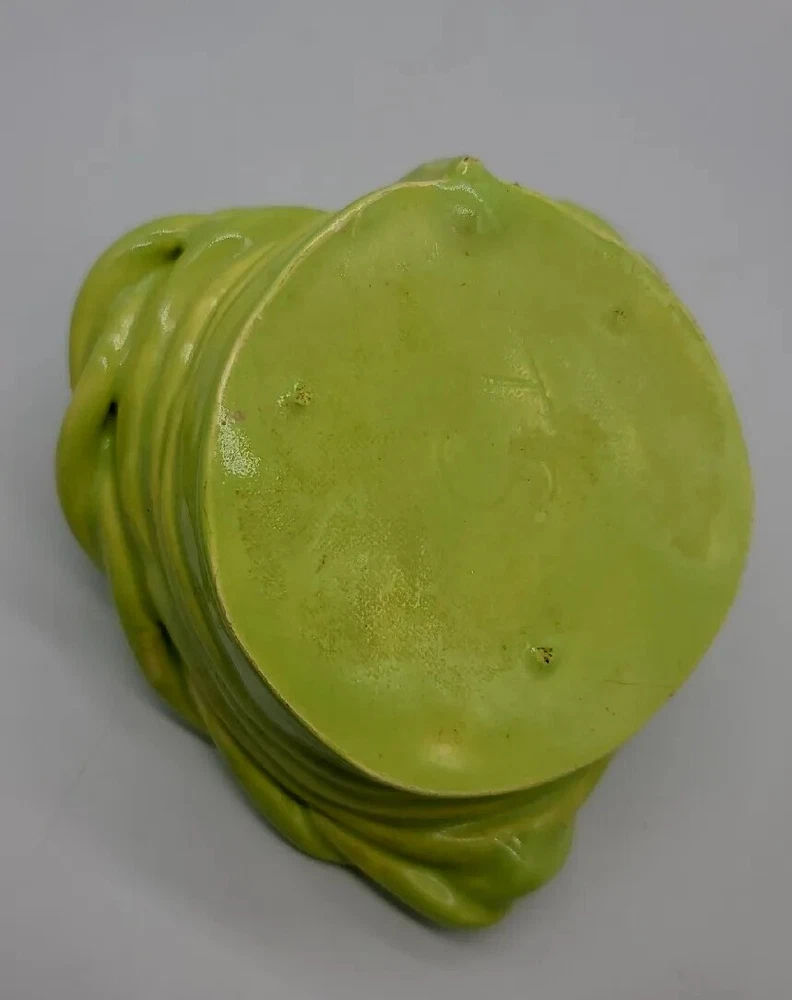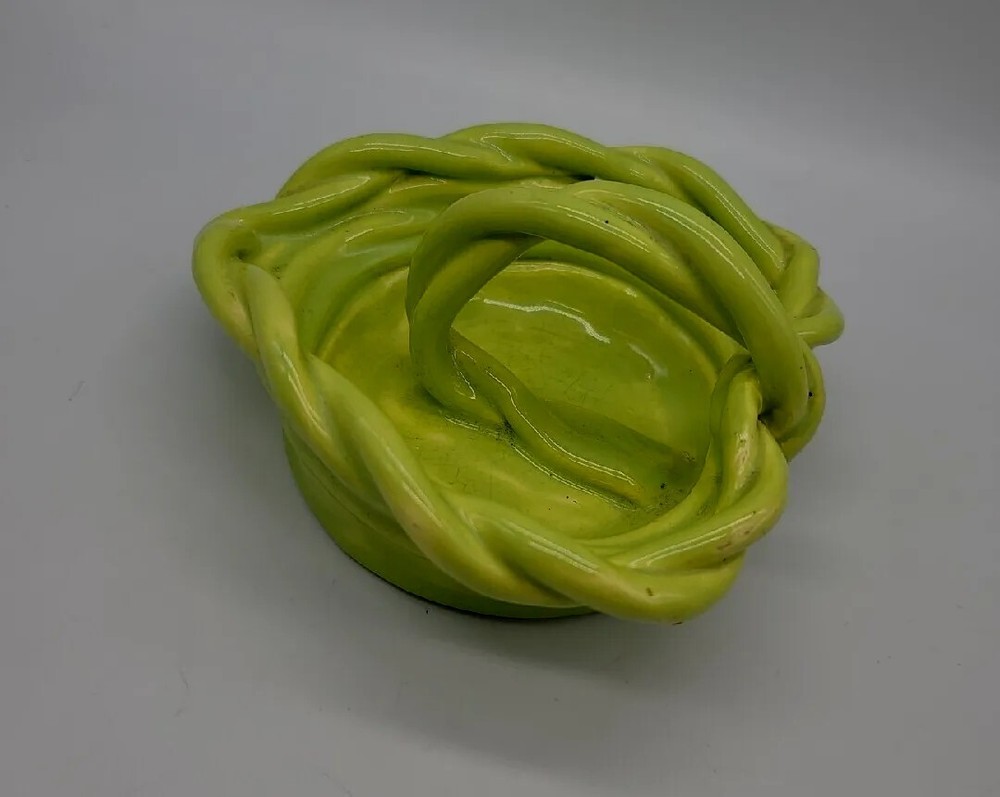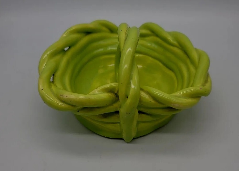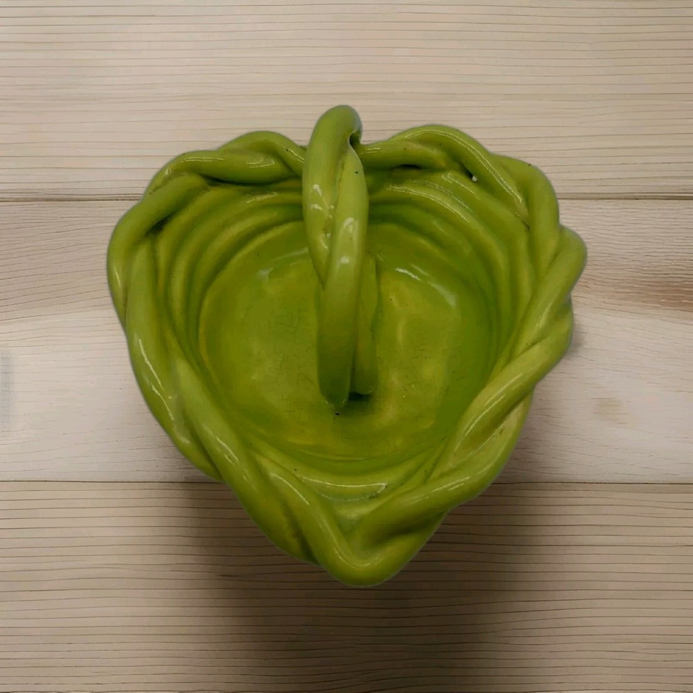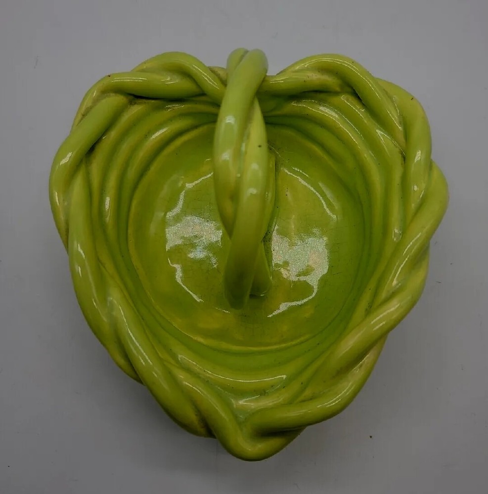 This beautiful vintage heart-shaped basket dish is a unique addition to any pottery collection. Handmade with clay and ceramic materials, this lime green piece features a glossy finish and decorative rope design. Measuring at 5.5" in length, 5" in width, and 2" in height, it is perfect for all occasions and makes a great decorative piece for any room. The item is a vintage original from the late 20th century, specifically manufactured between 1990-1999. The backstamp is impressed, and the production technique is pottery. The set includes one bowl, and the product line is rope clay ceramic. Care instructions include hand wash only. This item is perfect for those who appreciate art pottery and vintage decor.