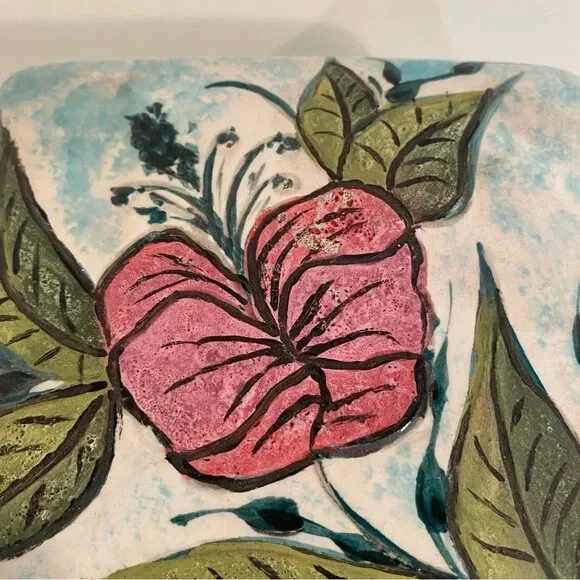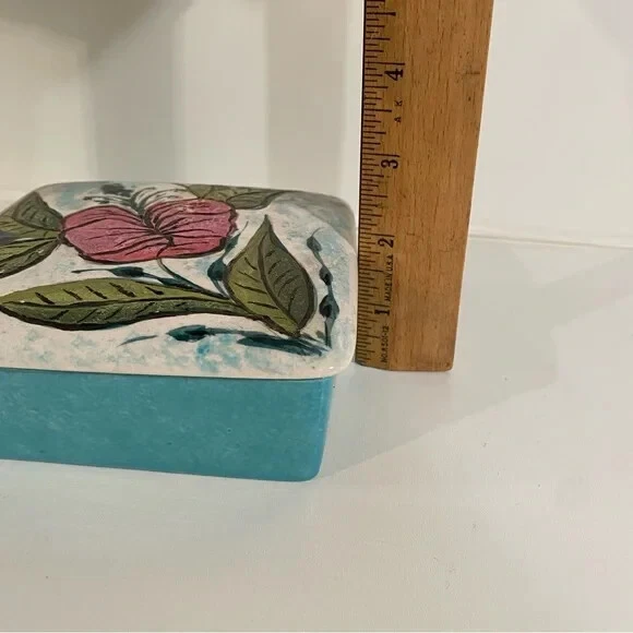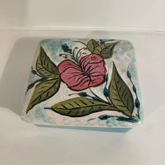 Discover a touch of elegance and nostalgia with this Vintage Studio Ceramics Trinket Box, a charming addition to any collection or decor. Adorned with handprinted florals, this small, square ceramic box measures 5 inches in length, making it perfect for storing your cherished keepsakes. The vibrant, multicolor design adds a playful yet sophisticated accent to your living space or office. It comes thoughtfully boxed, ensuring it arrives at your doorstep ready to be displayed or used. Whether for personal use or as a thoughtful gift, this trinket box is a delightful find.