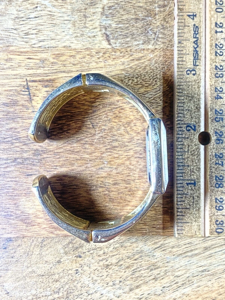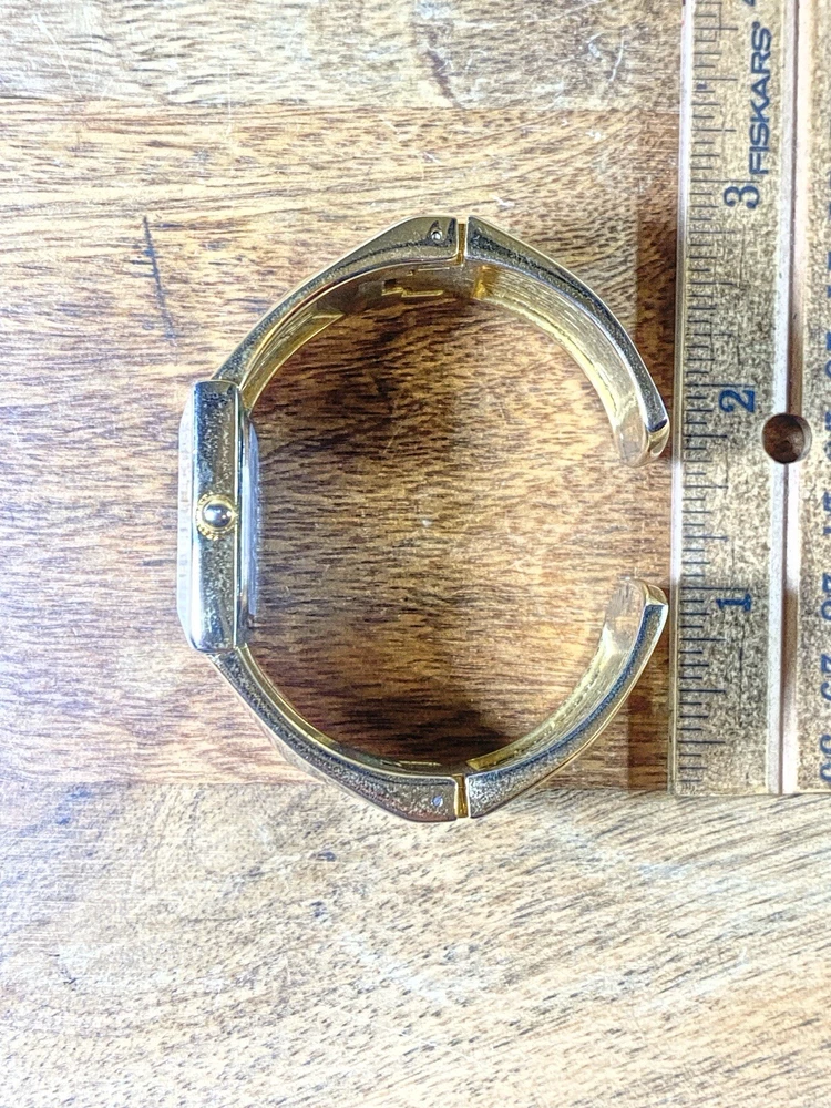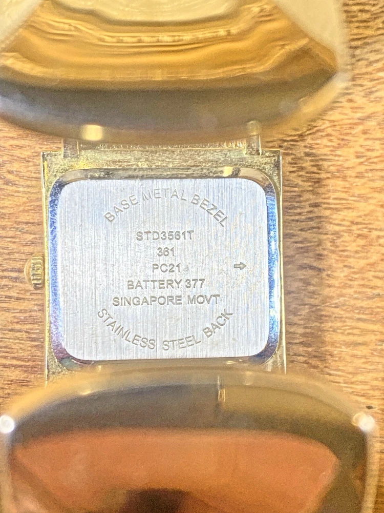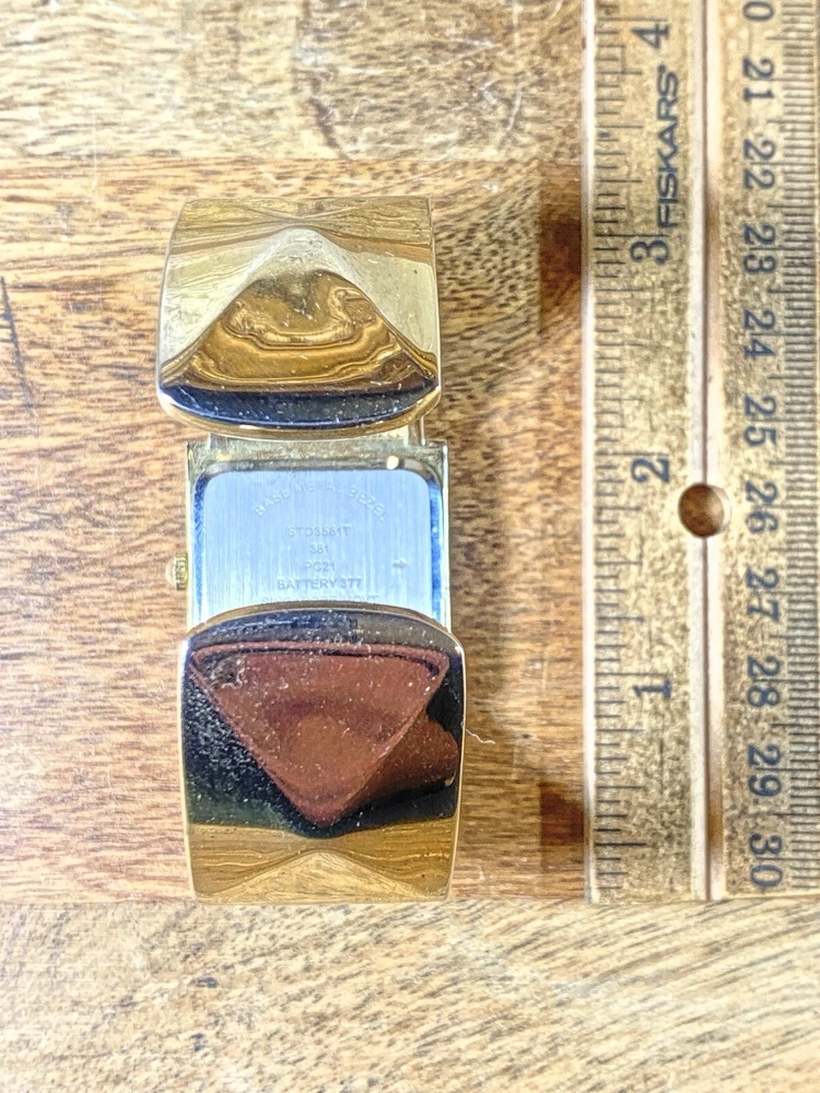 Add a touch of vintage glamour to your wrist with this stunning Studio gold ladies watch. With a square shape and an analog display, this wristwatch features a 12-hour dial, multiple hands. The watch is water-resistant and comes in a gold case, with a matching band. The bezel color is gold, and the watch is powered by a quartz movement. It is unknown when this watch was manufactured and it does not come with papers or an original box/packaging. This wristwatch is perfect for casual wear and is a great addition to any jewelry collection. The running condition of this watch is unknown, consider it for parts or repair. It may just need a battery? We have a lot of other clock related items so check out our other auctions. We do combine shipping and will always refund any excess shipping charges. Thanks for your interest and/or business. Tim