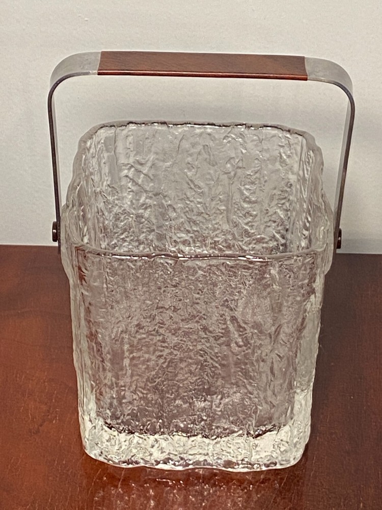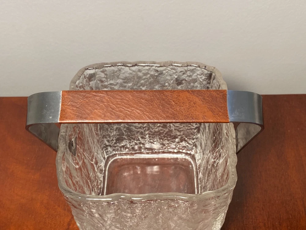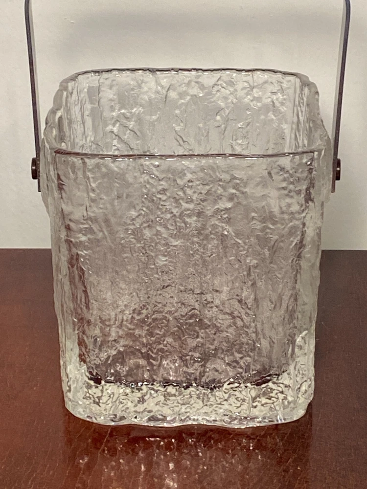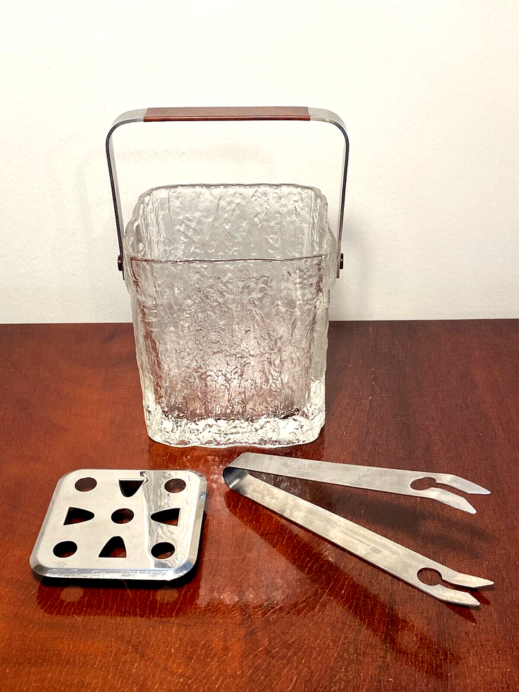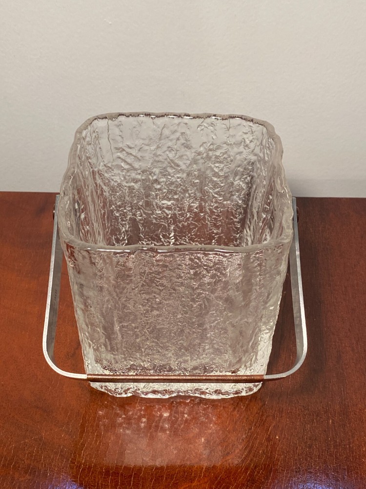Vintage Set Studio Nova by Hoya Crystal FROSTFIRE Ice Bucket & 6 Cocktail Tumblers Beautiful mid-century style ice bucket with original tongs and drip tray insert made in Japan by Hoya Crystal for Studio Nova. It is square in shape and the pattern name is "Frostfire". It has a textured frosty/iced tree-bark style exterior and is made of substantial, thick glass weighing over 3 lb. It has a bail-style stainless steel handle with brown leather trim and both handle and tongs are signed "Hoya" as shown in the last 2 photos. It measures 4.75" X 4.75" wide and is 5.25" tall (not including handle) It is in absolutely excellent & clean condition as if it were never used, with no cracks, chips or damage. Just some light scuffs, water marks on the handle of the bucket. Free Domestic Shipping! Arrives in U.S. in 5 days. International in 10 days. Check out my 100% feedback rating and feel free to e-mail me with any questions.