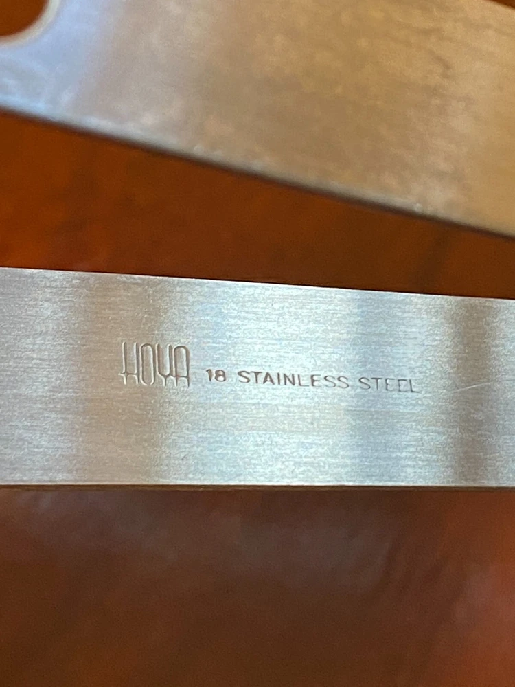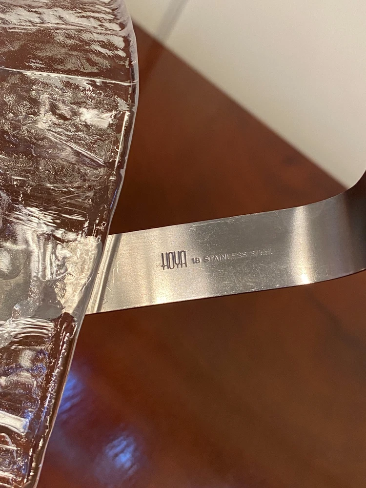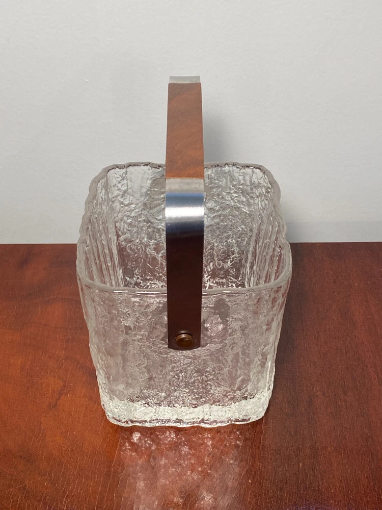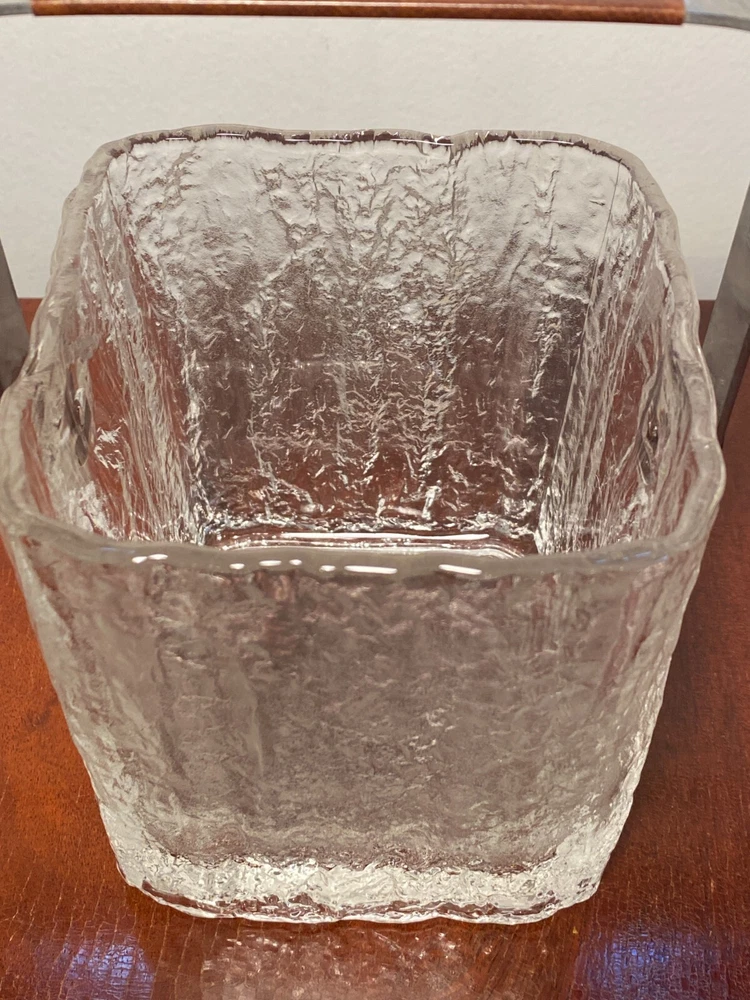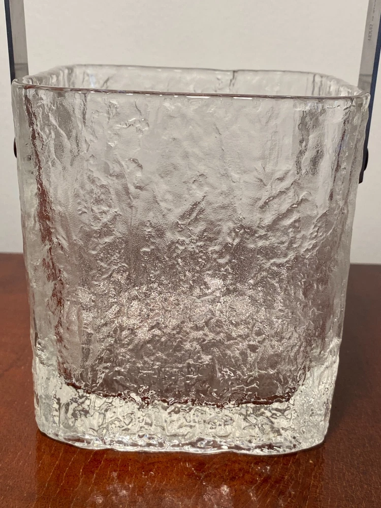 Vintage Set Studio Nova by Hoya Crystal FROSTFIRE Ice Bucket & 6 Cocktail Tumblers Beautiful mid-century style ice bucket with original tongs and drip tray insert made in Japan by Hoya Crystal for Studio Nova. It is square in shape and the pattern name is "Frostfire". It has a textured frosty/iced tree-bark style exterior and is made of substantial, thick glass weighing over 3 lb. It has a bail-style stainless steel handle with brown leather trim and both handle and tongs are signed "Hoya" as shown in the last 2 photos. It measures 4.75" X 4.75" wide and is 5.25" tall (not including handle) It is in absolutely excellent & clean condition as if it were never used, with no cracks, chips or damage. Just some light scuffs, water marks on the handle of the bucket. Free Domestic Shipping! Arrives in U.S. in 5 days. International in 10 days. Check out my 100% feedback rating and feel free to e-mail me with any questions.