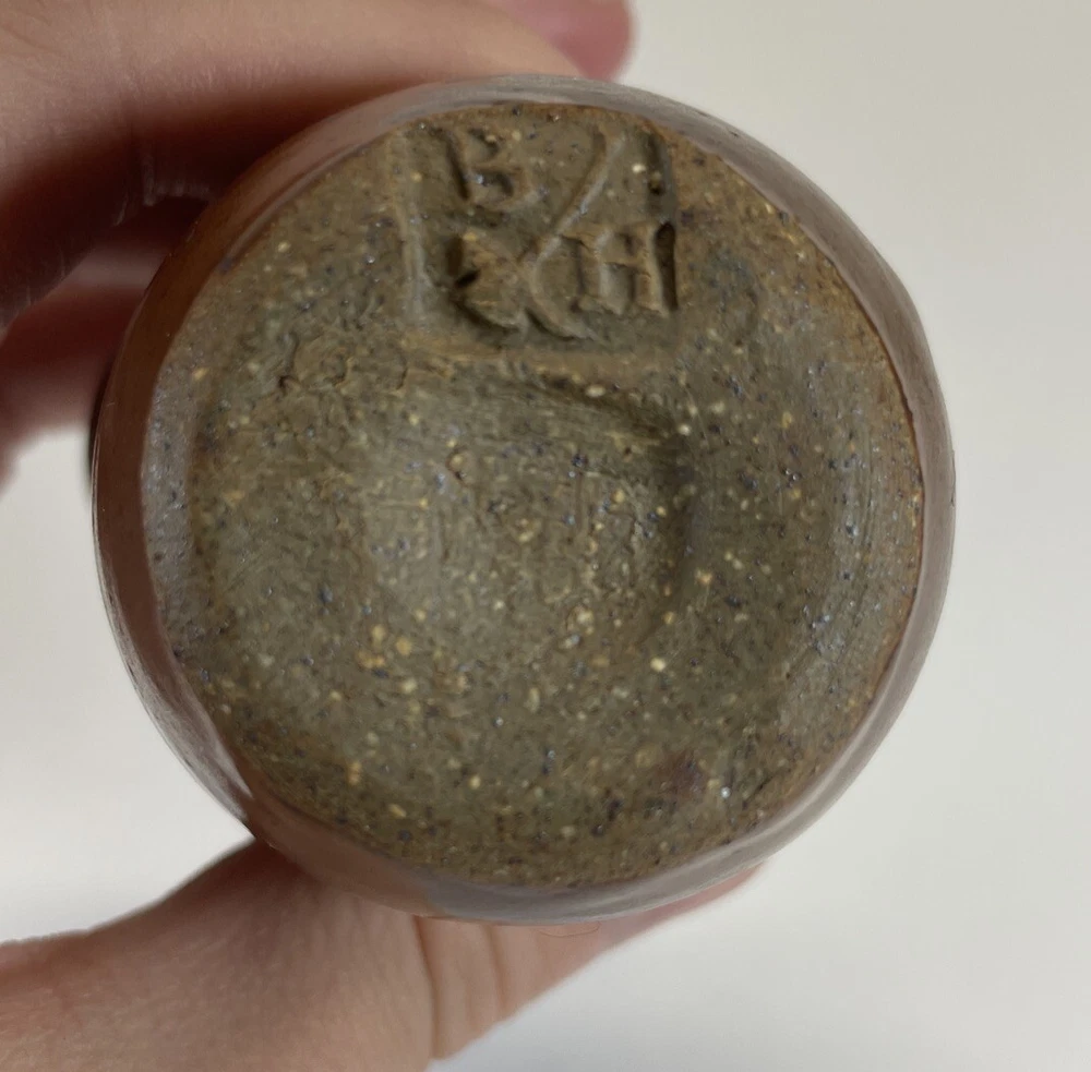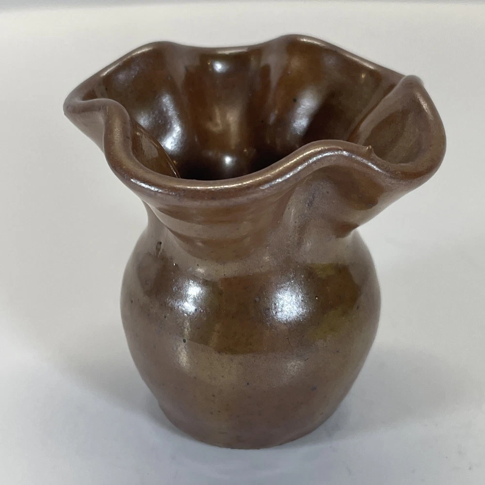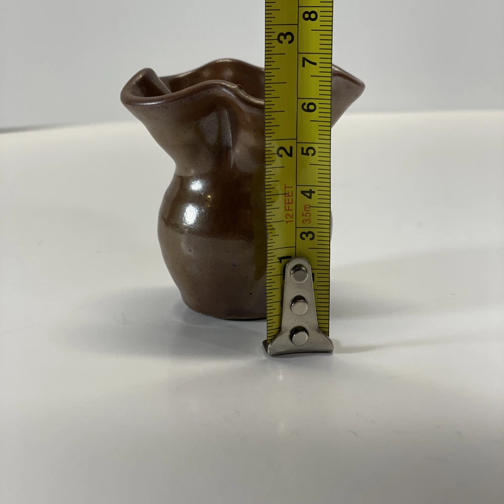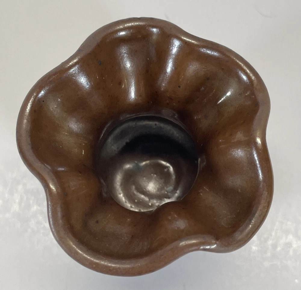 This vintage studio pottery vase is a unique addition to any collection. The brown color and flower-shaped top make it a charming piece for any home decor. It stands at 2.5 inches tall and is signed by the artist BH. The vase is an original piece and has an impressed backstamp. The material is clay and it was produced using the pottery technique. This small vase is perfect for displaying your favorite flowers or as a standalone decorative item. Good condition. No cracks or chips.